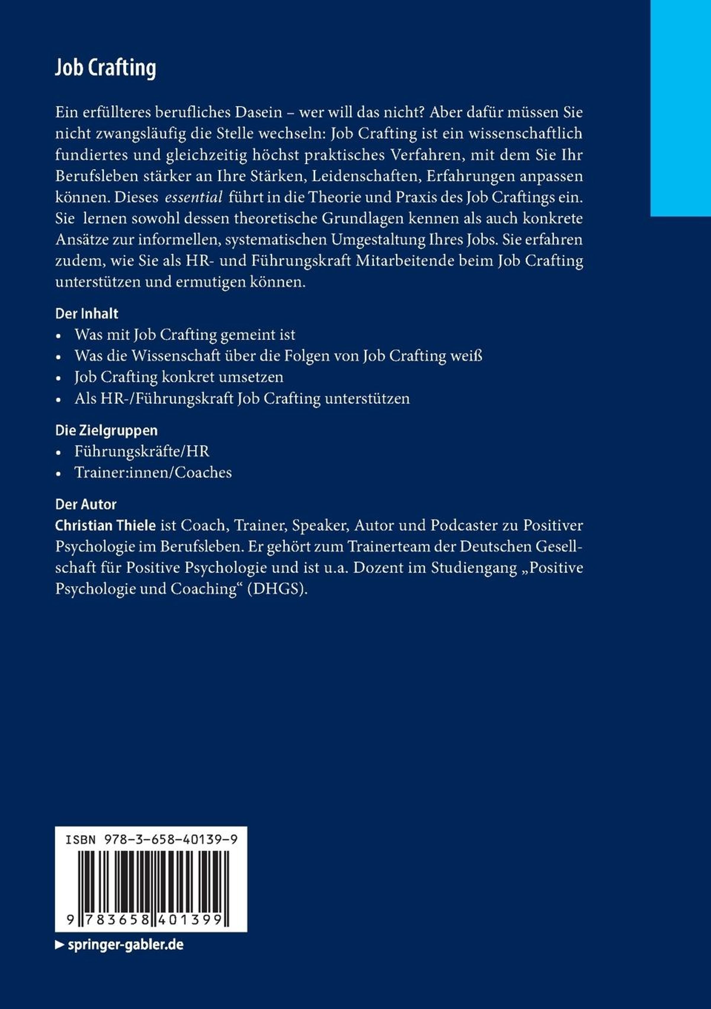 Ein erfüllteres berufliches Dasein - wer will das nicht? Aber dafür müssen Sie nicht zwangsläufig die Stelle wechseln: Job Crafting ist ein wissenschaftlich fundiertes und gleichzeitig höchst praktisches Verfahren, mit dem Sie Ihr Berufsleben stärker an Ihre Stärken, Leidenschaften, Erfahrungen anpassen können. Dieses essential führt in die Theorie und Praxis des Job Craftings ein. Sie lernen sowohl dessen theoretische Grundlagen kennen als auch konkrete Ansätze zur informellen, systematischen Umgestaltung Ihres Jobs. Sie erfahren zudem, wie Sie als HR- und Führungskraft Mitarbeitende beim Job Crafting unterstützen und ermutigen können.