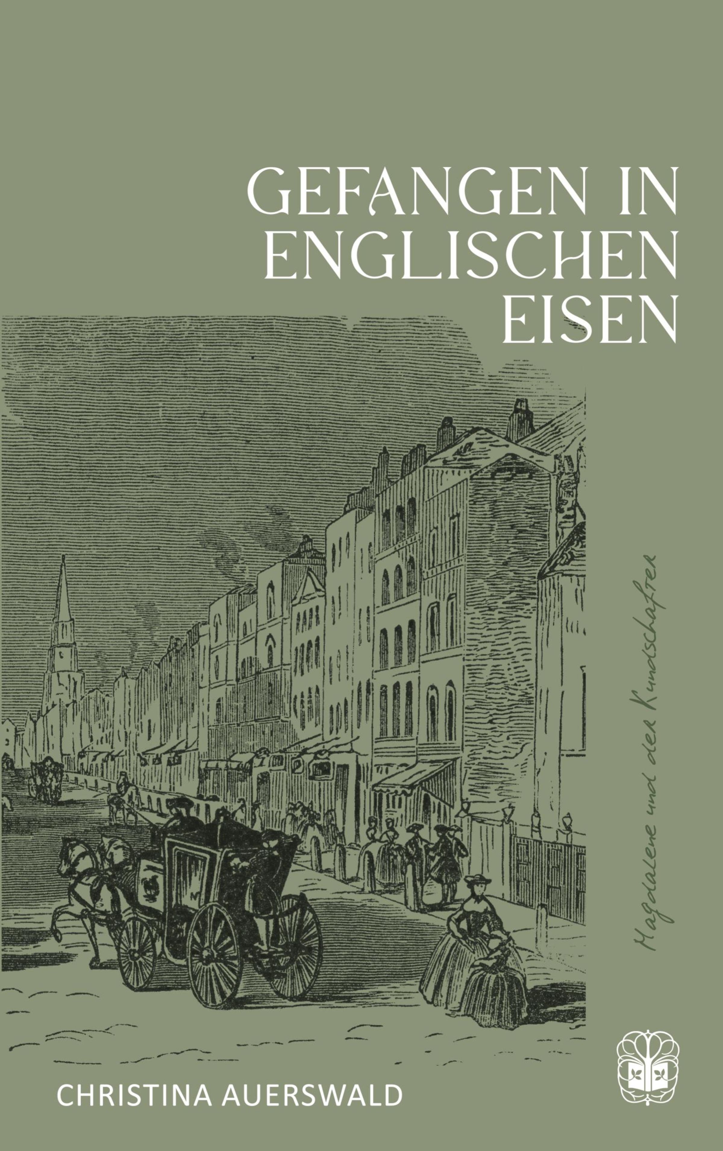 „GEFANGEN IN ENGLISCHEN EISEN“, Illustration einer historischen Straßenszene. Name: CHRISTINA AUERSWALD., Buch