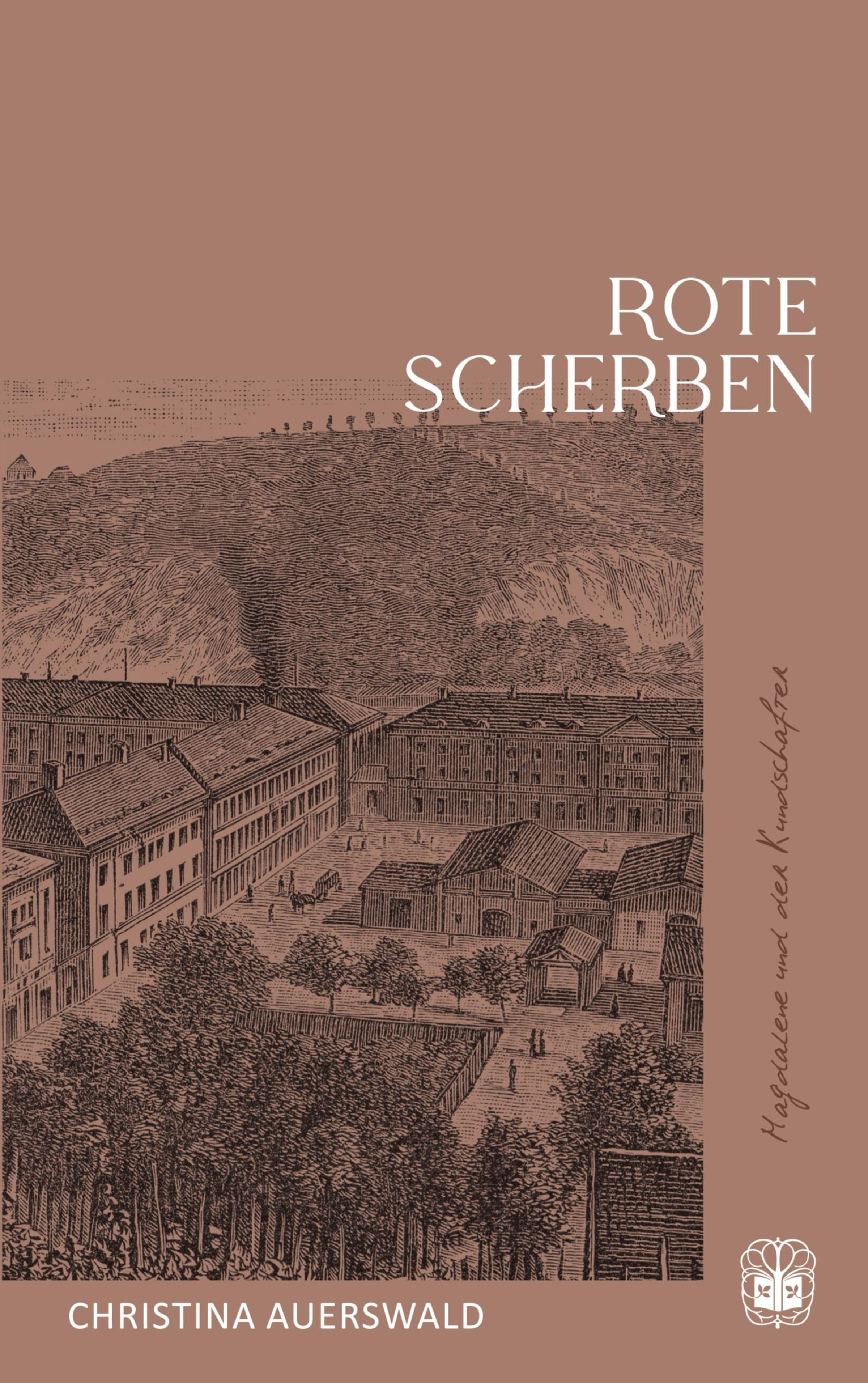 "ROTE SCHERBEN" und "CHRISTINA AUERSWALD" mit Zeichnung eines Gebäudekomplexes und Logo unten rechts., Buch
