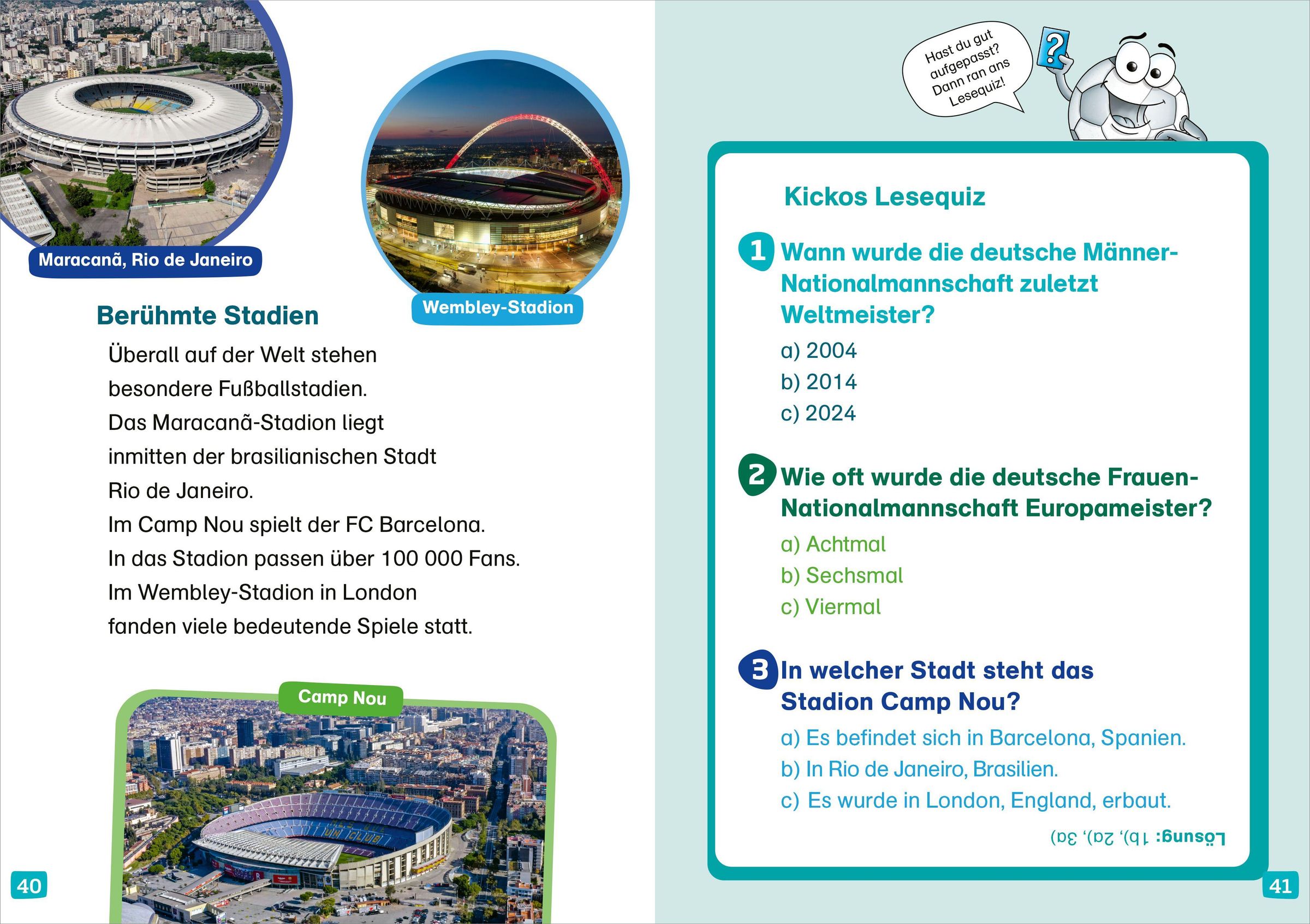 Hier kommt geballtes Fußballwissen für Erstleserinnen und Erstleser! Welche Ausrüstung braucht man, welche Taktiken gibt es und wie wird man eigentlich Fußballprofi? Antworten auf all diese und viele weitere Fragen rund um den Lieblingssport vieler Kinder gibt es hier zum Selberlesen. Kurze, verständliche Texte, große Fibelschrift und viele beeindruckende Fotos sorgen für Motivation und fördern so die Lesekompetenz und das Textverständnis. Geeignet für Fußballfans ab Lesestufe 2.
