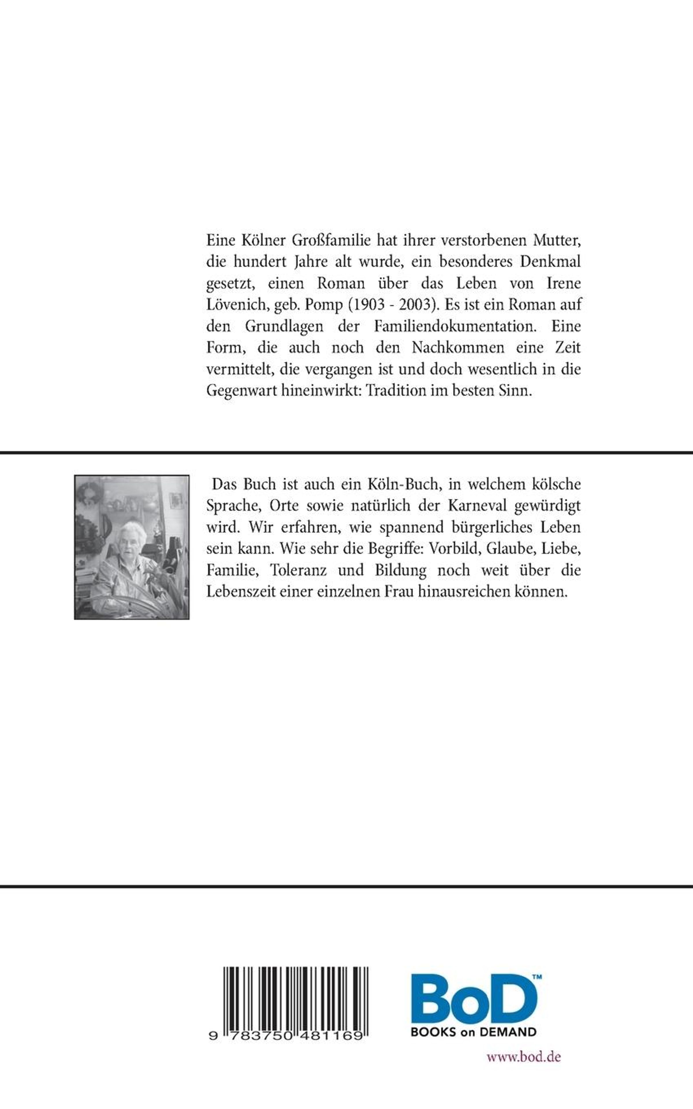 Wie dieses Buch entstand: Eine Kölner Großfamilie hat ihrer verstorbenen Mutter, die hundert Jahre alt wurde, ein besonderes Denkmal gesetzt: einen Roman über Ihr Leben. Es ist ein Roman auf den Grundlagen einer Familiendokumentation. Eine Form, die auch noch den Nachkommen eine Zeit vermittelt, die vergangen ist und doch wesentlich in die Gegenwart hineinwirkt: Tradition im besten Sinn. Das Buch ist auch ein Köln-Buch, in welchem kölsche Sprache, Orte, sowie natürlich der Karneval gewürdigt werden.