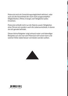 Potenzial wird als Entwicklungsmöglichkeit definiert, oder auch als die Gesamtheit der noch nicht ausgeschöpften Möglichkeiten, Mittel, Energie und Fähigkeiten jedes Einzelnen. Potenzial schließt nicht nur die Talente sowie Fähigkeiten einer Person ein sondern auch die Lebensumstände, in denen sie sich gerade befindet. Dieser kleine Ratgeber zeigt anhand realer und lebendiger Beispiele auf, wie man sein Potenzial voll nutzen kann und welche Fehler dabei besser vermieden werden sollten. "Es war mir sehr wichtig, nicht nur einen trockenen Ratgeber zu schreiben sondern auch anschauliche Beispiele einzufügen die aus dem realen Leben stammen und motivieren und auflockern sollen", so die Autorin.