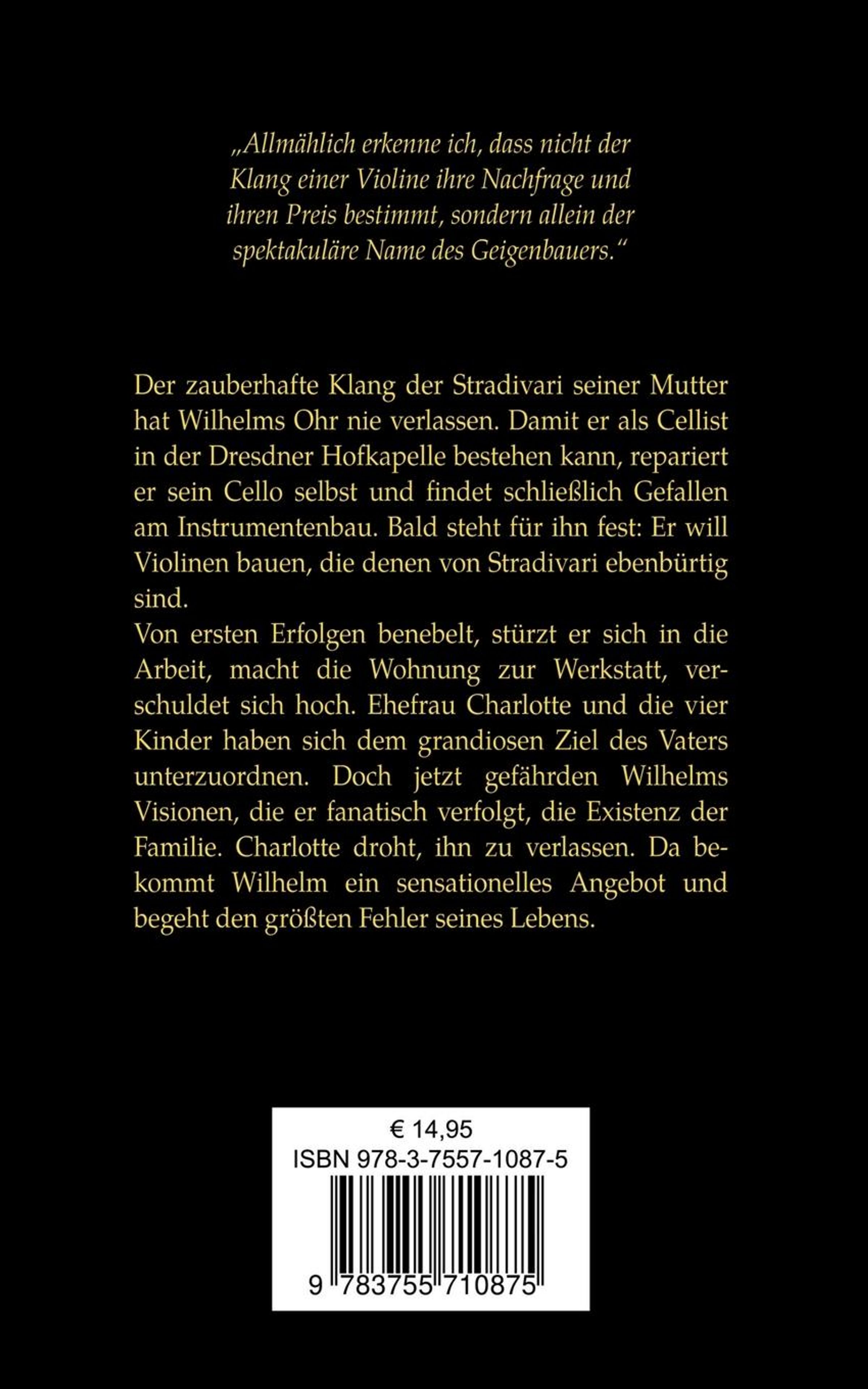 Der zauberhafte Klang der Stradivari seiner Mutter hat Wilhelms Ohr nie verlassen. Damit er als Cellist in der Dresdner Hofkapelle bestehen kann, repariert er sein Cello selbst und findet schließlich Gefallen am Instrumentenbau. Bald steht für ihn fest: Er will Violinen bauen, die denen von Stradivari ebenbürtig sind. Von ersten Erfolgen benebelt, stürzt er sich in die Arbeit, macht die Wohnung zur Werkstatt, verschuldet sich hoch. Ehefrau Charlotte und die vier Kinder haben sich dem grandiosen Ziel des Vaters unterzuordnen. Doch jetzt gefährden Wilhelms Visionen, die er fanatisch verfolgt, die Existenz der Familie. Charlotte droht, ihn zu verlassen. Da bekommt Wilhelm ein sensationelles Angebot und begeht den größten Fehler seines Lebens.
