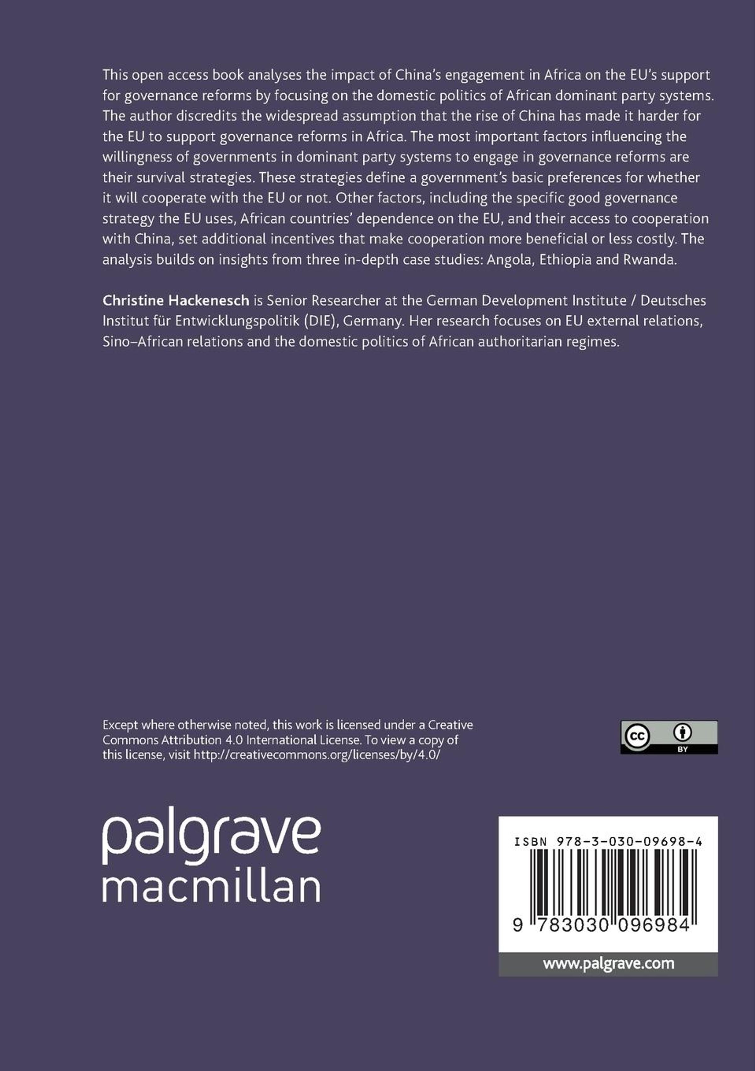This open access book analyses the domestic politics of African dominant party regimes, most notably African governments¿ survival strategies, to explain their variance of opinions and responses towards the reforming policies of the EU. The author discredits the widespread assumption that the growing presence of China in Africa has made the EU¿s task of supporting governance reforms difficult, positing that the EU¿s good governance strategies resonate better with the survival strategies of governments in some dominant party regimes more so than others, regardless of Chinese involvement. Hackenesch studies three African nations ¿ Angola, Ethiopia and Rwanda ¿ which all began engaging with the EU on governance reforms in the early 2000s. She argues that other factors generally identified in the literature, such as the EU good governance strategies or economic dependence of the target country on the EU, have set additional incentives for African governments to not engage on governance reforms.