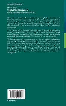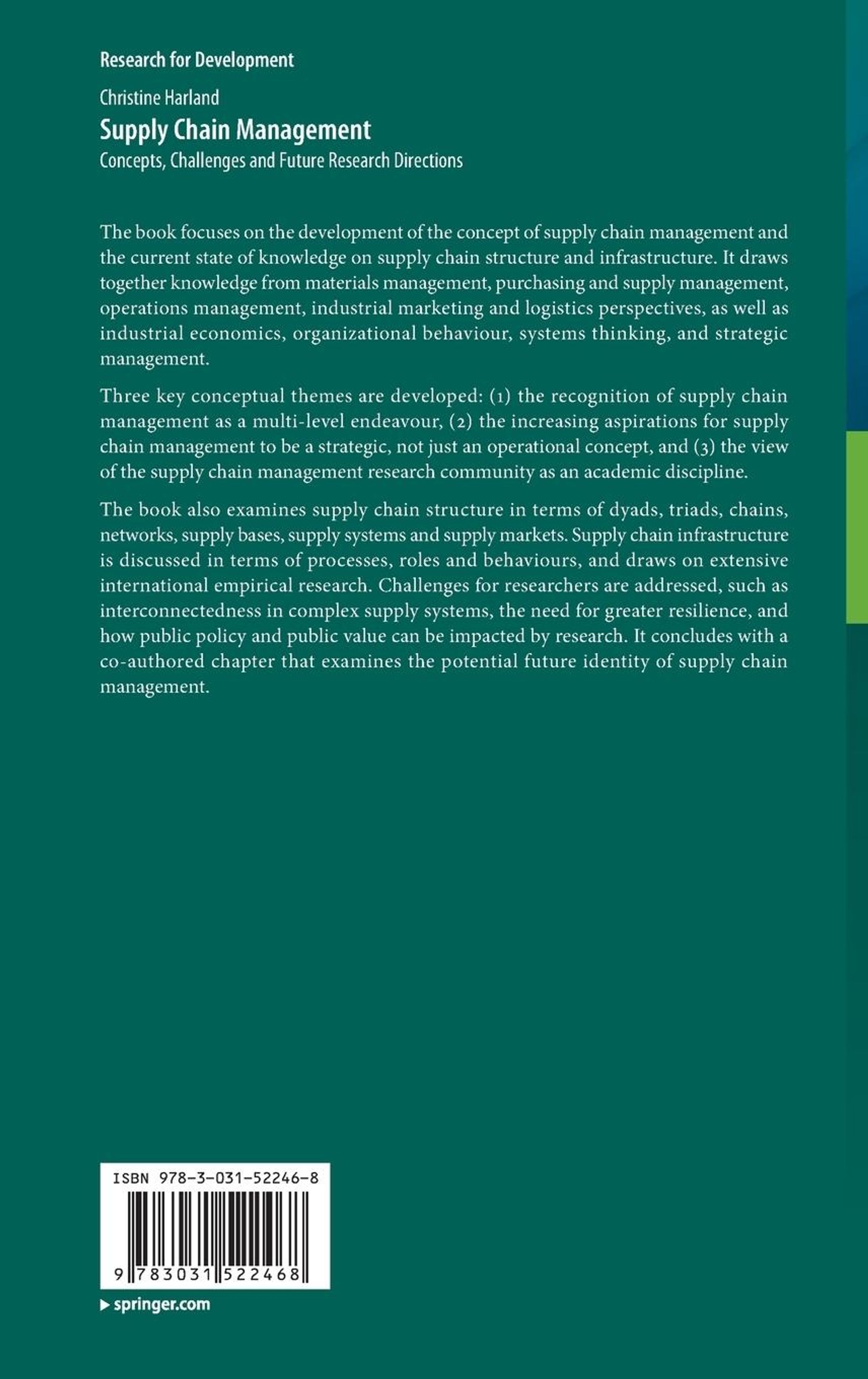 The book focuses on the development of the concept of supply chain management and the current state of knowledge on supply chain structure and infrastructure. It draws together knowledge from materials management, purchasing and supply management, operations management, industrial marketing and logistics perspectives, as well as industrial economics, organizational behaviour, systems thinking, and strategic management. Three key conceptual themes are developed: (1) the recognition of supply chain management as a multi-level endeavour, (2) the increasing aspirations for supply chain management to be a strategic, not just an operational concept, and (3) the view of the supply chain management research community as an academic discipline. The book also examines supply chain structure in terms of dyads, triads, chains, networks, supply bases, supply systems and supply markets. Supply chain infrastructure is discussed in terms of processes, roles and behaviours, and draws on extensive international empirical research. Challenges for researchers are addressed, such as interconnectedness in complex supply systems, the need for greater resilience, and how public policy and public value can be impacted by research. It concludes with a co-authored chapter that examines the potential future identity of supply chain management.