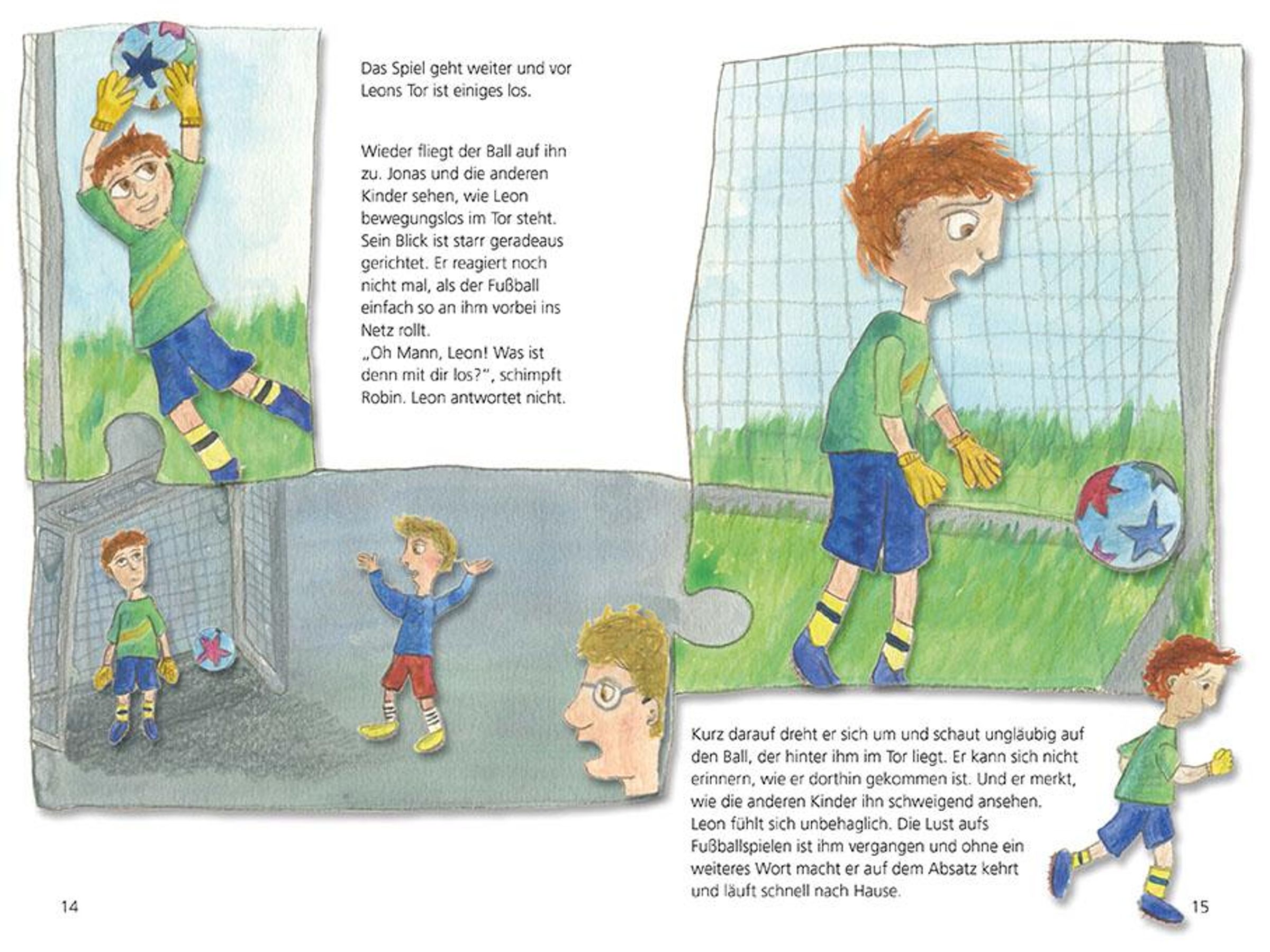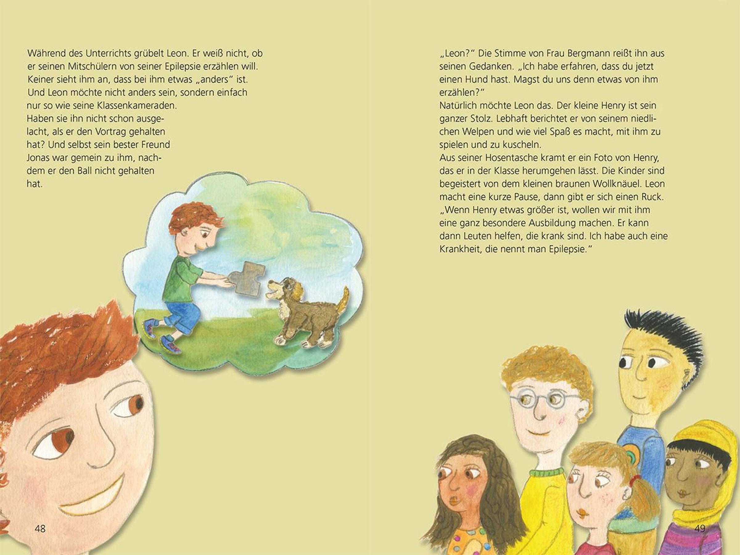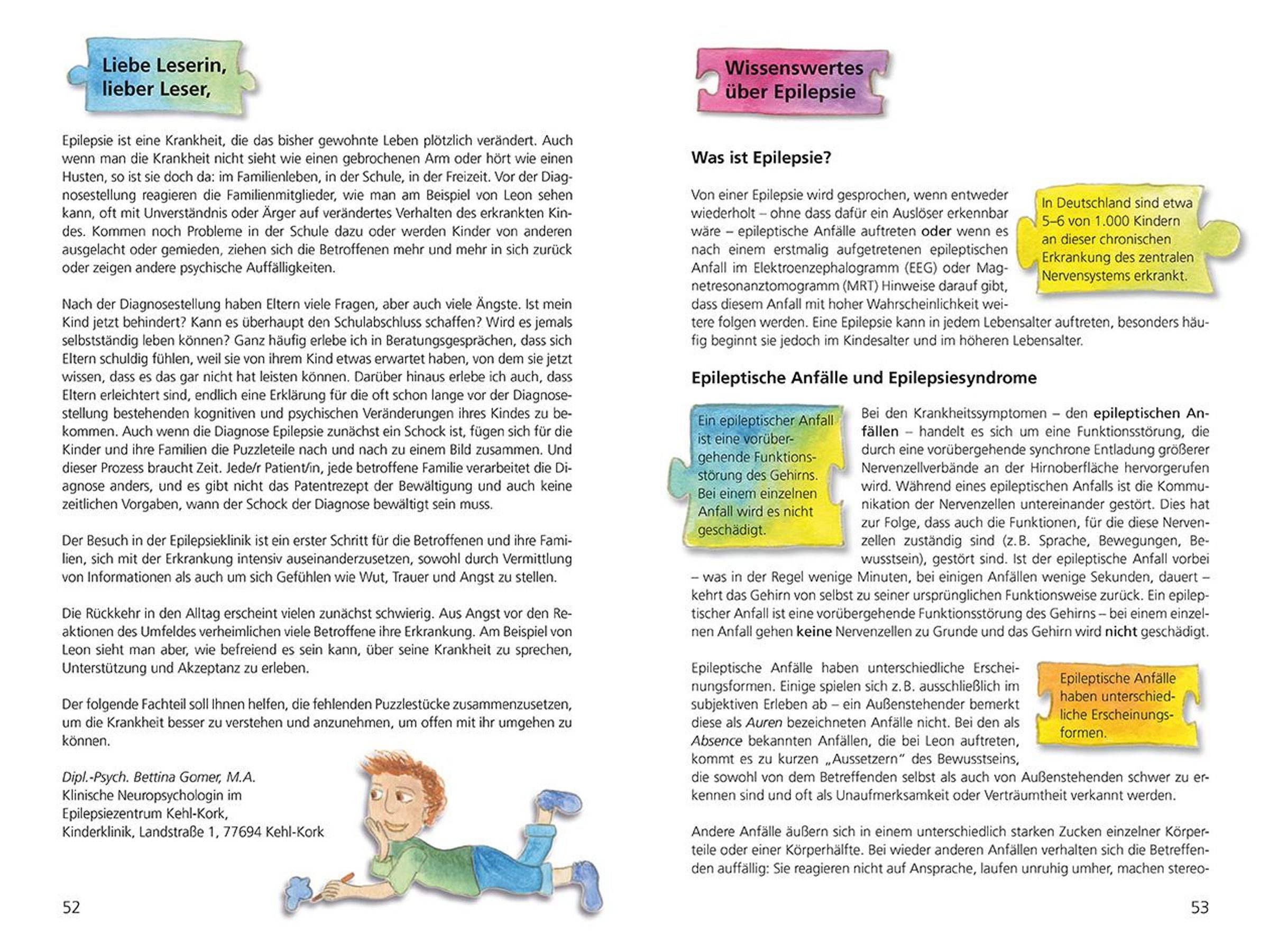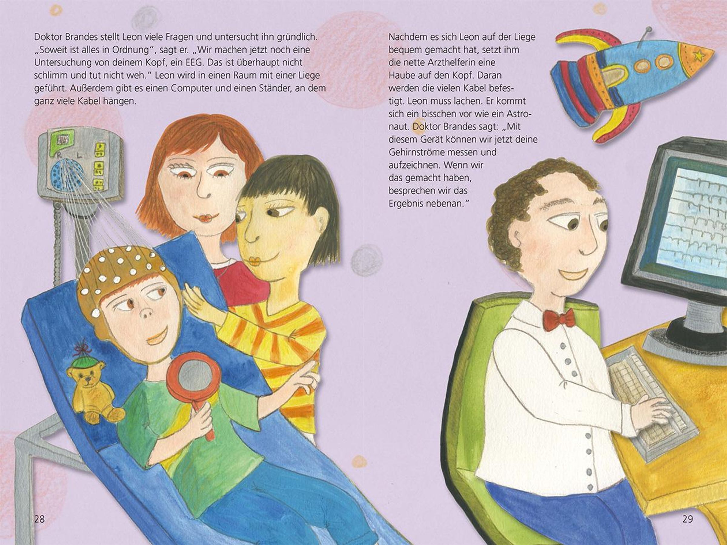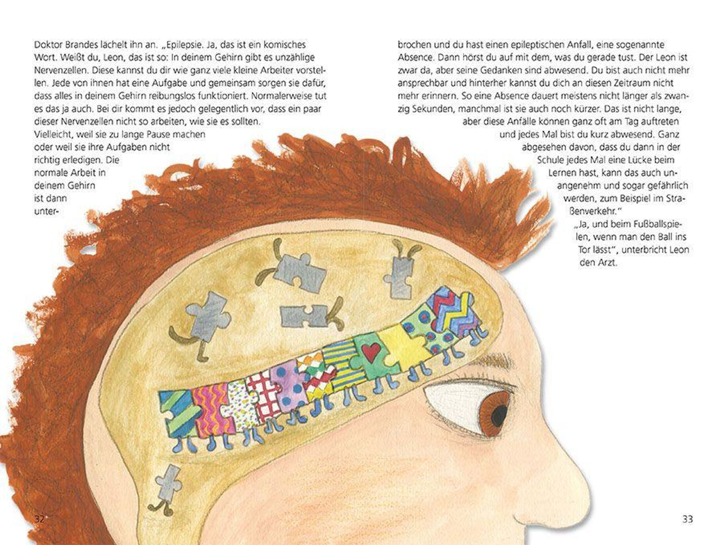 Als Leon gerade ein Referat über Hunde hält, steht er plötzlich bewegungslos und mit starrem Blick da. Seine Lehrerin und Mitschüler wundern sich, doch nach ein paar Sekunden spricht Leon einfach weiter. Er selbst hat von seinem Aussetzer nichts mitbekommen und merkt nur, dass ihn alle so komisch anschauen. Weil auch seinen Eltern aufgefallen ist, dass Leon sehr häufig vor sich hinträumt, gehen sie mit ihm zum Arzt. Und der kann Leon endlich sagen, was los ist: Er hat Epilepsie. Bei der Absence-Epilepsie, von der Leon betroffen ist, handelt es sich um die häufigste Epilepsieform bei Kindern und Jugendlichen. Im Fachteil, der an die Bildergeschichte anschließt, erläutern Norbert van Kampen und Eva Breuer vom Epilepsie-Zentrum Berlin-Brandenburg Wissenswertes für Eltern und ErzieherInnen: Welche Epilepsieformen gibt es und wie werden sie diagnostiziert? Wie wird Epilepsie behandelt? Und wie verhalte ich mich bei einem Anfall?