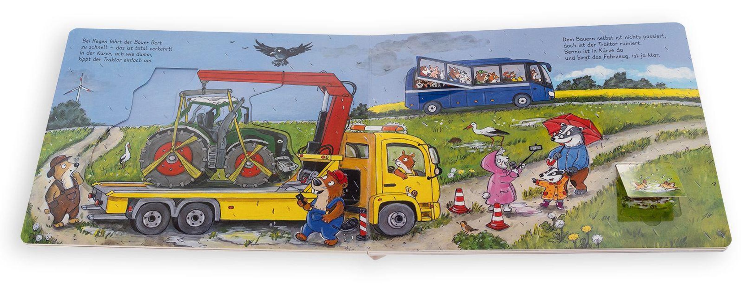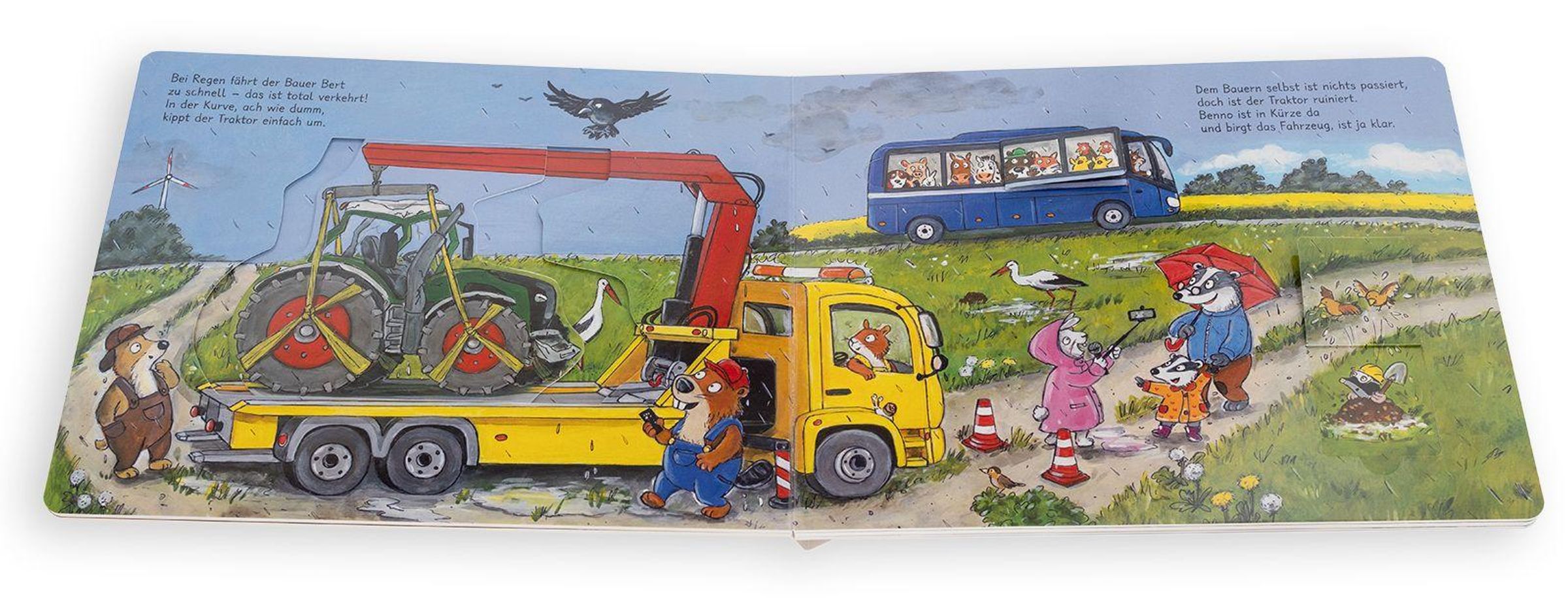 Da sind sie alle: Bauer Bert mit seinem Traktor , Emil Wildschwein mit der Walze , Greta Gans mit dem Polizeiauto und Kater Kalle mit seinem Feuerwehrauto . Doch die Fahrzeuge haben auf der Straße eine Panne . An der Walze platzt der Reifen , der Traktor kippt aus der Kurve, das Polizeiauto verliert Öl und der Motor des Feuerwehrautos fängt tatsächlich an zu qualmen. Kein Problem für Benno Biber ! Der kommt mit seinem Abschleppwagen und bringt alle kaputten Fahrzeuge zur Autowerkstattvon Freddy Fuchs.