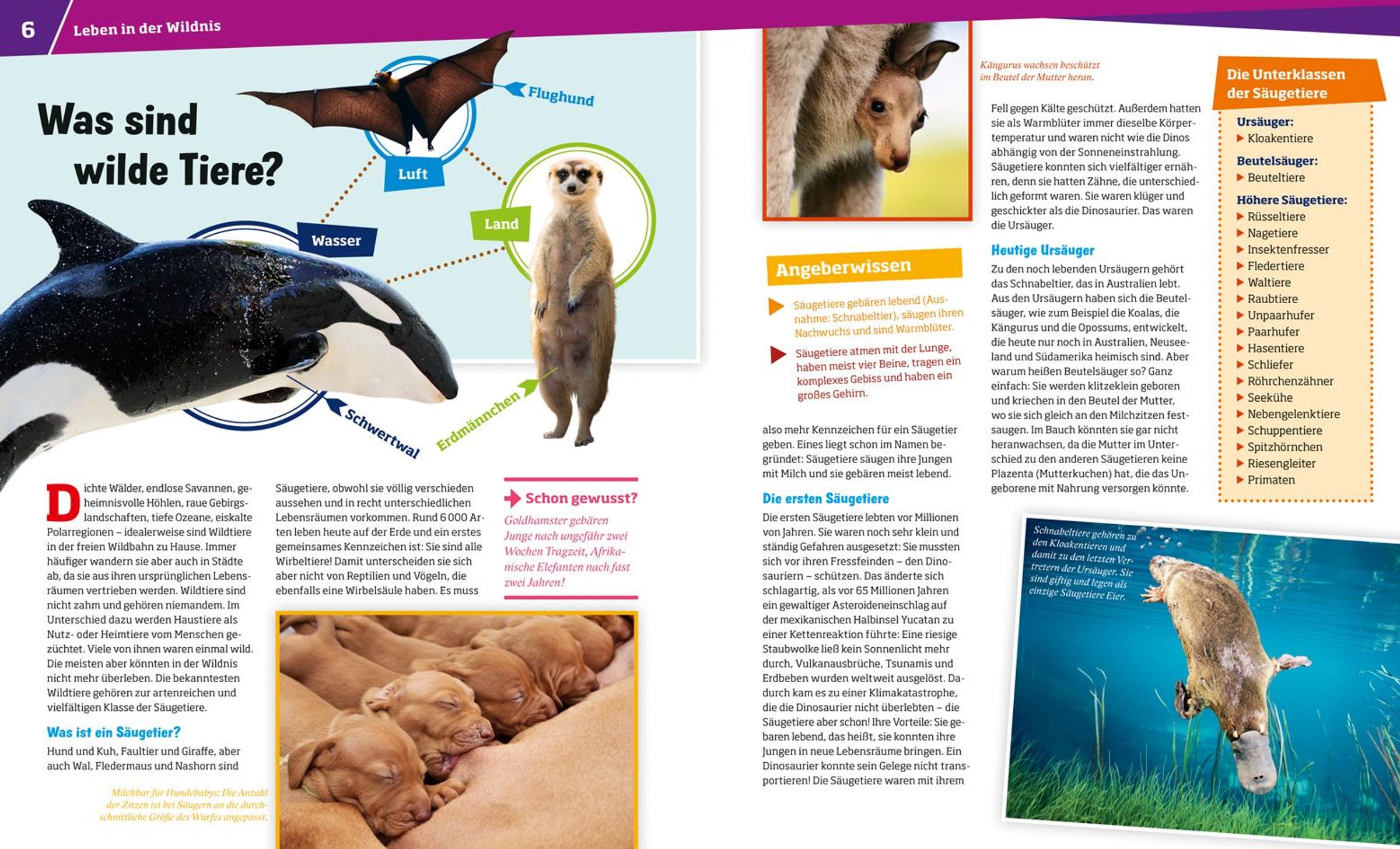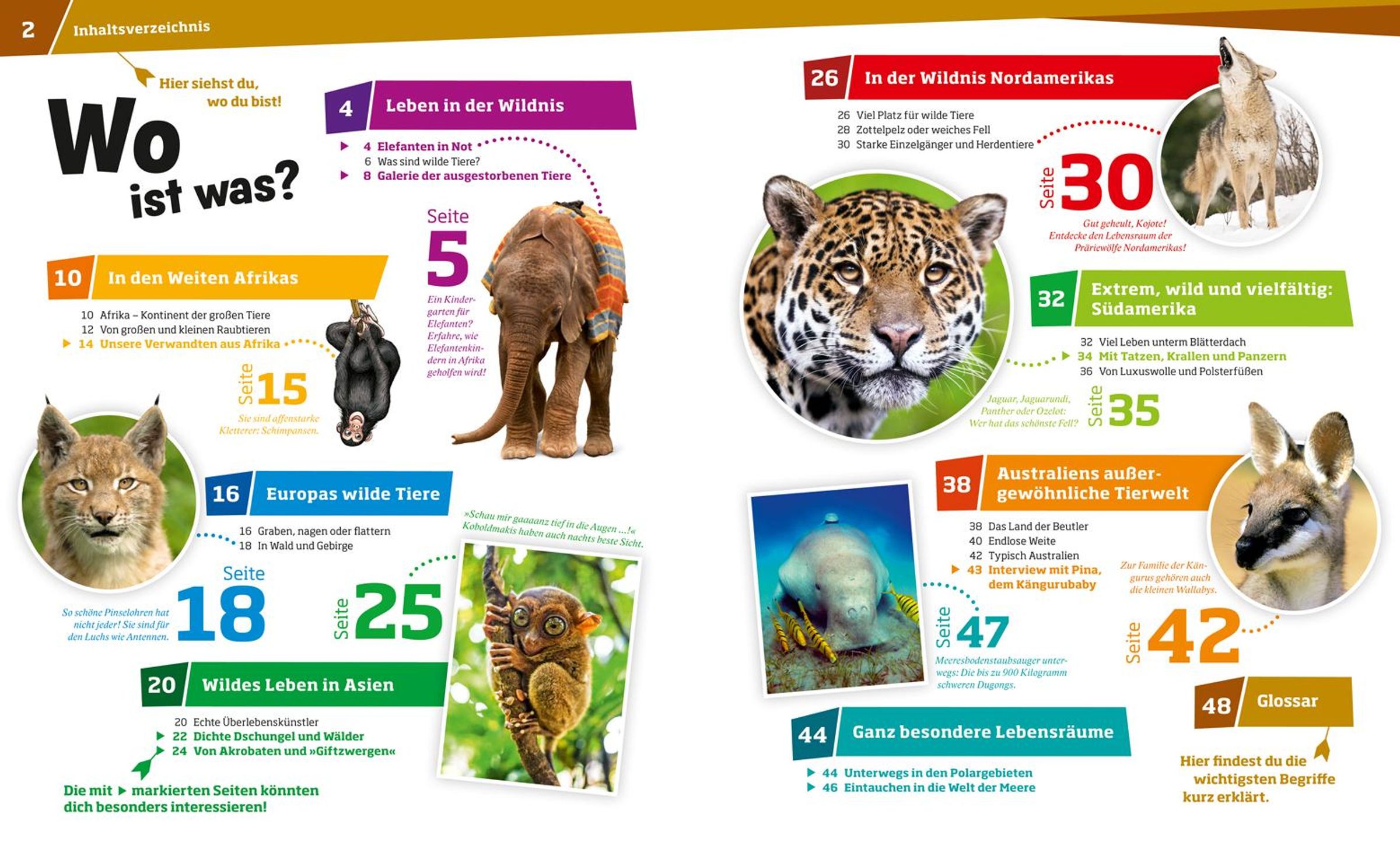 Wüsten und Steppen, Dschungel und Regenwald, Polargebiete und Ozeane - wilde Tiere leben rund um den Erdball. Lautlos schleicht der Leopard durch den dichten Dschungel Afrikas. Schaurig-schön klingt das Heulen der australischen Dingos. Und die Gibbons hangeln sich in den Regenwäldern Asiens von Ast zu Ast. So bunt die Arten selbst sind, so vielfältig und spannend sind die Mythen und Märchen, die Rekorde und Forschungen.