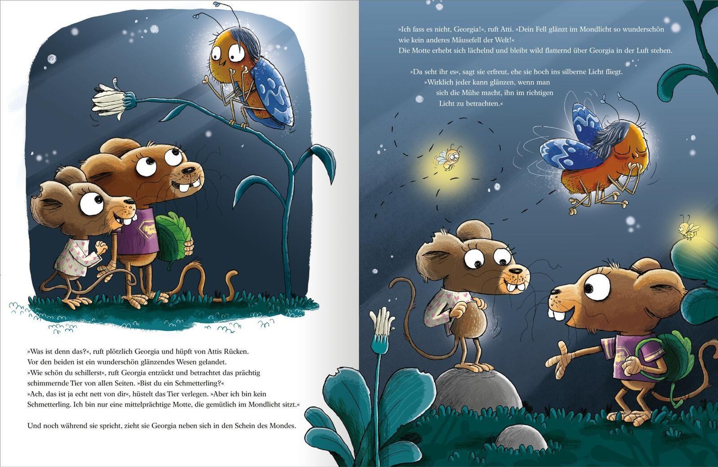 Auf einem goldenen Feld leben die zwei ungleichen Mäuseschwestern Georgia und Atti. Während Georgia schüchtern und unsicher ist, sprudelt Atti nur so vor Energie - doch beide fühlen sich nicht wirklich akzeptiert. Gemeinsam wagen sie ein nächtliches Abenteuer, das alles verändert: Sie lernen von einem trampelnden Pony, einer schimmernden Motte, einer eleganten Eule und einem mutigen Igel, dass man genau richtig ist, so wie man ist. Ein liebevoll erzähltes Bilderbuch über Selbstakzeptanz, Mut und die Kraft der Geschwisterliebe.