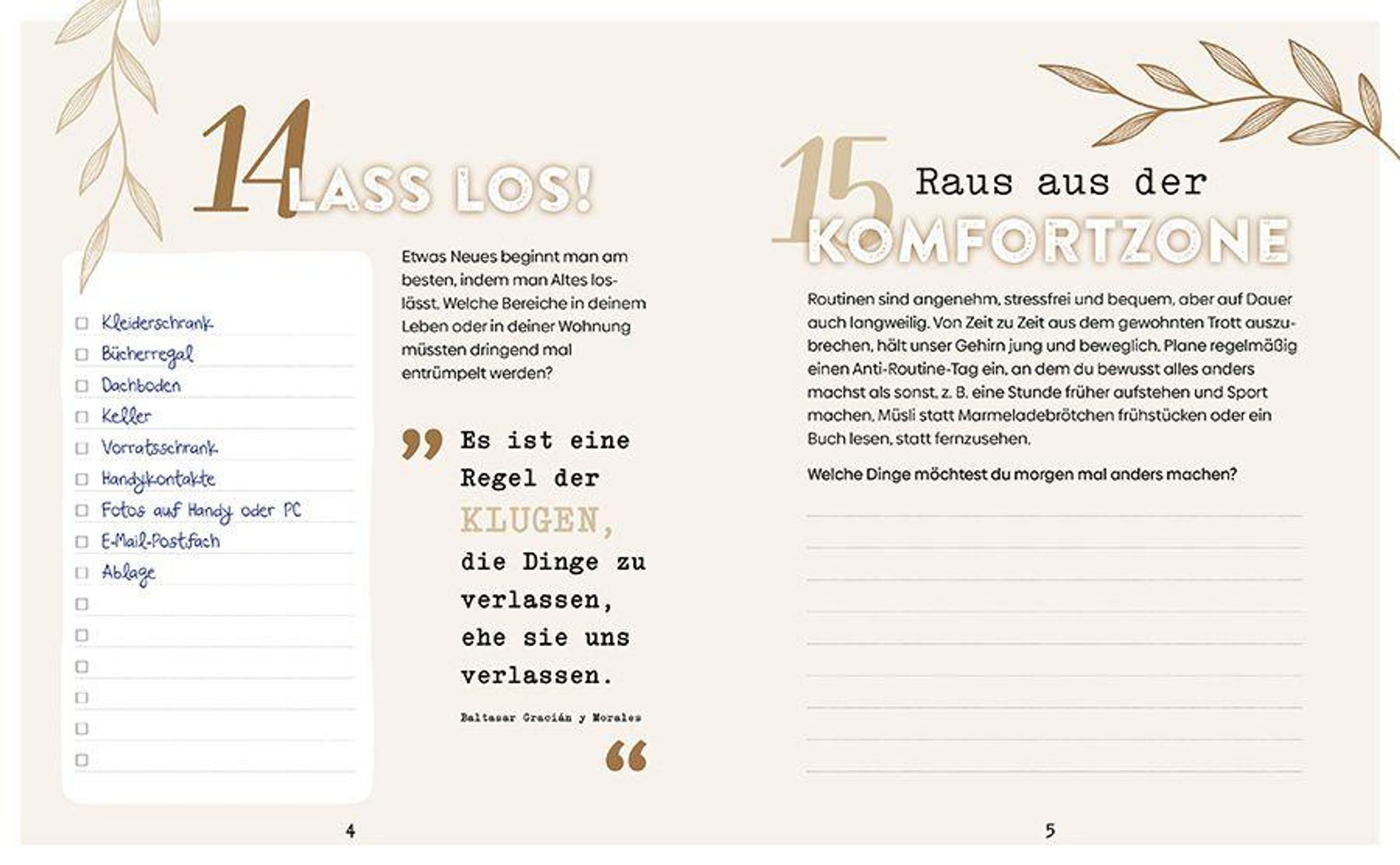 Ob etwas Neues lernen , das schon lange auf der Wunschliste steht, den Sonnenaufgang bei einer Tasse Kaffee genießen oder einfach spontan ins Auto steigen und losfahren: Die Impulse laden dazu ein, den Alltag neu zu entdecken und das Leben bewusst zu gestalten . Mal kreativ, mal nachdenklich, mal ganz leicht. Neben neuen Erfahrungen geht es auch um Rückblicke und Wertschätzung: einen Brief an das jüngere Ich schreiben, einer wichtigen Person aus der Vergangenheit danken oder Gedanken festhalten, die sonst keinen Raum finden.