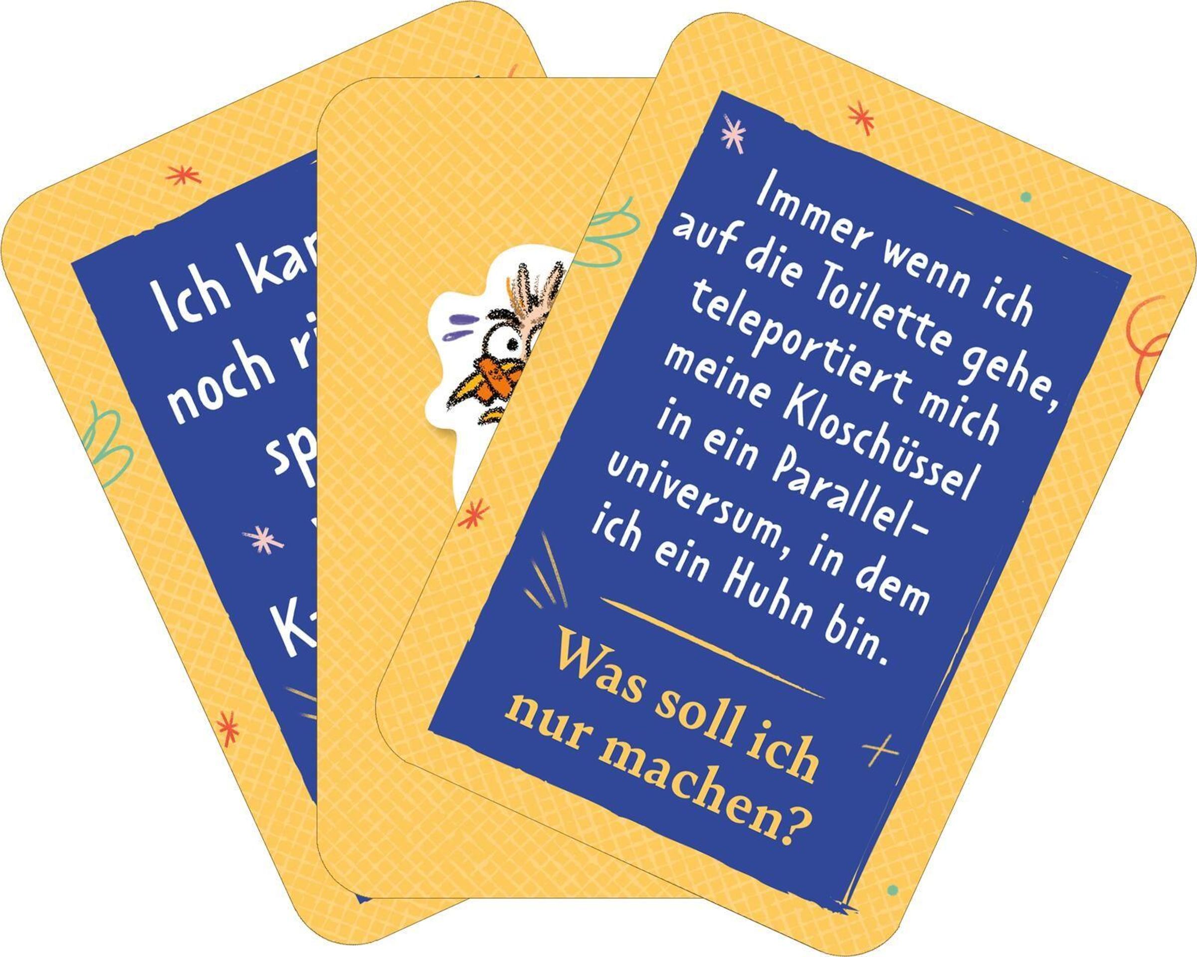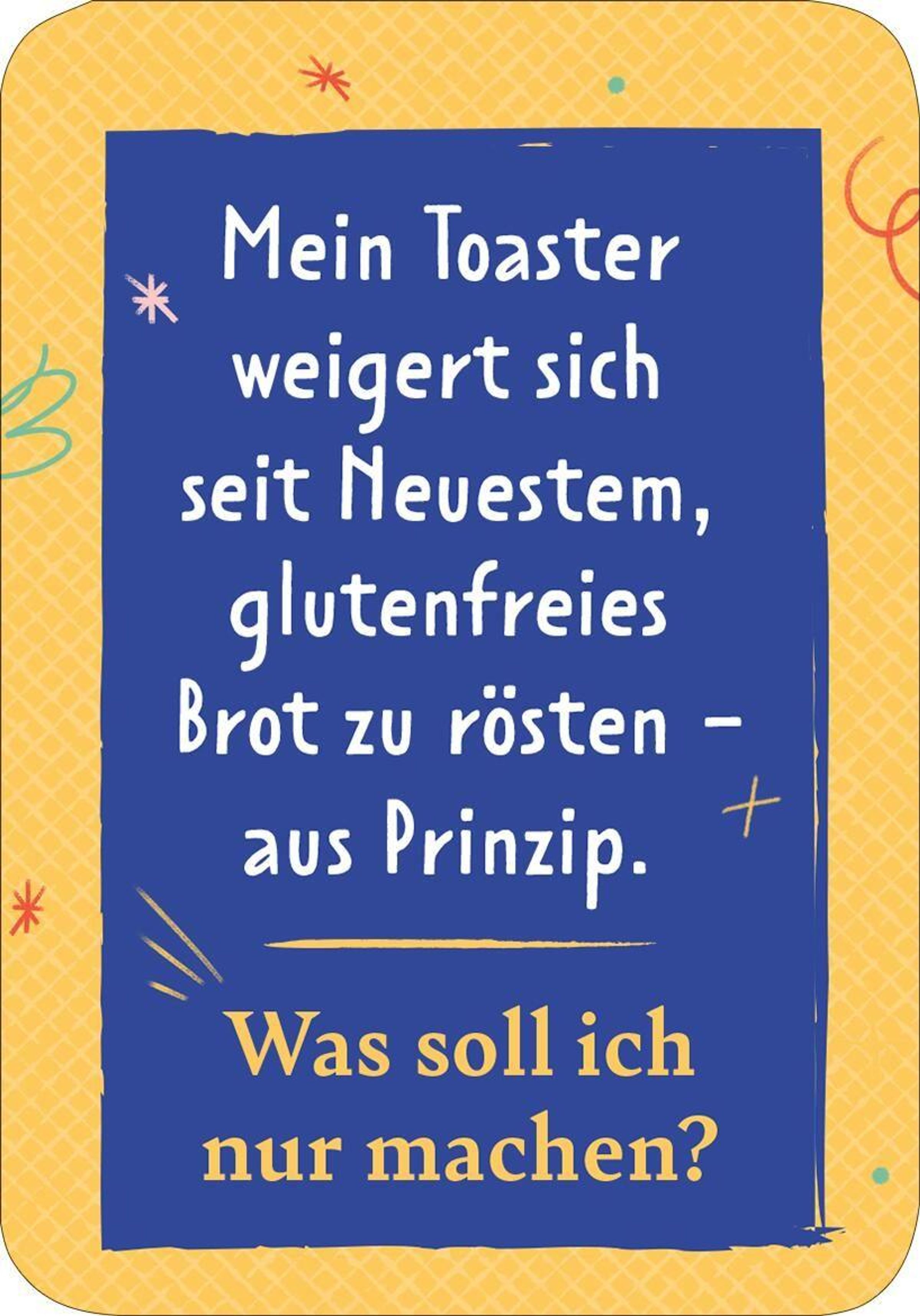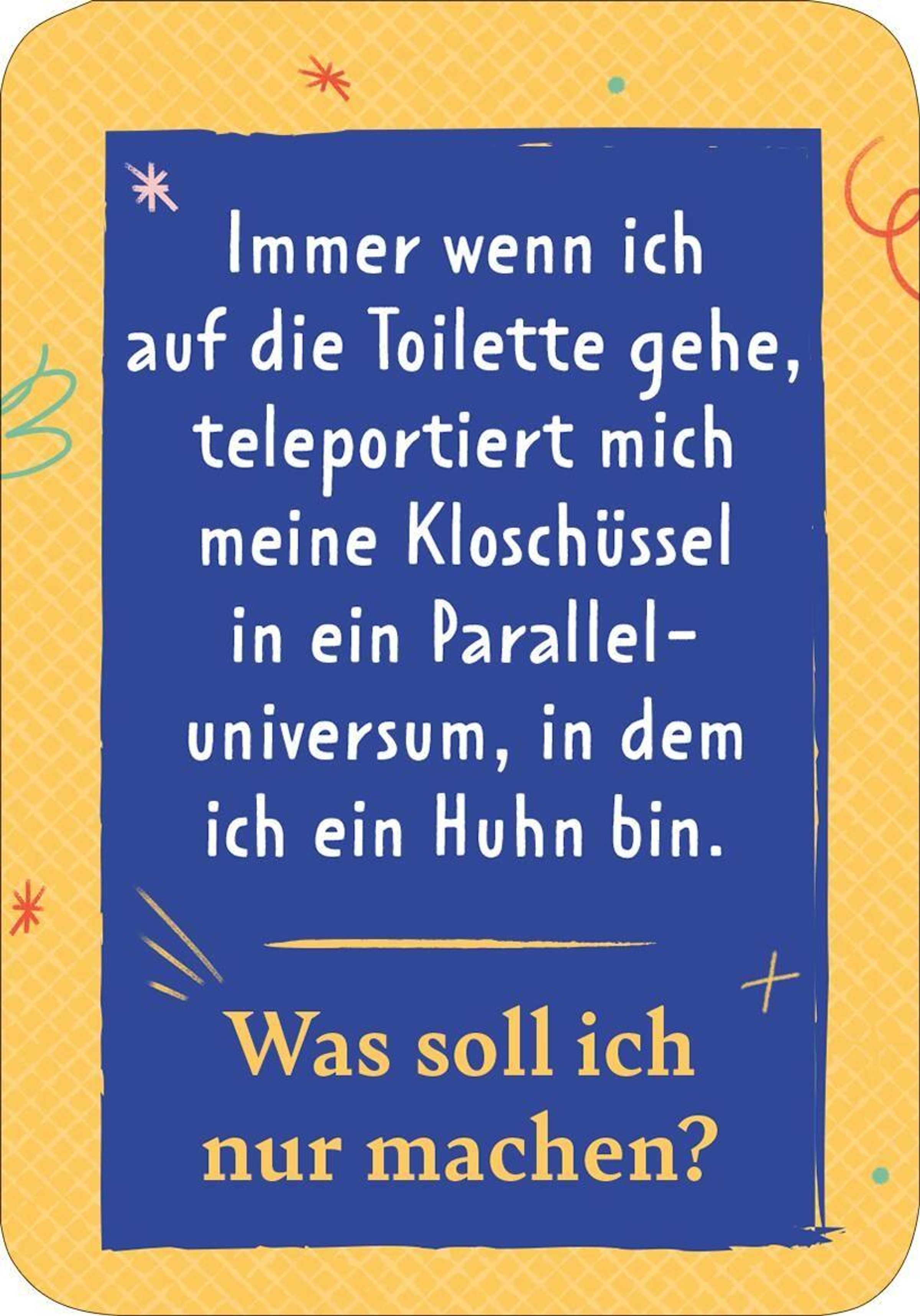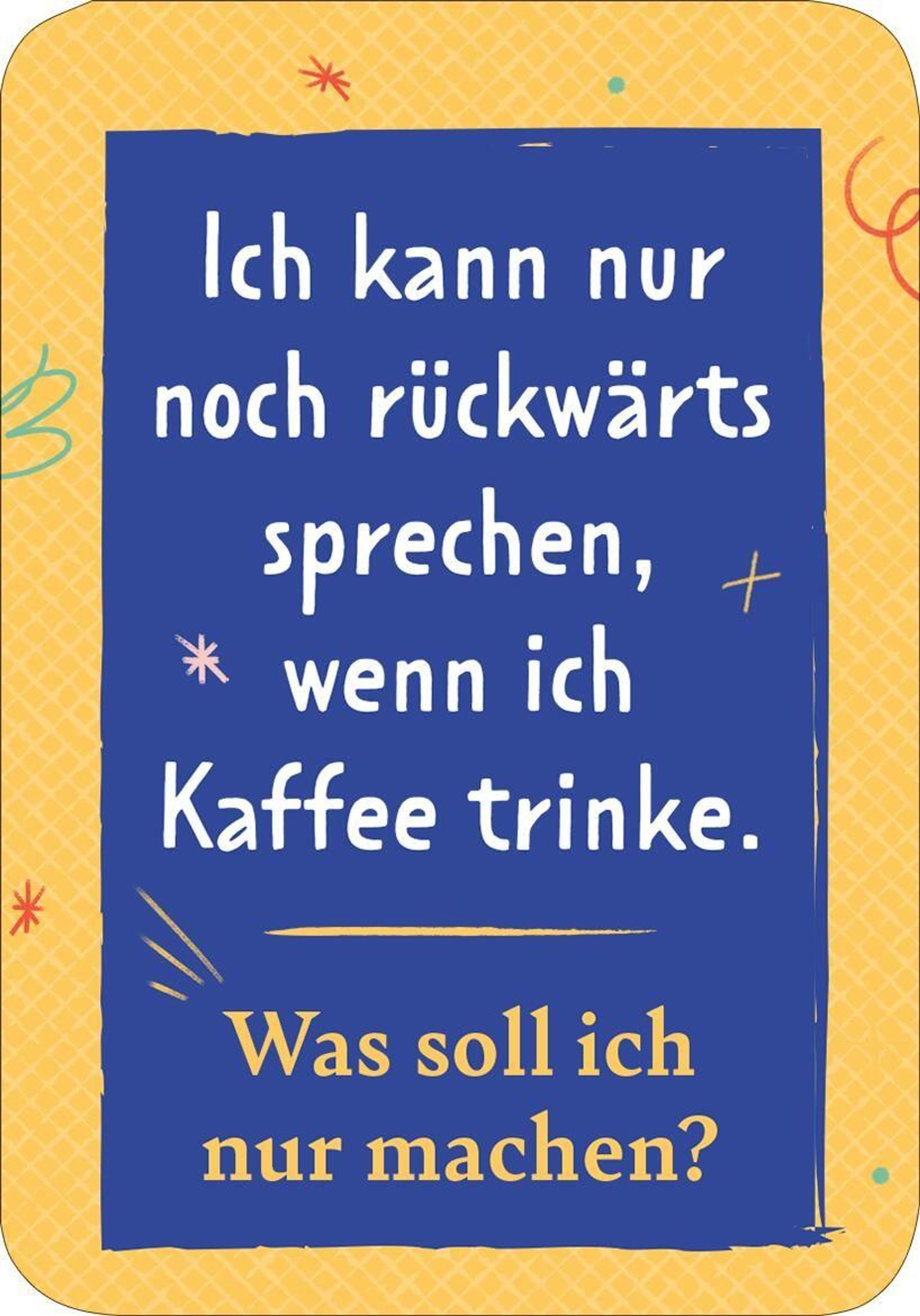 Mit diesem schrägen Partyspiel werdet ihr zu Problemlöserinnen und Ausredenkönigen! Diese liebevoll gestaltete Kartenbox mit 50 skurrilen und witzigen Problemlösungsaufgaben fordert euer Improvisationstalent heraus. Entwickelt absurde Lösungen, schlagfertige Ausreden und sorgt für jede Menge Gelächter. Perfekt für Partys, Geburtstage oder als originelles Mitbringsel!
