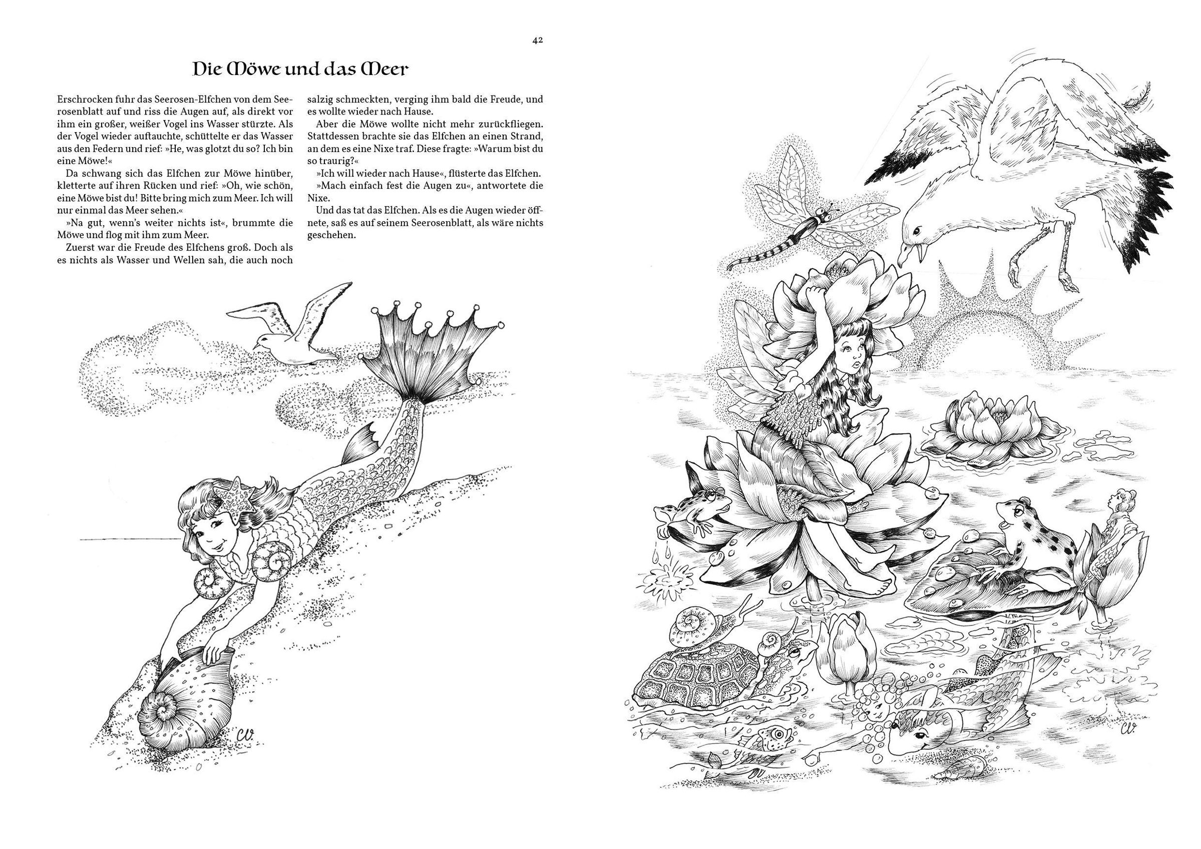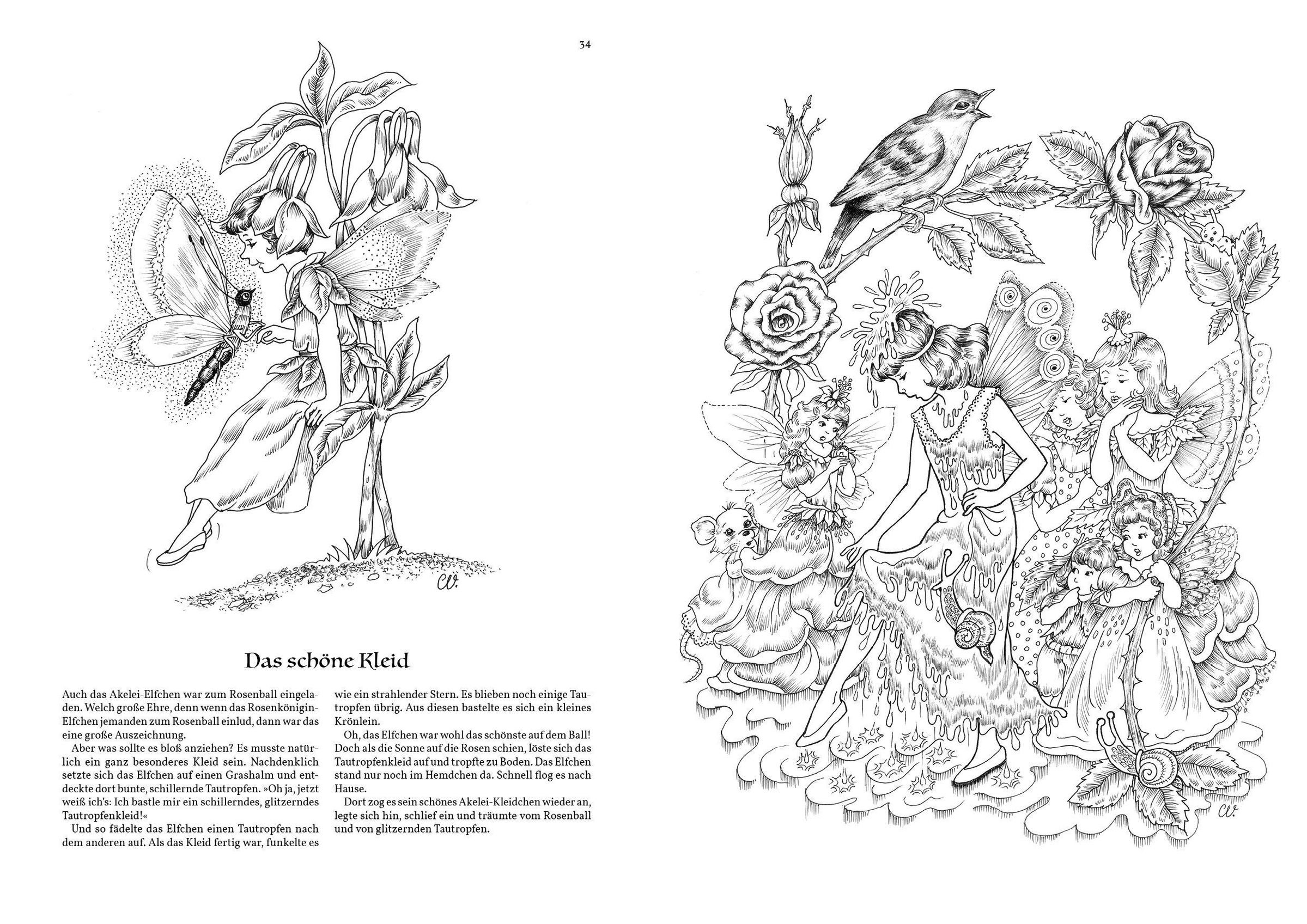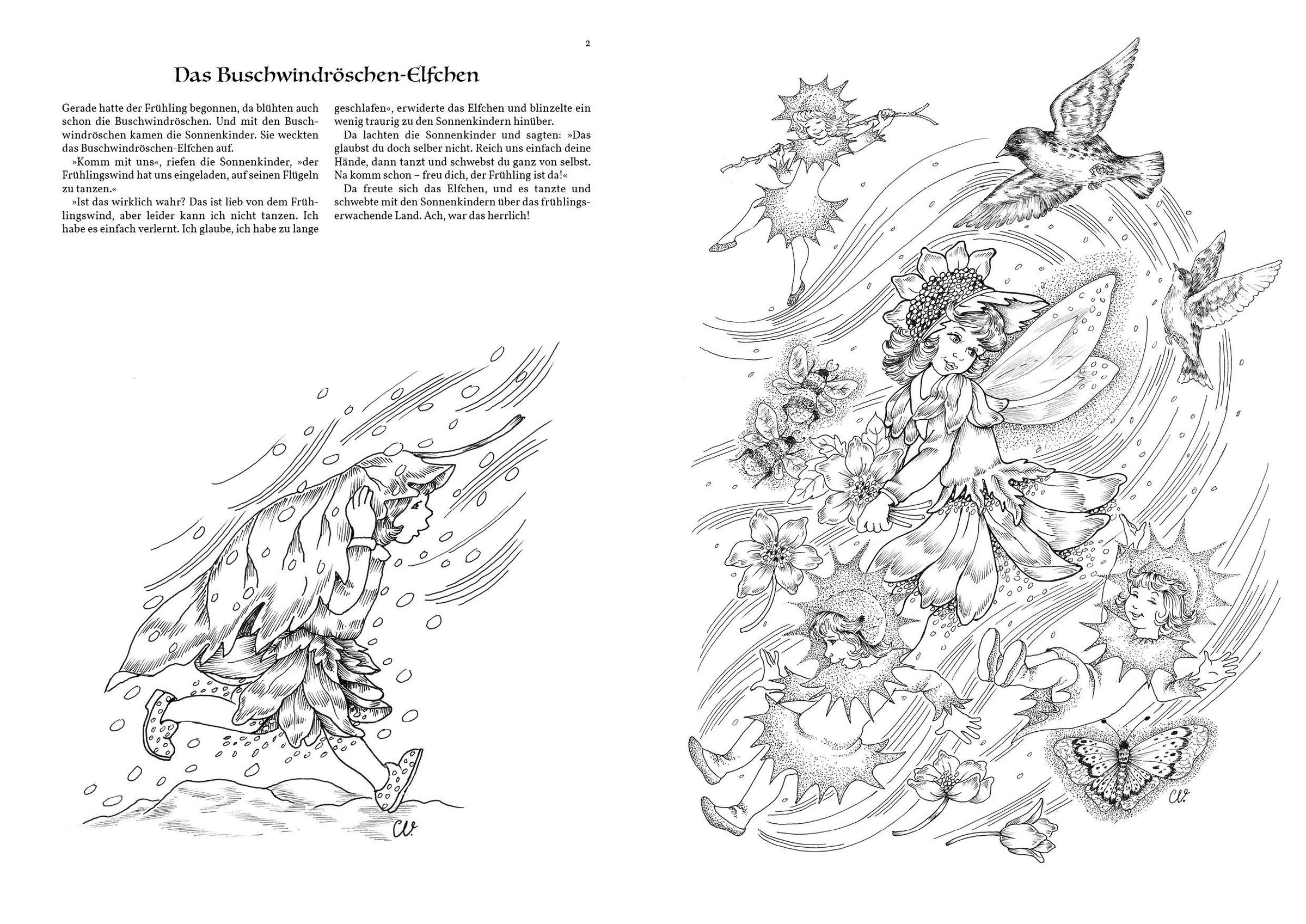 Text: "Christl Vogls Ausmalfreude, ein Malbuch für ruhige Momente." Illustration von Feen und Blumen in leuchtenden Farben., Buch