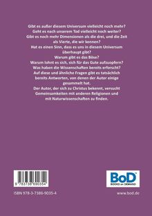 Gibt es außer diesem Universum vielleicht noch mehr? Geht es nach unserem Tod vielleicht noch weiter? Gibt es noch mehr Dimensionen als die drei, und die Zeit als Vierte, die wir kennen? Hat es einen Sinn, dass es uns in diesem Universum überhaupt gibt? Warum gibt es das Böse? Warum lohnt es sich, sich für das Gute aufzuopfern? Was haben die Wissenschaften bereits erforscht? Auf diese und ähnliche Fragen gibt es tatsächlich bereits Antworten, von denen der Autor einige gesammelt hat. Der Autor, der sich zu Christus bekennt, versucht Gemeinsamkeiten mit anderen Religionen und mit Naturwissenschaften zu finden.