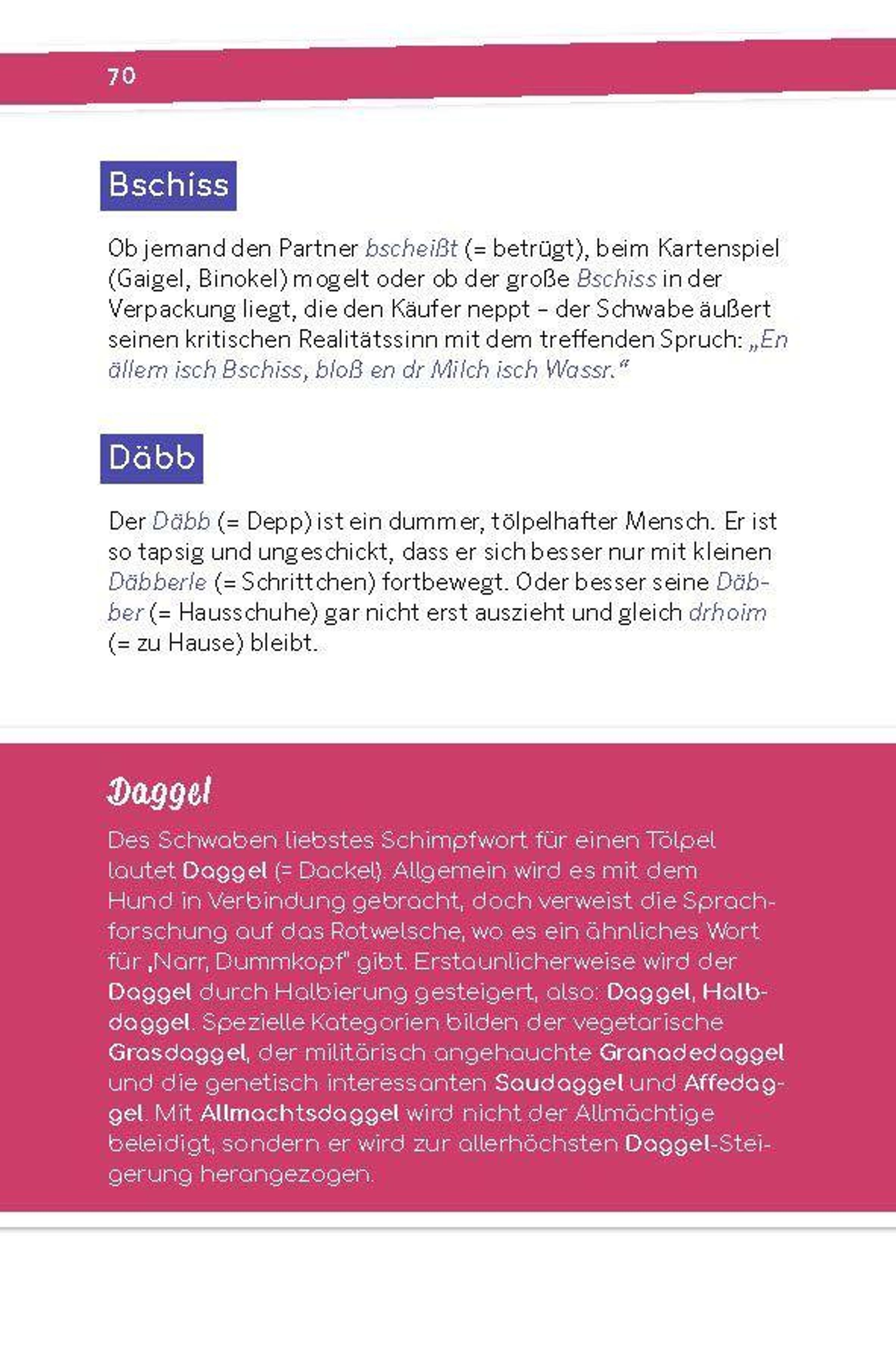 Anhand vieler charmanter Worterklärungen und Anekdoten lernen Sie die schwäbische Sprache und Mentalität mit all ihren Eigenheiten kennen und punkten so selbst bei den pedantischsten alt-eingesessenen Nachbarn! Auch das Eikaufa wird sprachlich ein voller Erfolg - frei nach dem Motto "Mir kaufet nix, mir gucket bloß" .