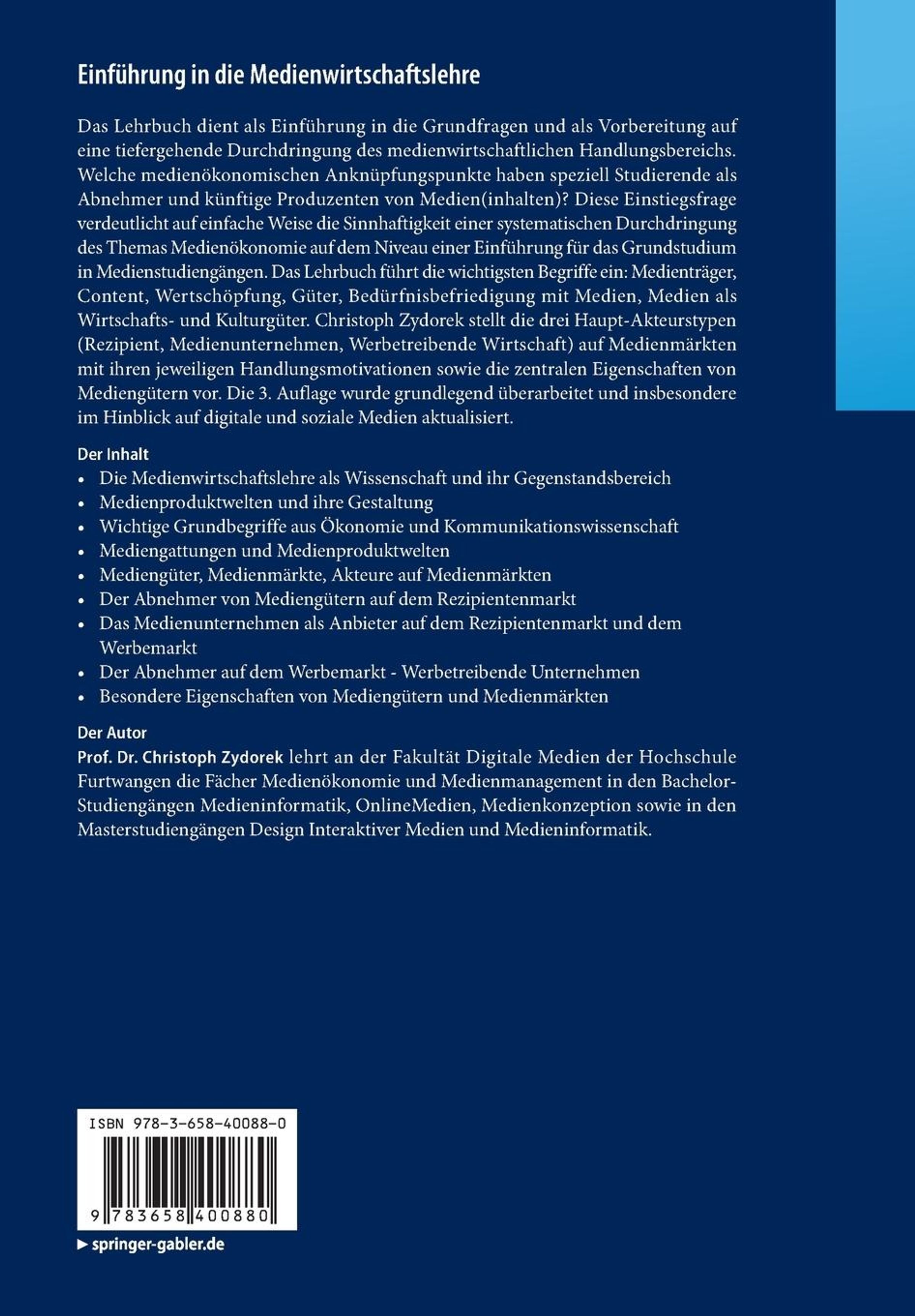 Das Lehrbuch dient als Einführung in die Grundfragen und als Vorbereitung auf eine tiefergehende Durchdringung des medienwirtschaftlichen Handlungsbereichs. Welche medienökonomischen Anknüpfungspunkte haben speziell Studierende als Abnehmer und künftige Produzenten von Medien(inhalten)? Diese Einstiegsfrage verdeutlicht auf einfache Weise die Sinnhaftigkeit einer systematischen Durchdringung des Themas Medienökonomie auf dem Niveau einer Einführung für das Grundstudium in Medienstudiengängen. Das Lehrbuch führt die wichtigsten Begriffe ein: Medienträger, Content, Wertschöpfung, Güter, Bedürfnisbefriedigung mit Medien, Medien als Wirtschafts- und Kulturgüter. Christoph Zydorek stellt die drei Haupt-Akteurstypen (Rezipient, Medienunternehmen, Werbetreibende Wirtschaft) auf Medienmärkten mit ihren jeweiligen Handlungsmotivationen sowie die zentralen Eigenschaften von Mediengütern vor. Die 3. Auflage wurde grundlegend überarbeitet und insbesondere im Hinblick auf digitale und soziale Medien aktualisiert.