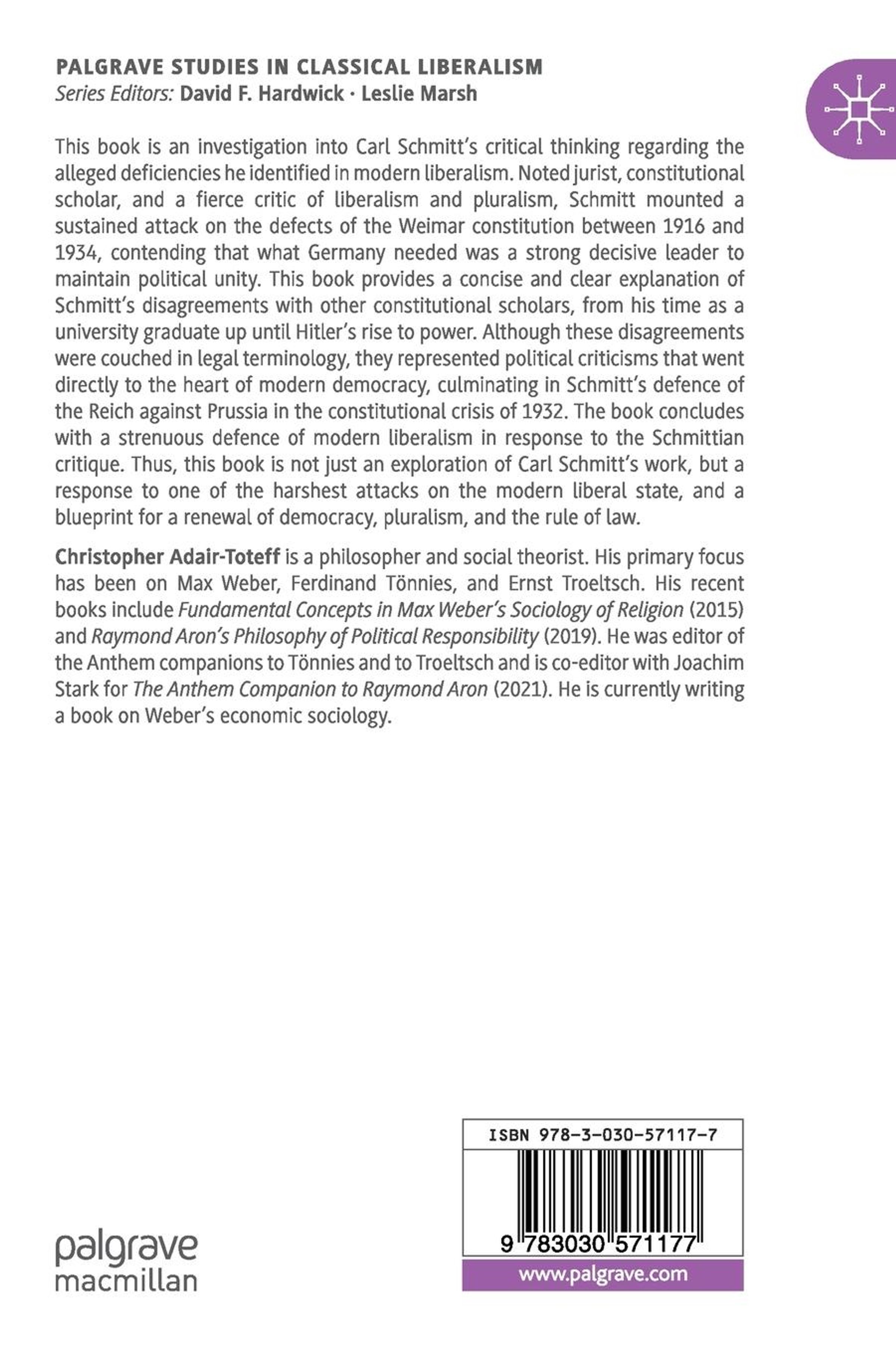 The book concludes with a strenuous defence of modern liberalism in response to the Schmittian critique. Thus, thisbook is not just an exploration of Carl Schmitts work, but a response to one of the harshest attacks on the modern liberal state, and a blueprint for a renewal of democracy, pluralism, and the rule of law.