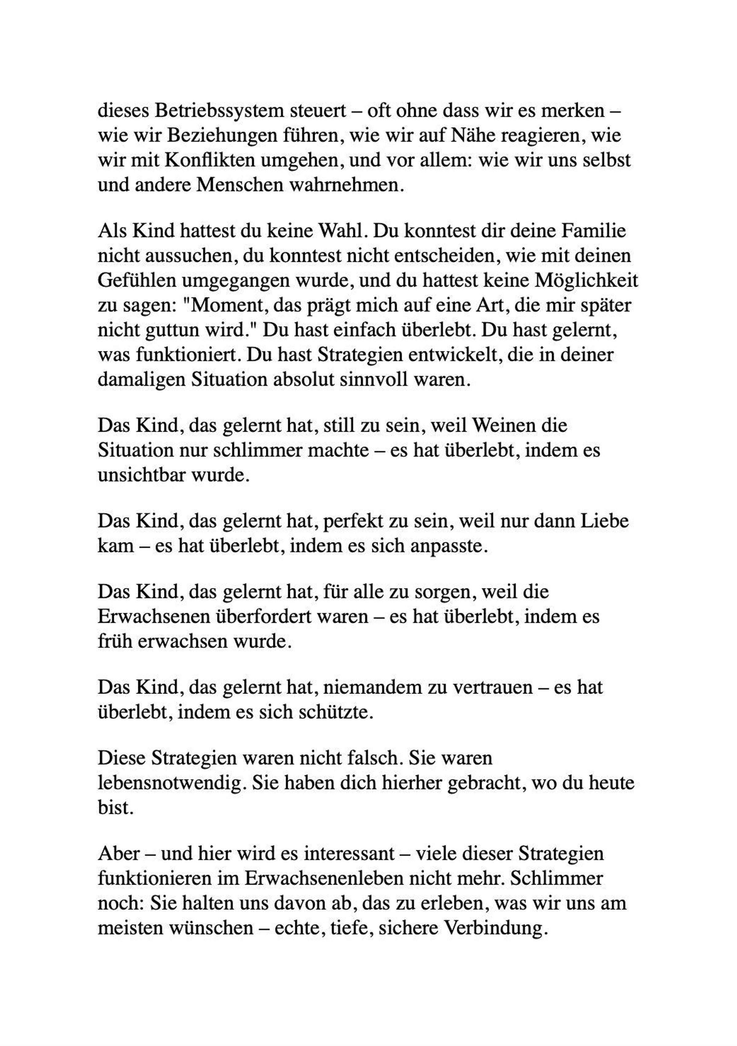 Dieses Buch verspricht keine schnelle Heilung und keine einfache Lösung. Es lädt dich ein, langsamer zu werden. Ehrlicher hinzuschauen. Dich selbst nicht länger als Problem zu betrachten, sondern als jemanden mit einer Geschichte - einer Geschichte, die verstanden und neu geschrieben werden darf.