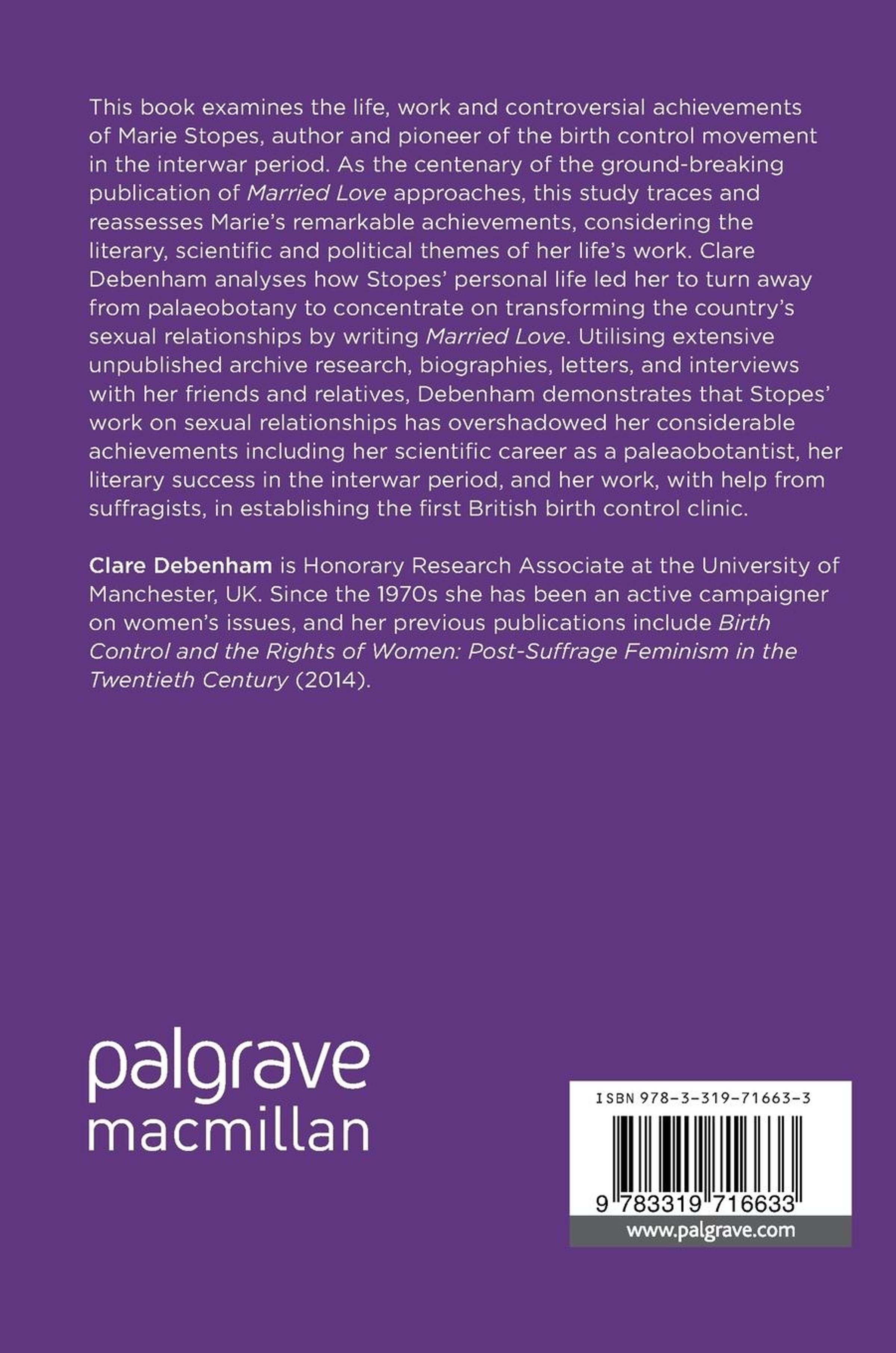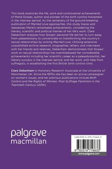 This book examines the life, work and contraversial achievements of Marie Stopes, author and pioneer of the birth control movement in the interwar period. As the centenary of the ground-breaking publication of Married Love approaches, this study traces and reassesses Maries remarkable achievements, considering the literary, scientific and political themes of her lifes work. Clare Debenham analyses how Stopes personal life led her to turn away from palaeobotany to concentrate on transforming the countrys sexual relationships by writing Married Love. Utilising extensive unpublished archive research, biographies, letters, and interviews with her friends and relatives, Debenham demonstrates that Stopes's work on sexual relationships has overshadowed her considerable achievements including her scientific career as a paleaobotantist, her literary success in the interwar period, and her work, with help from suffragists, in establishing the first British birth control clinic.