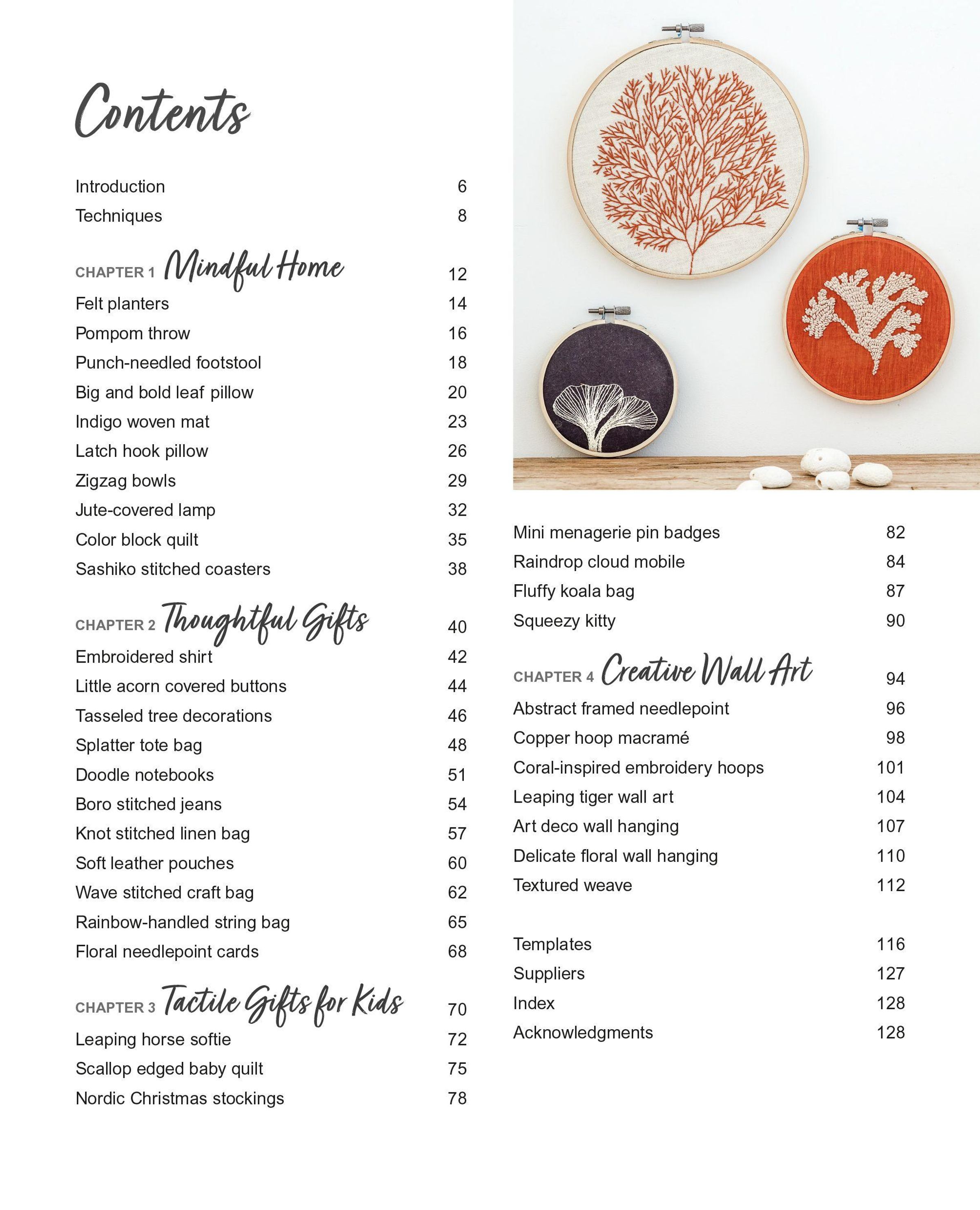 In the first chapter, there are projects for the home, from felt planters to a tactile pompom throw and sashiko-stitched coasters. Next, craft thoughtful gifts such as soft leather pouches, an embroidered shirt, and doodle-printed notebooks.