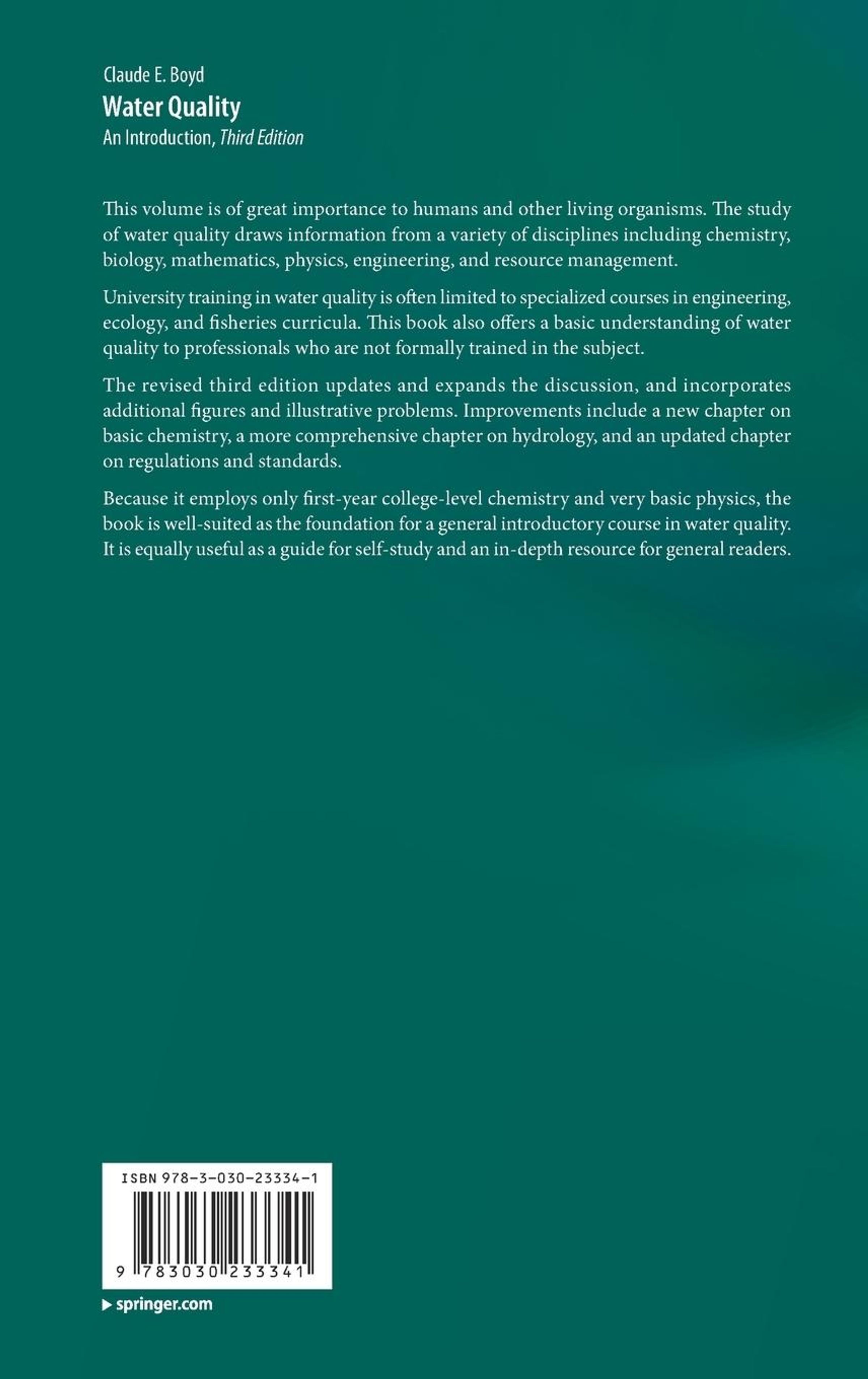 This volume is of great importance to humans and other living organisms. The study of water quality draws information from a variety of disciplines including chemistry, biology, mathematics, physics, engineering, and resource management. University training in water quality is often limited to specialized courses in engineering, ecology, and fisheries curricula. This book also offers a basic understanding of water quality to professionals who are not formally trained in the subject. The revised third edition updates and expands the discussion, and incorporates additional figures and illustrative problems. Improvements include a new chapter on basic chemistry, a more comprehensive chapter on hydrology, and an updated chapter on regulations and standards. Because it employs only first-year college-level chemistry and very basic physics, the book is well-suited as the foundation for a general introductory course in water quality. It is equally useful as a guide for self-study and an in-depth resource for general readers.