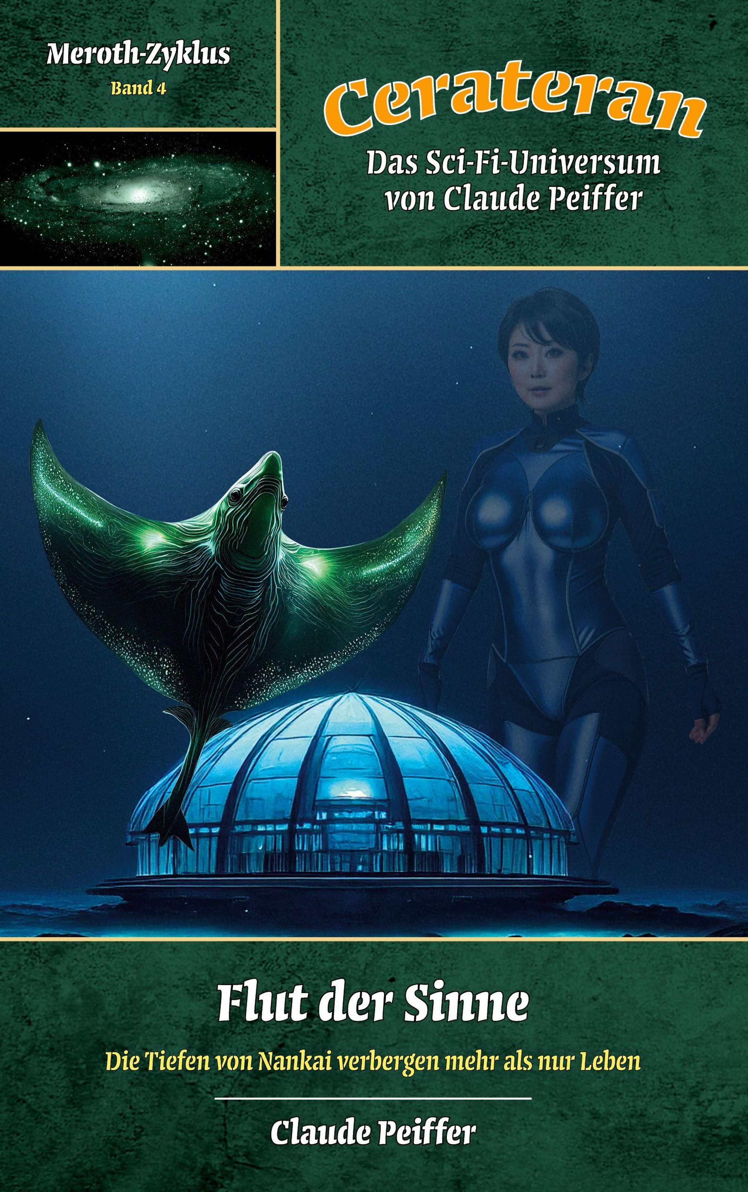 Buchcover: "Meroth-Zyklus Band 4", "Cerateran", "Flut der Sinne". Frau in Anzug, futuristische Kuppel und leuchtender Rochen., Buch