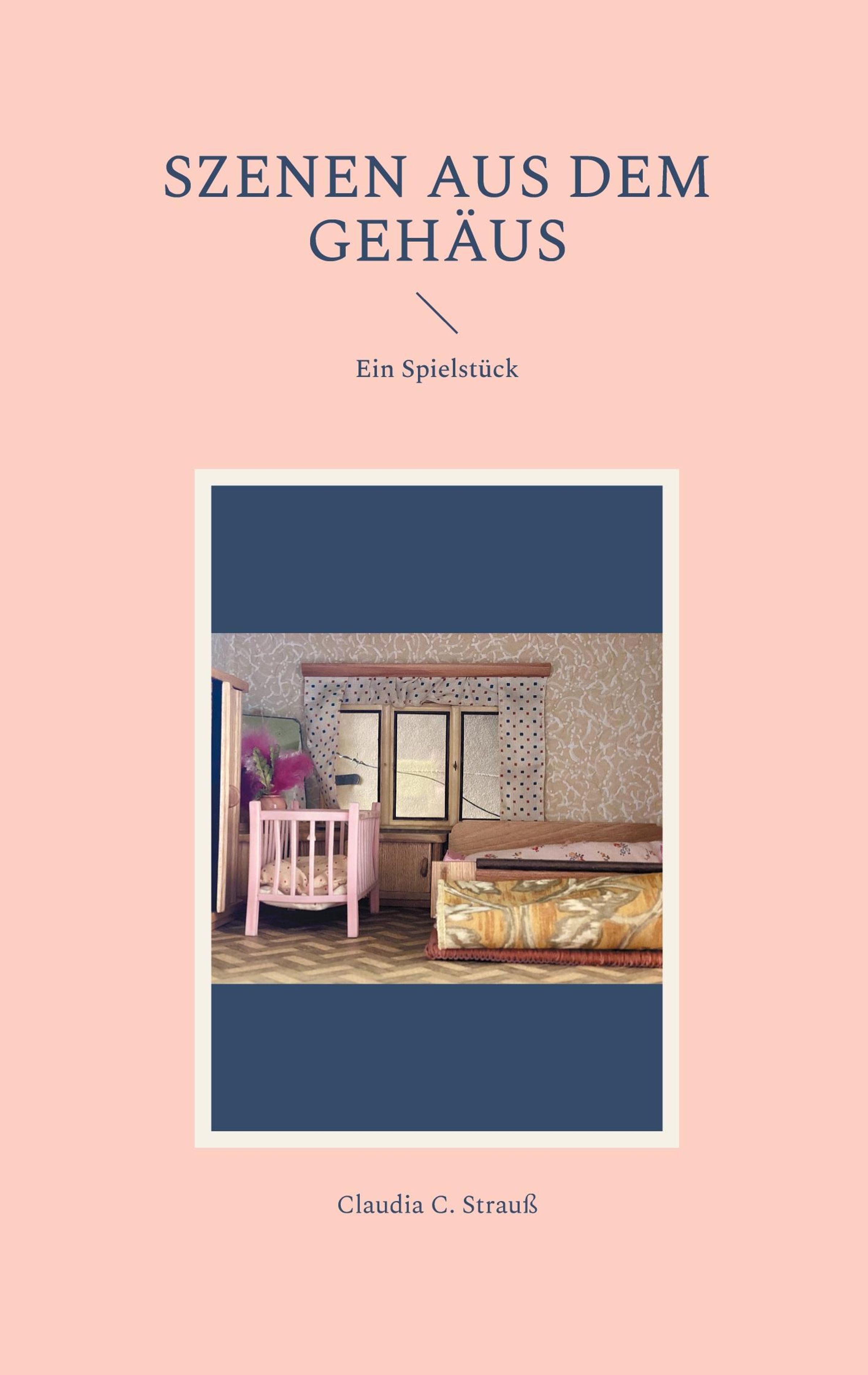 Text: "SZENEN AUS DEM GEHÄUS, Ein Spielstück, Claudia C. Strauß". Bild: Ein Miniaturzimmer mit Möbeln., Buch