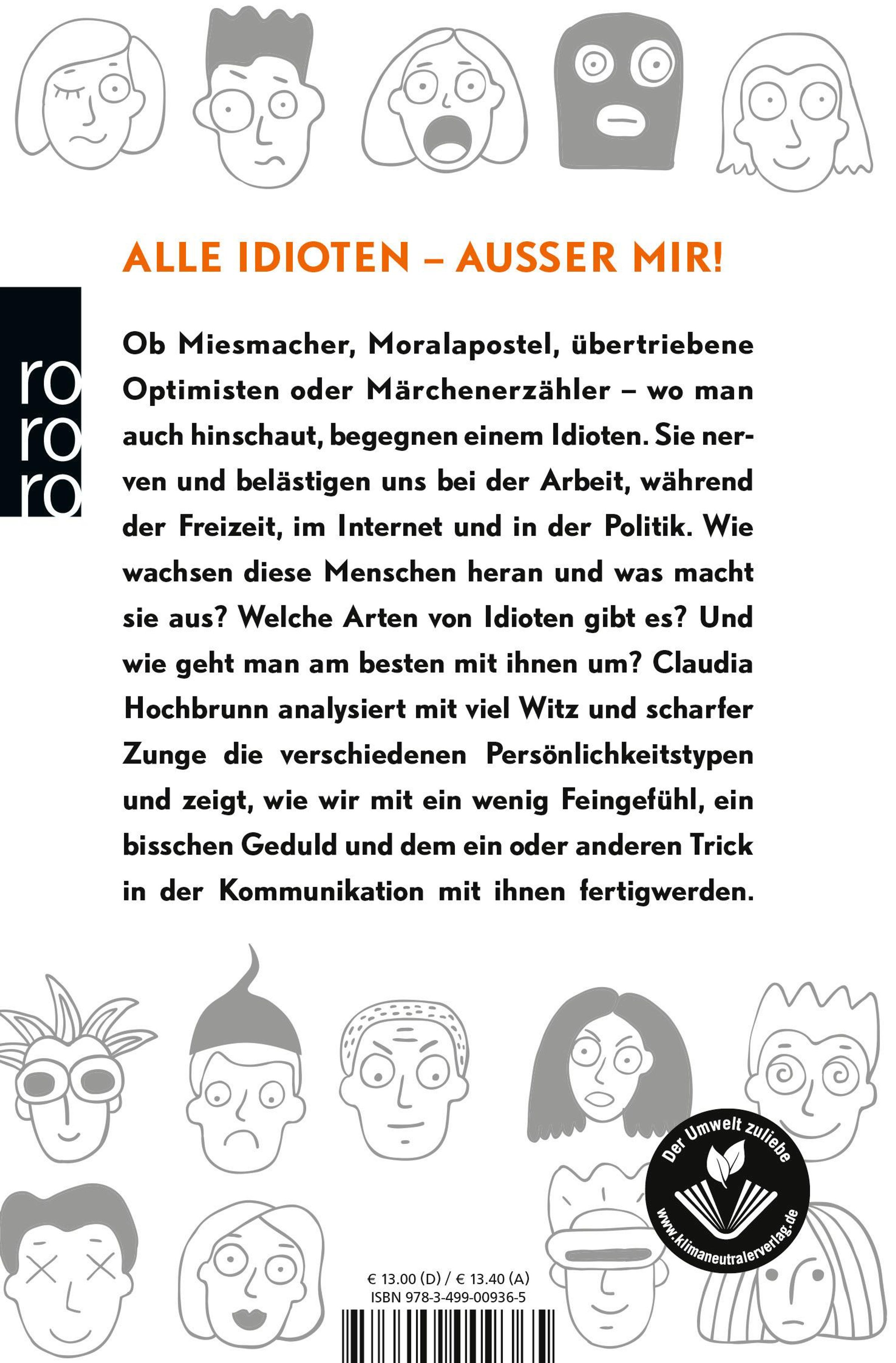Ob Miesmacher, Moralapostel, übertriebene Optimisten oder Märchenerzähler - wo man auch hinschaut, begegnen einem Idioten. Sie nerven und belästigen uns bei der Arbeit, während der Freizeit, im Internet und in der Politik. Wie wachsen diese Menschen heran und was macht sie aus? Welche Arten von Idioten gibt es? Und wie geht man am besten mit ihnen um? Claudia Hochbrunn analysiert mit viel Witz und scharfer Zunge die verschiedenen Persönlichkeitstypen und zeigt, wie wir mit ein wenig Feingefühl, ein bisschen Geduld und dem ein oder anderen Trick in der Kommunikation mit ihnen fertig werden.