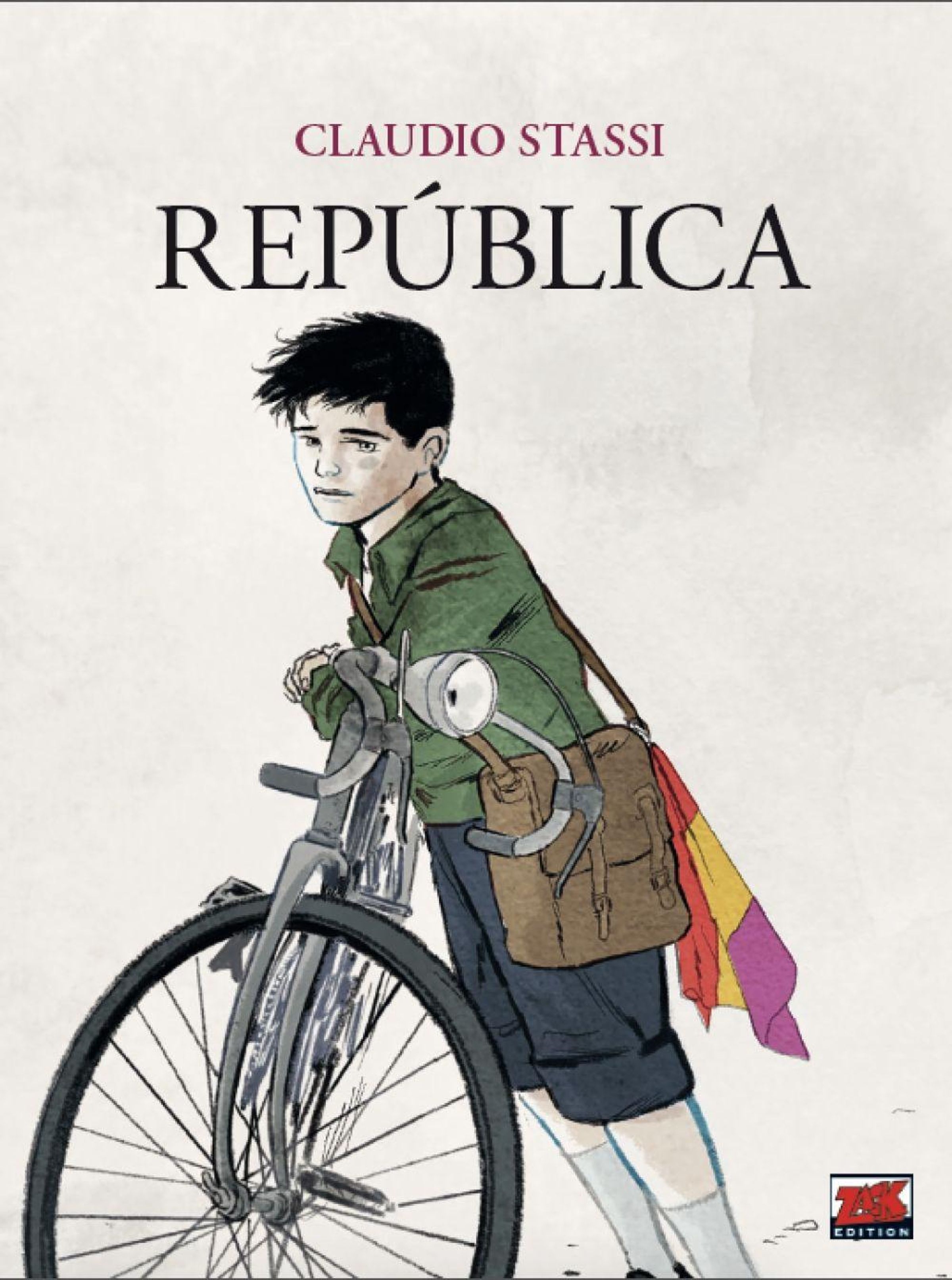 "Claudio Stassi, República." Ein Junge mit Fahrrad und Tasche, bunter Stoff hinten, guckt nachdenklich. Illustration., Buch