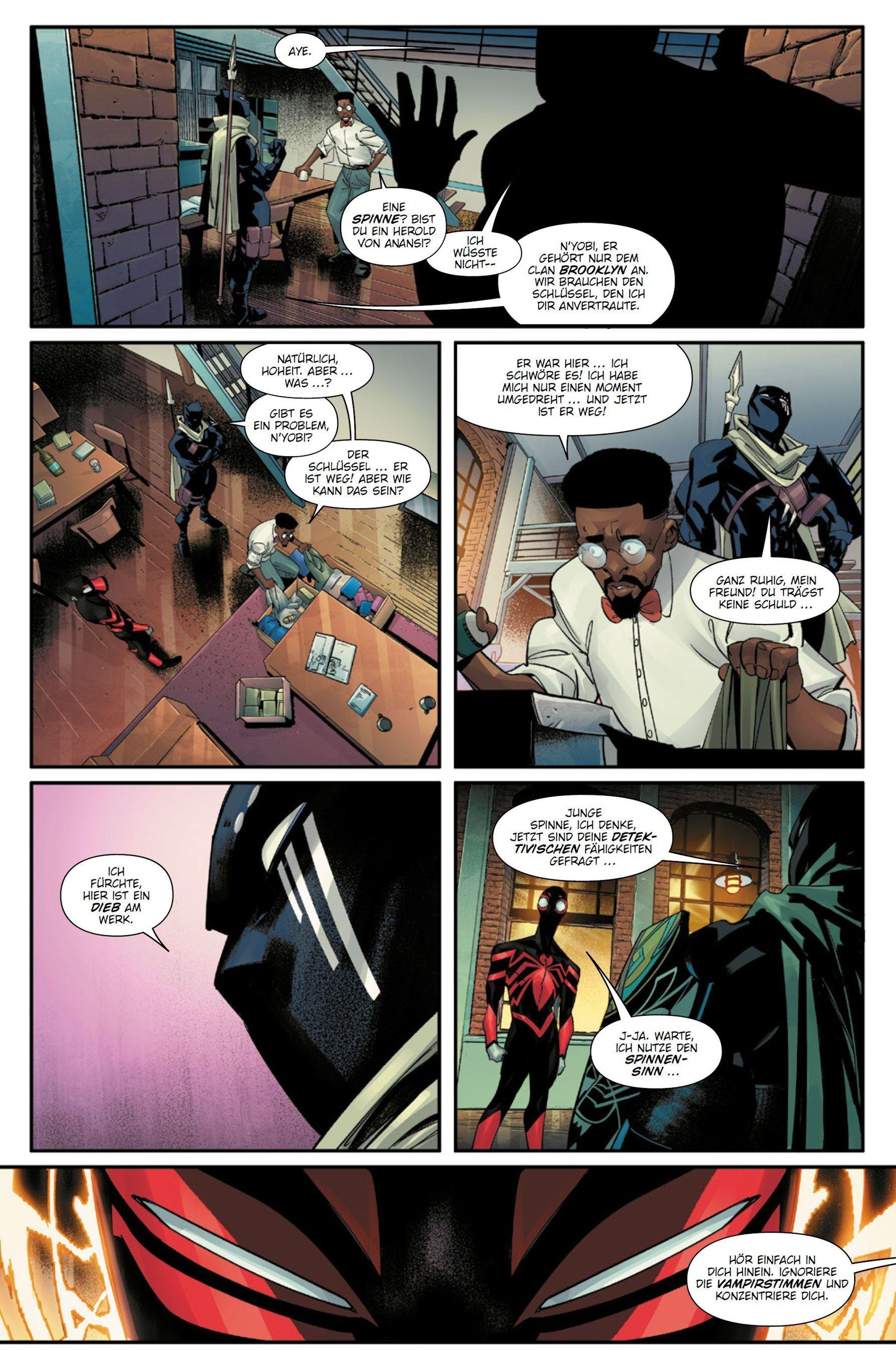 MILES IN WAKANDA Um Miles Morales endlich von seiner gefährlichen Vampir-Infektion zu kurieren, reist Black Panther mit dem Nachwuchs-Netzschwinger aus Brooklyn nach Afrika! In Wakanda muss sich Spidey den Prüfungen des Panthers, der gestrengen Katzengöttin Bast und des unberechenbaren Spinnengottes Anansi stellen und um seine Seele kämpfen! Außerdem kommt Miles nach Puerto Rico zu seiner Großmutter - und trifft in einem Hurrikan auf die stürmische Mutantin Storm.