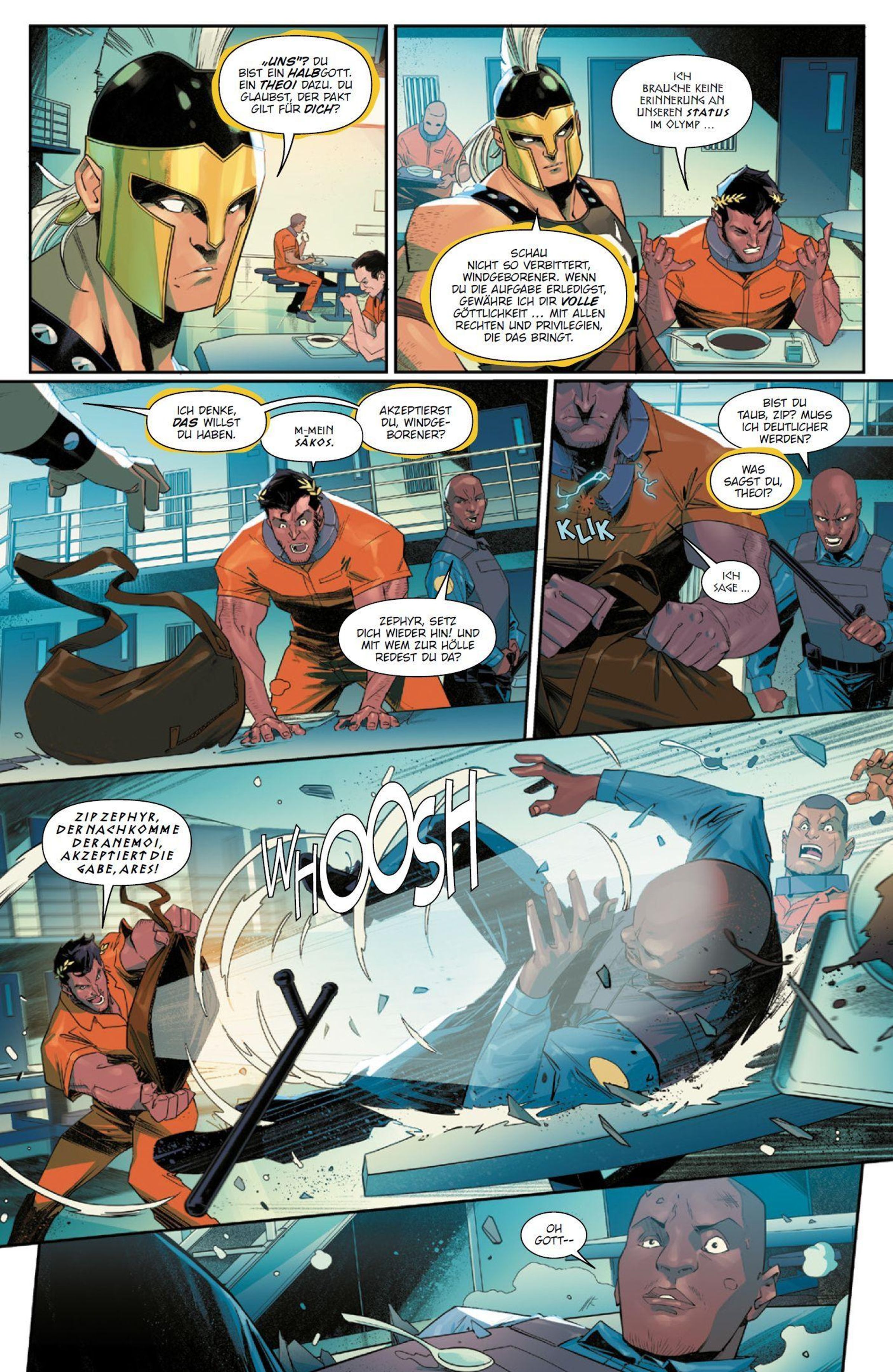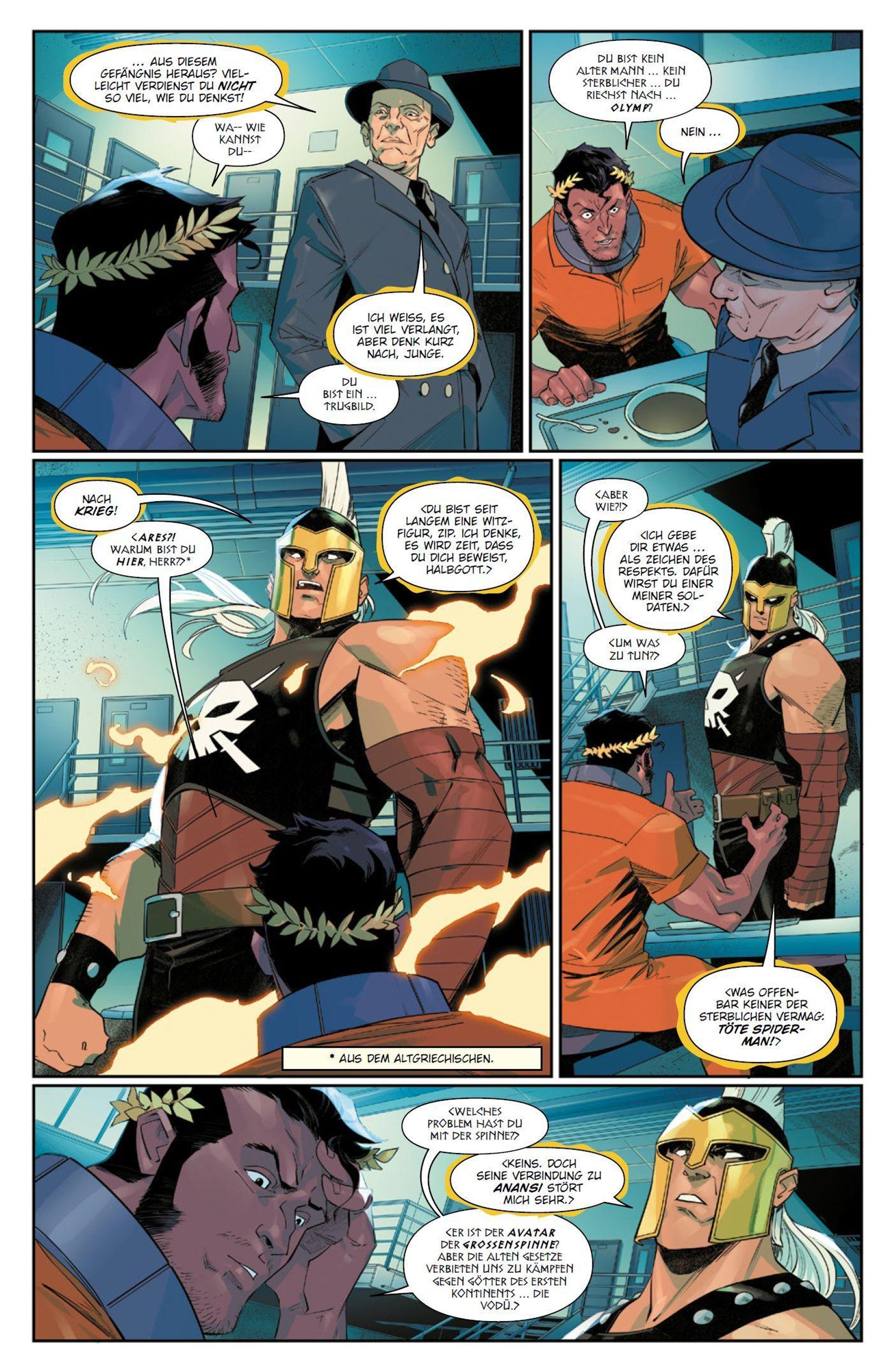 GÖTTLICHES CHAOS Neuerdings ist Nachwuchs-Netzschwinger Miles Morales auch der Herold des alten afrikanischen Spinnengottes Anansi - und ein Gott kommt selten allein! Gut, dass Thor und Hercules bereitstehen, um Spidey gegen den göttlich verstärkten Zip Zephyr zu helfen. Dann fordert Anansi aber auch noch Kriegsgott Ares und andere göttliche Wesen zu einem Wettstreit heraus, in dem Miles und seine Freunde antreten müssen. Doch Anansi spielt wie üblich nicht mit offenen Karten.