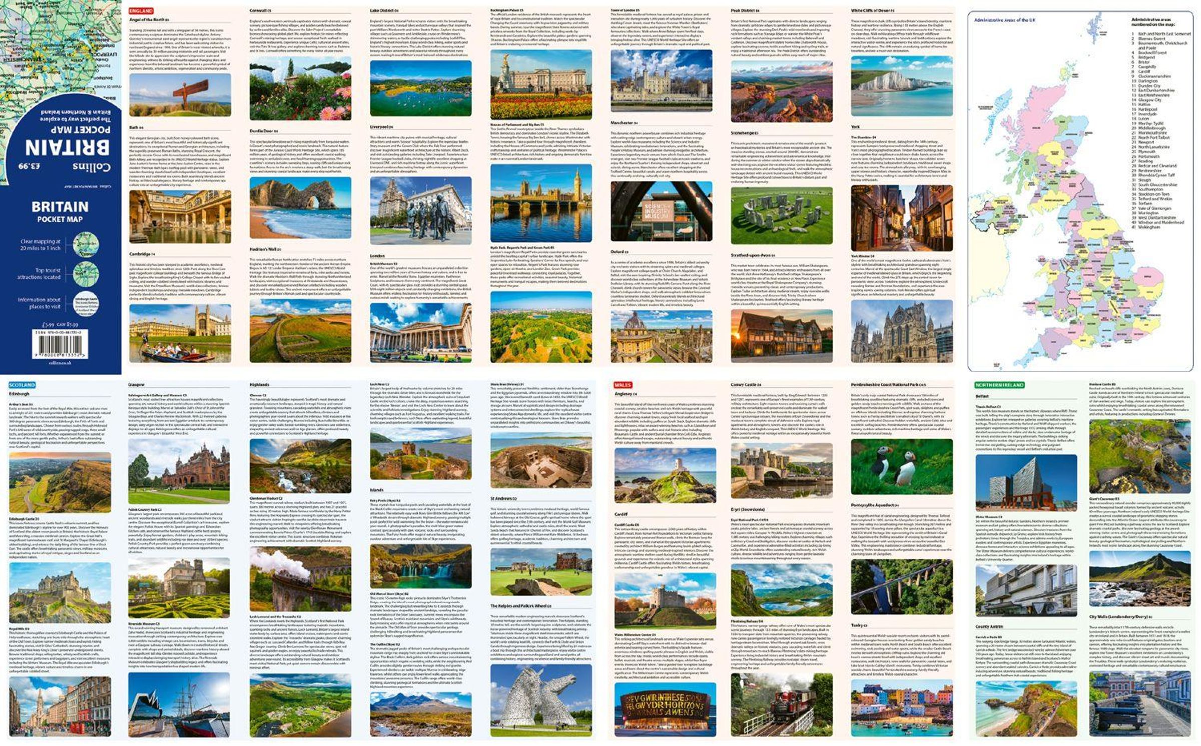 Explore Britain with this handy, full-colour pocket map. Excellent value and very detailed for its size. With two sides of mapping, including a full fold out map of Britain and Ireland on one side and tourism spots and photos on the other, this is the perfect product to plan a trip around Britain. For use as a reference map or a source of inspiration, this versatile map can be used practically or decoratively to suit your needs.