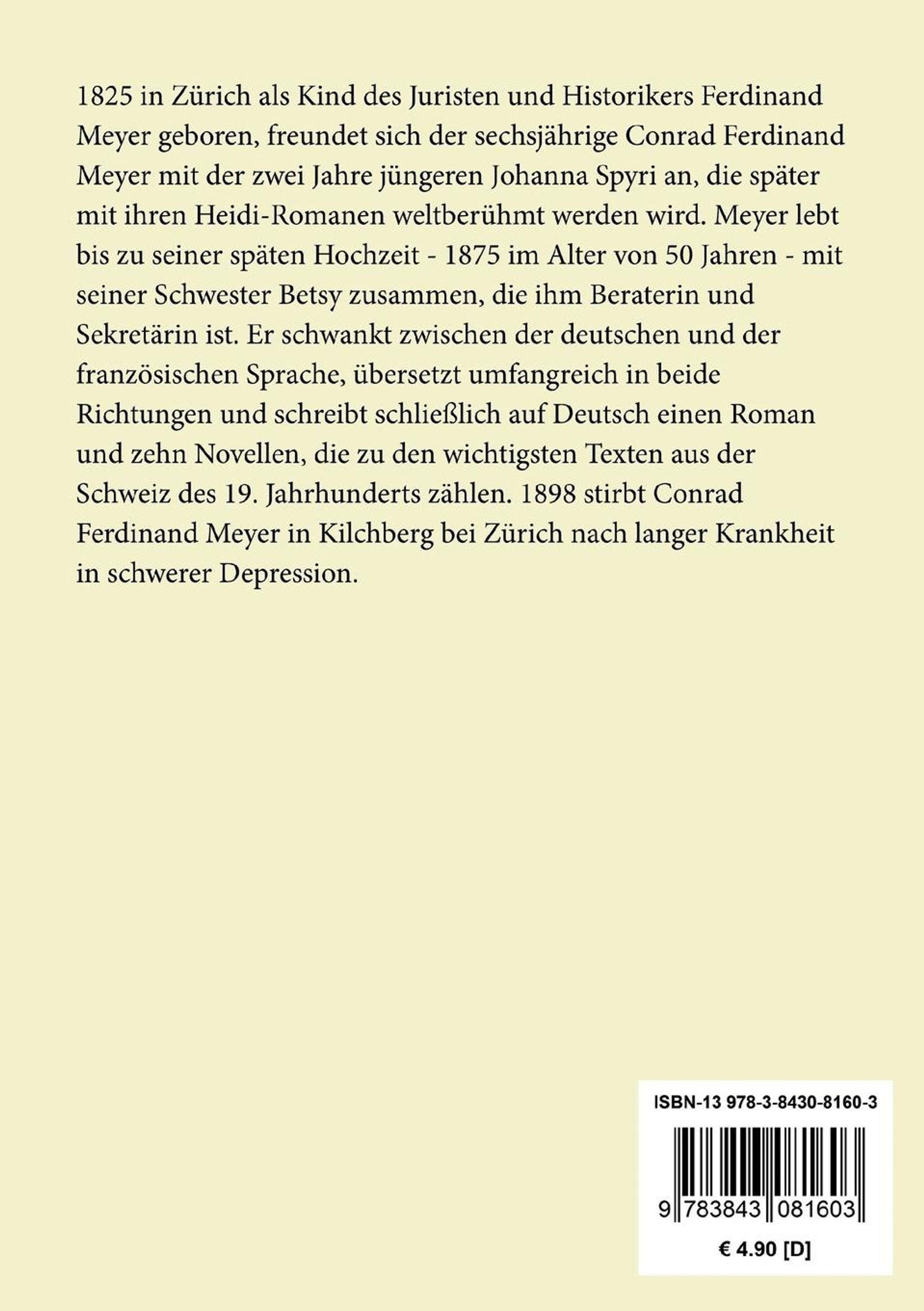 1825 in Zürich als Kind des Juristen und Historikers Ferdinand Meyer geboren, freundet sich der sechsjährige Conrad Ferdinand Meyer mit der zwei Jahre jüngeren Johanna Spyri an, die später mit ihren Heidi-Romanen weltberühmt werden wird. Meyer lebt bis zu seiner späten Hochzeit - 1875 im Alter von 50 Jahren - mit seiner Schwester Betsy zusammen, die ihm Beraterin und Sekretärin ist. Er schwankt zwischen der deutschen und der französischen Sprache, übersetzt umfangreich in beide Richtungen und schreibt schließlich auf Deutsch einen Roman und zehn Novellen, die zu den wichtigsten Texten aus der Schweiz des 19. Jahrhunderts zählen. 1898 stirbt Conrad Ferdinand Meyer in Kilchberg bei Zürich nach langer Krankheit in schwerer Depression.