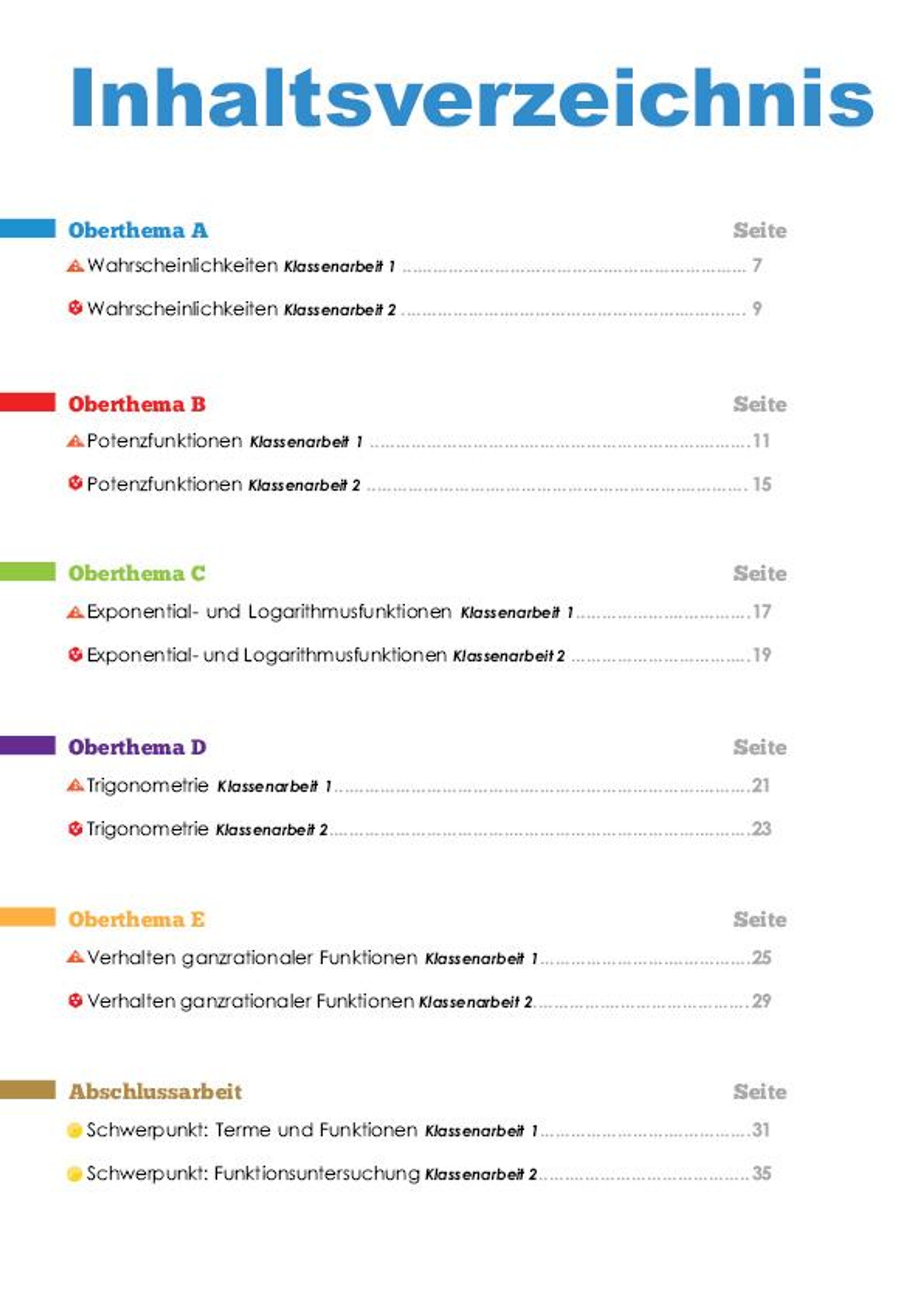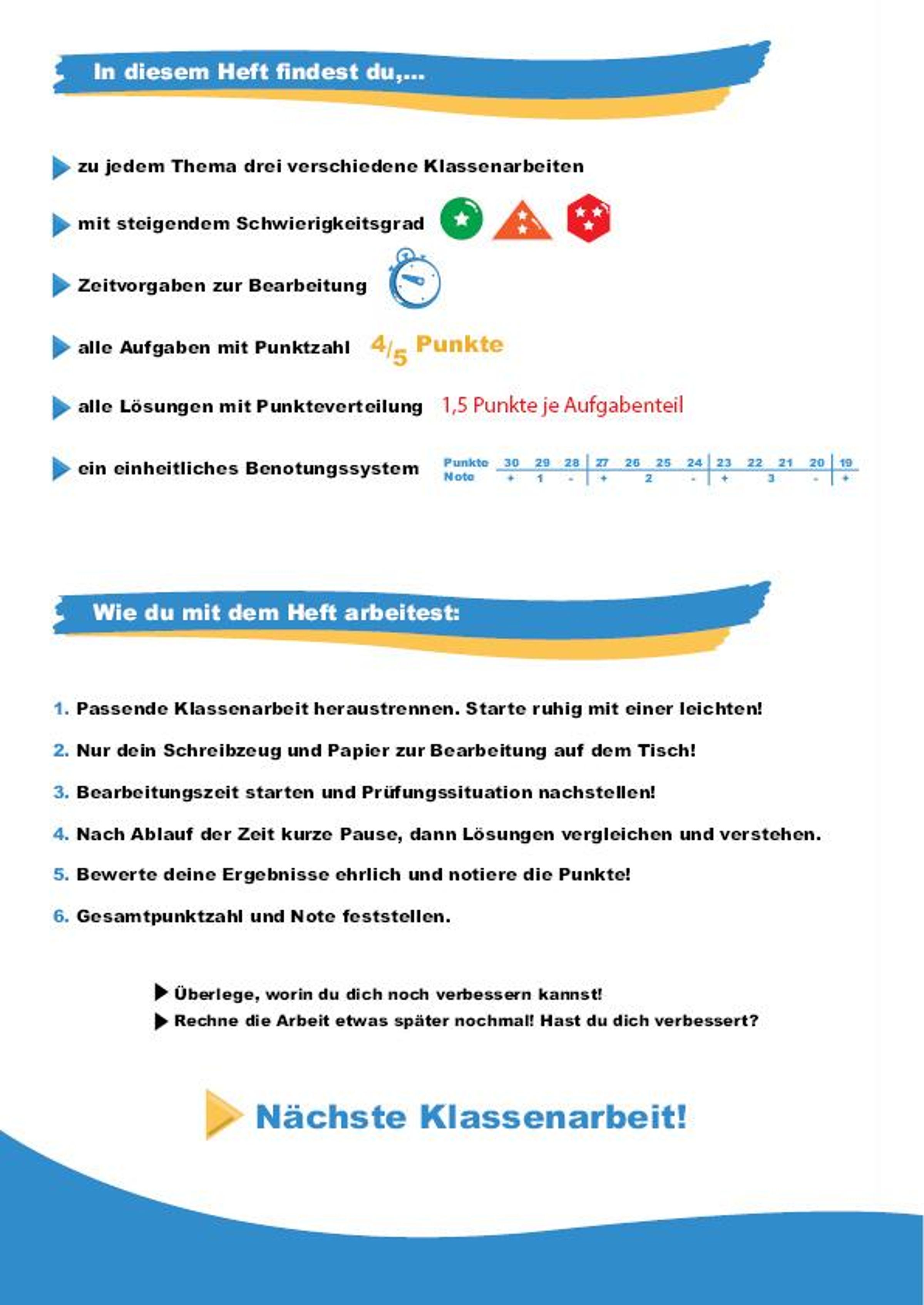 Dabei decken sie alle Themen einer Klasse ab und enthalten mehrere Klassenarbeiten je Thema zum Wiederholen und gezielt Vorbereiten - einfach die perforierten Seiten heraustrennen, Zeit stoppen, selbst benoten und erkennen, wo noch geübt werden muss. So können die nächste Klassenarbeit und das nächste Zeugnis kommen!