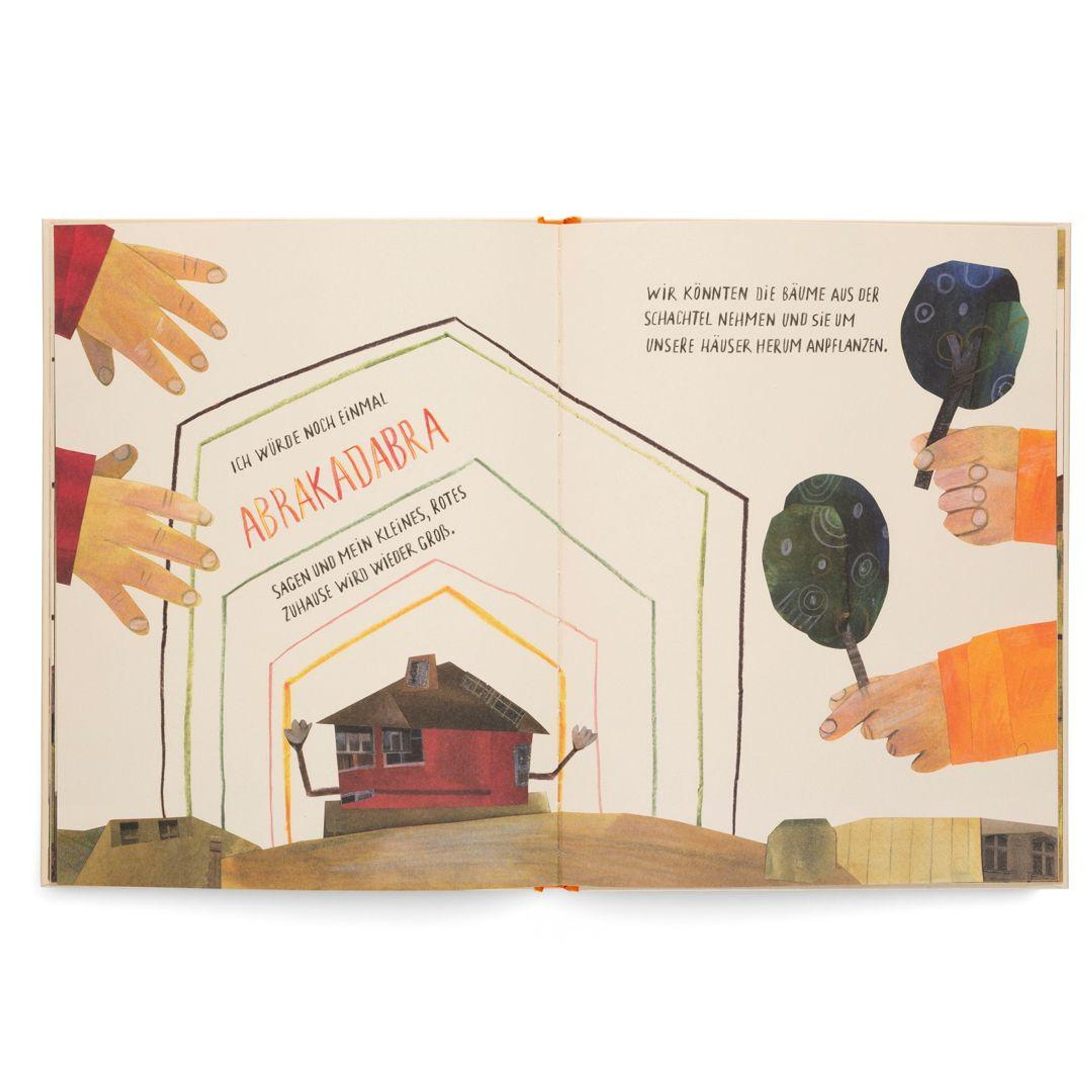 Zwei Kinder sind schon lange unterwegs. Mit Auto, Zug, Bus, Schiff und zu Fuß ziehen sie weiter - und tragen doch ihr Zuhause im Herzen. Sie träumen davon, ihr Haus mit einem Zauberspruch zu verkleinern, es in eine Tasche zu stecken und überallhin mitzunehmen. Oder es groß und stark werden zu lassen, damit es sie begleitet, beschützt und tröstet.
