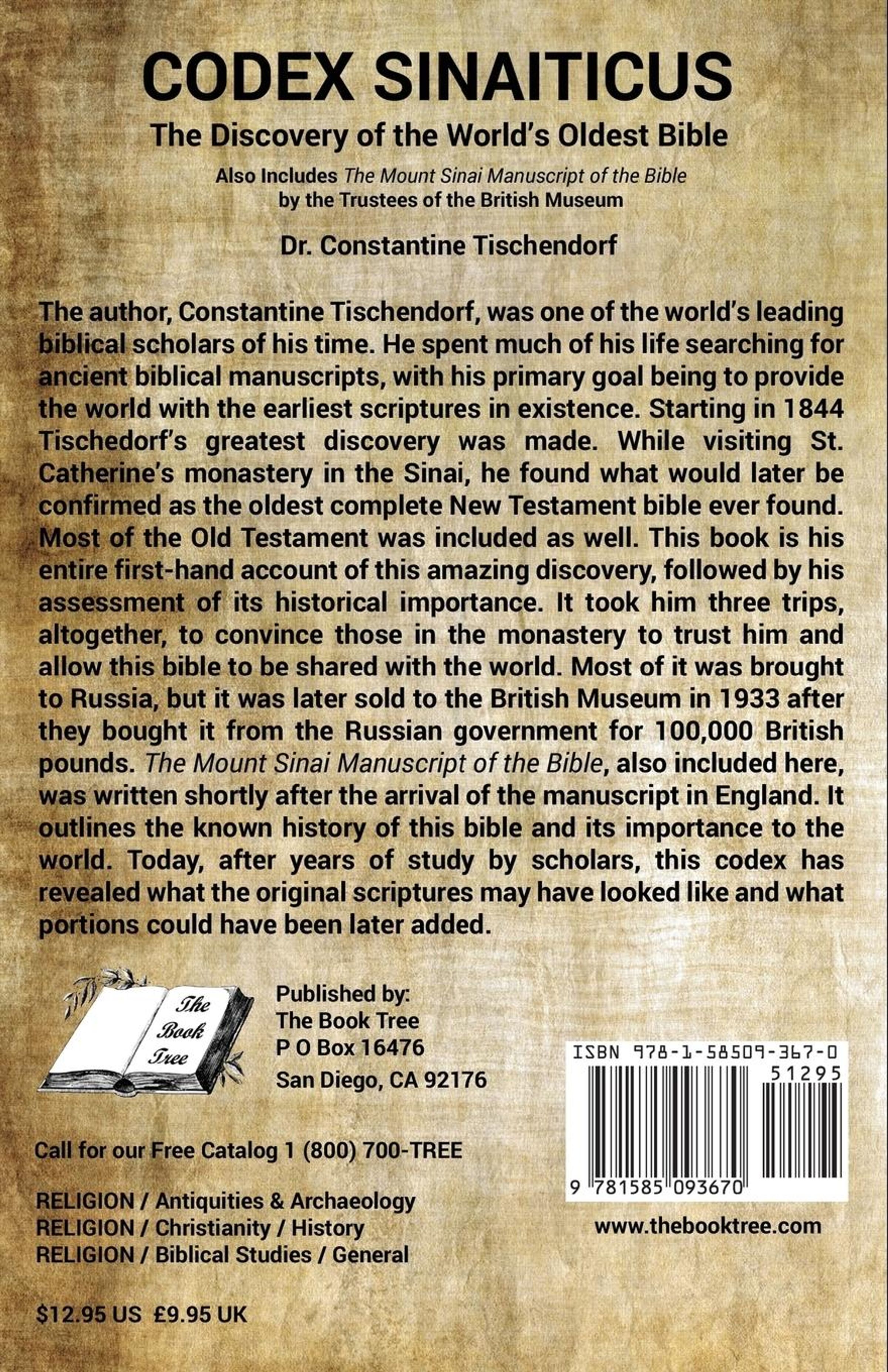 The author, Constantine Tischendorf, was one of the world's leading biblical scholars of his time. He spent much of his life searching for ancient biblical manuscripts, with his primary goal being to provide the world with the earliest scriptures in existence. Starting in 1844 Tischedorf's greatest discovery was made. While visiting St. Catherine's monastery in the Sinai, he found what would later be confirmed as the oldest complete New Testament bible ever found. Most of the Old Testament was included as well. This book is his entire first-hand account of this amazing discovery, followed by his assessment of its historical importance. It took him three trips, altogether, to convince those in the monastery to trust him and allow this bible to be shared with the world. Most of it was brought to Russia, but it was later sold to the British Museum in 1933 after they bought it from the Russian government for 100, 000 British pounds. The Mount Sinai Manuscript of the Bible, also included here in this Book Tree published edition, was written shortly after the arrival of the manuscript in England. It outlines the known history of this bible and its importance to the world. Today, after years of study by scholars, this codex has revealed what the original scriptures may have looked like and what portions could have been later added.