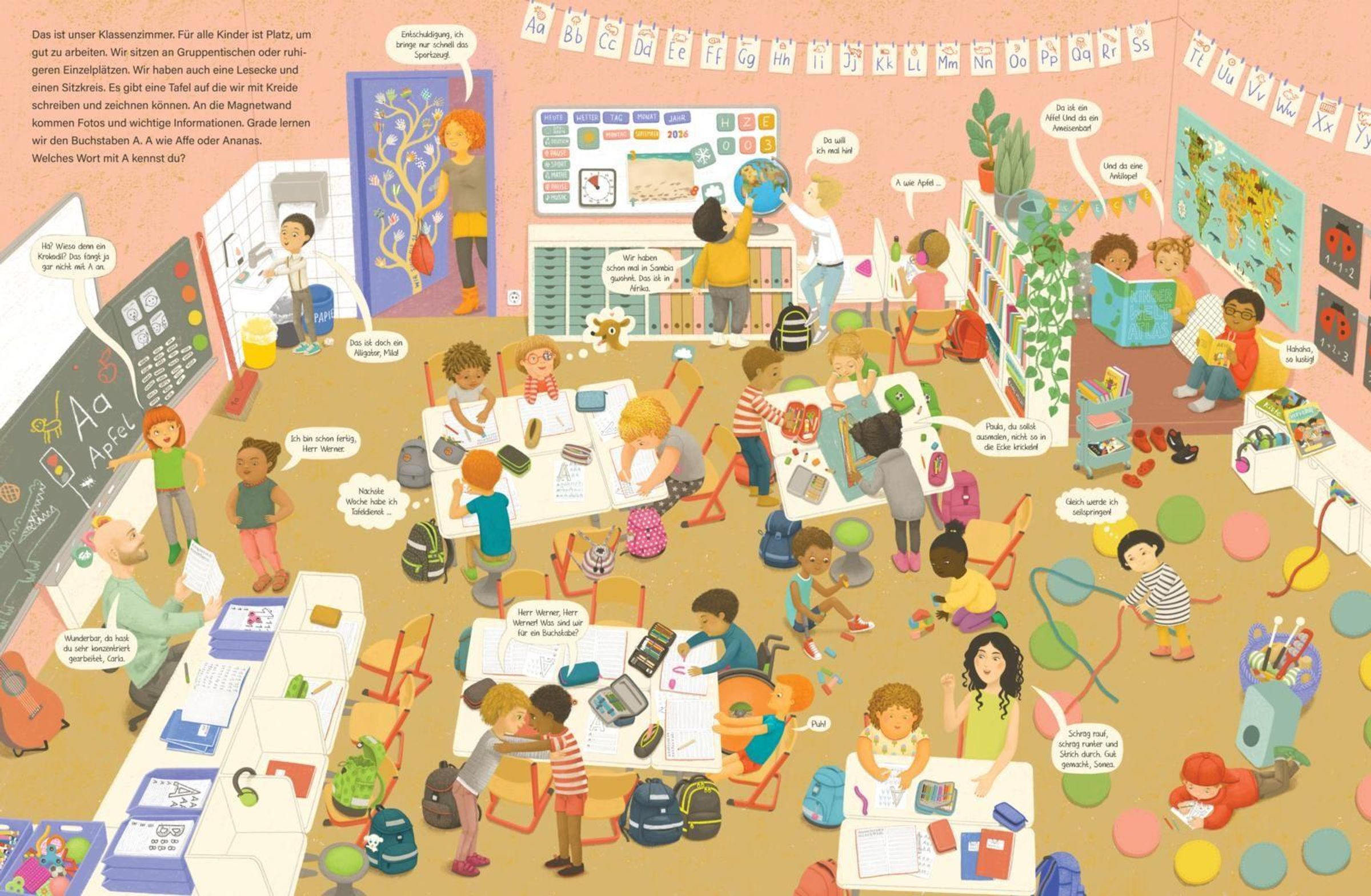 Denn mit Alva, Enes, Paula, Wahab, Elias, Rudi, Sonea und all den vielen anderen Kinder der Klasse 1A wird der Alltag in der Grundschule auf unendlich vielfältige Art und Weise greifbar, nahbar und reflektierbar. Hier taucht alles auf: von Klassenraum und Pausenhof bis Schulgarten und Sporthalle, von Buchstaben und Zahlen bis Tafel, Leseecke und Gehörschutz, von Fundkiste, Klos und Lehrerzimmer bis Sanitätstasche, Mensatablett und Streitschlichter ...