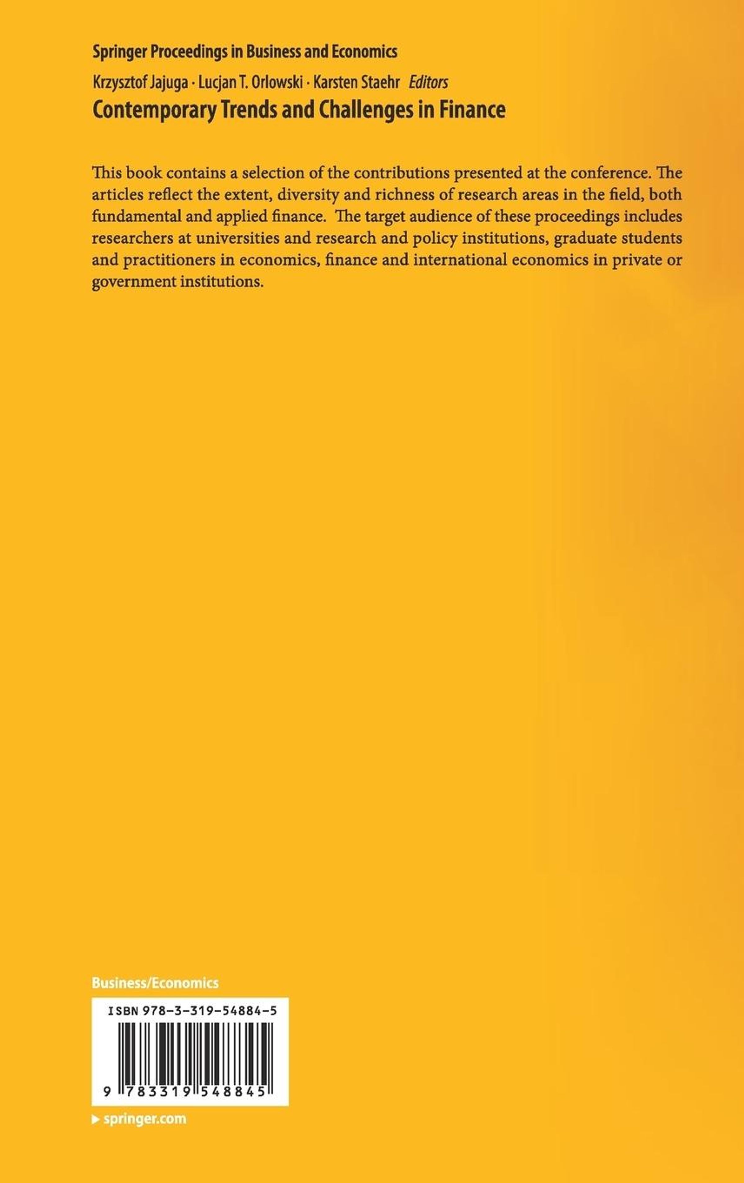 This book contains a selection of the contributions presented at the conference. The articles reflect the extent, diversity and richness of research areas in the field, both fundamental and applied finance. The target audience of these proceedings includes researchers at universities and research and policy institutions, graduate students and practitioners in economics, finance and international economics in private or government institutions.