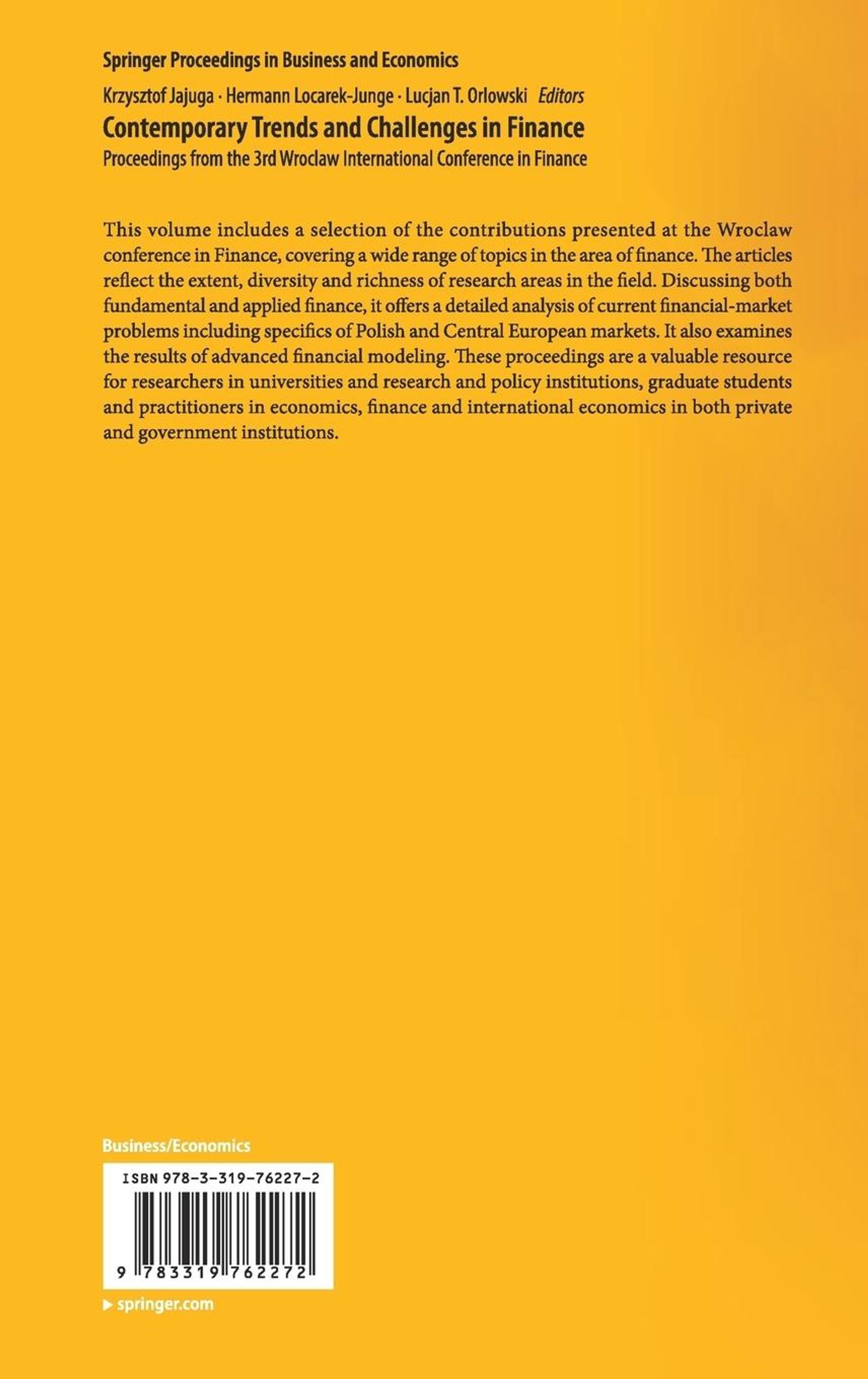 This volume includes a selection of the contributions presented at the Wroclaw conference in Finance, covering a wide range of topics in the area of finance. The articles reflect the extent, diversity and richness of research areas in the field. Discussing both fundamental and applied finance, it offers a detailed analysis of current financial-market problems including specifics of Polish and Central European markets. It also examines the results of advanced financial modeling. These proceedings are a valuable resource for researchers in universities and research and policy institutions, graduate students and practitioners in economics, finance and international economics in both private and government institutions.