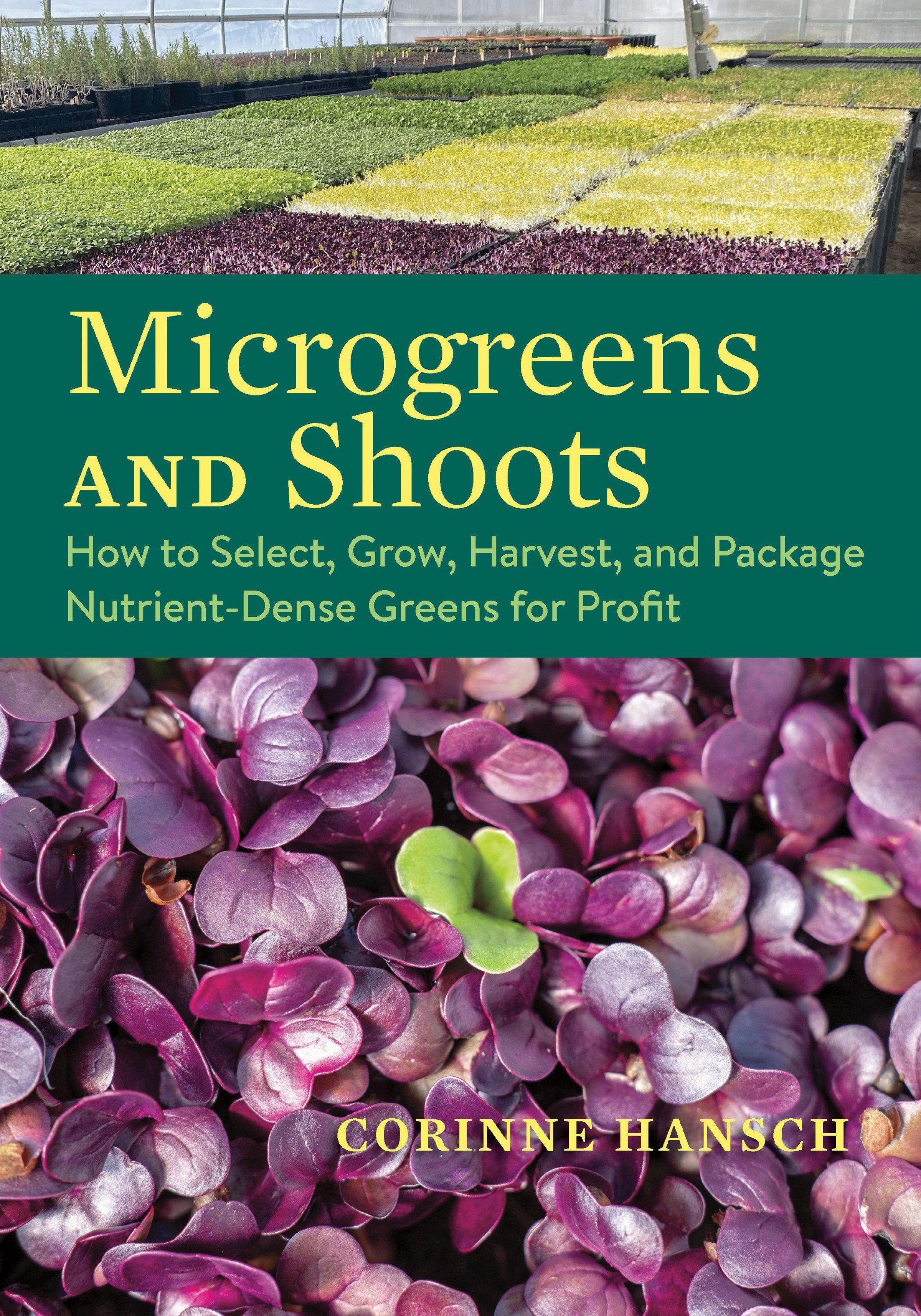 "Microgreens and Shoots: How to Select, Grow, Harvest, and Package Nutrient-Dense Greens for Profit" von "Corinne Hansch". Oben ein Feld mit Microgreens, unten eine Nahaufnahme von lilafarbenen Blättern., Buch