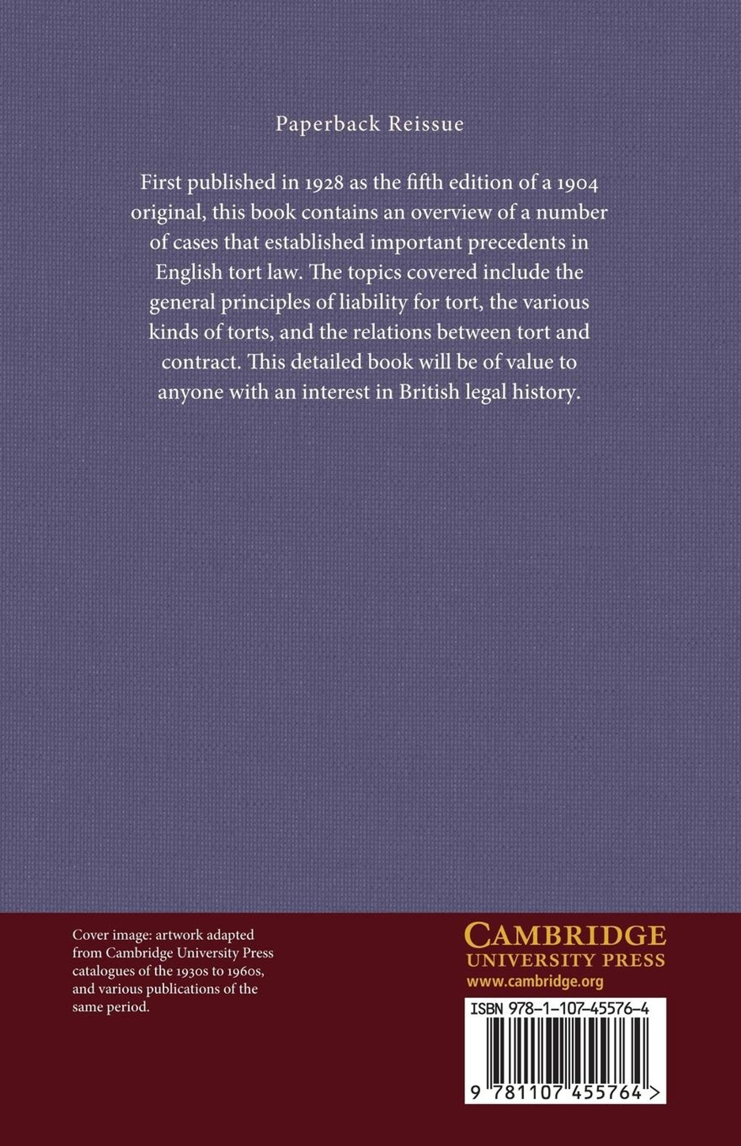 First published in 1928 as the fifth edition of a 1904 original, this book contains an overview of a number of cases that established important precedents in English tort law. The topics covered include the general principles of liability for tort, the various kinds of torts, and the relations between tort and contract. This detailed book will be of value to anyone with an interest in British legal history.