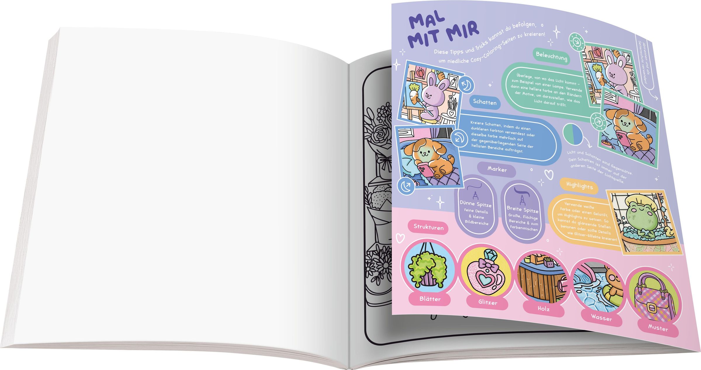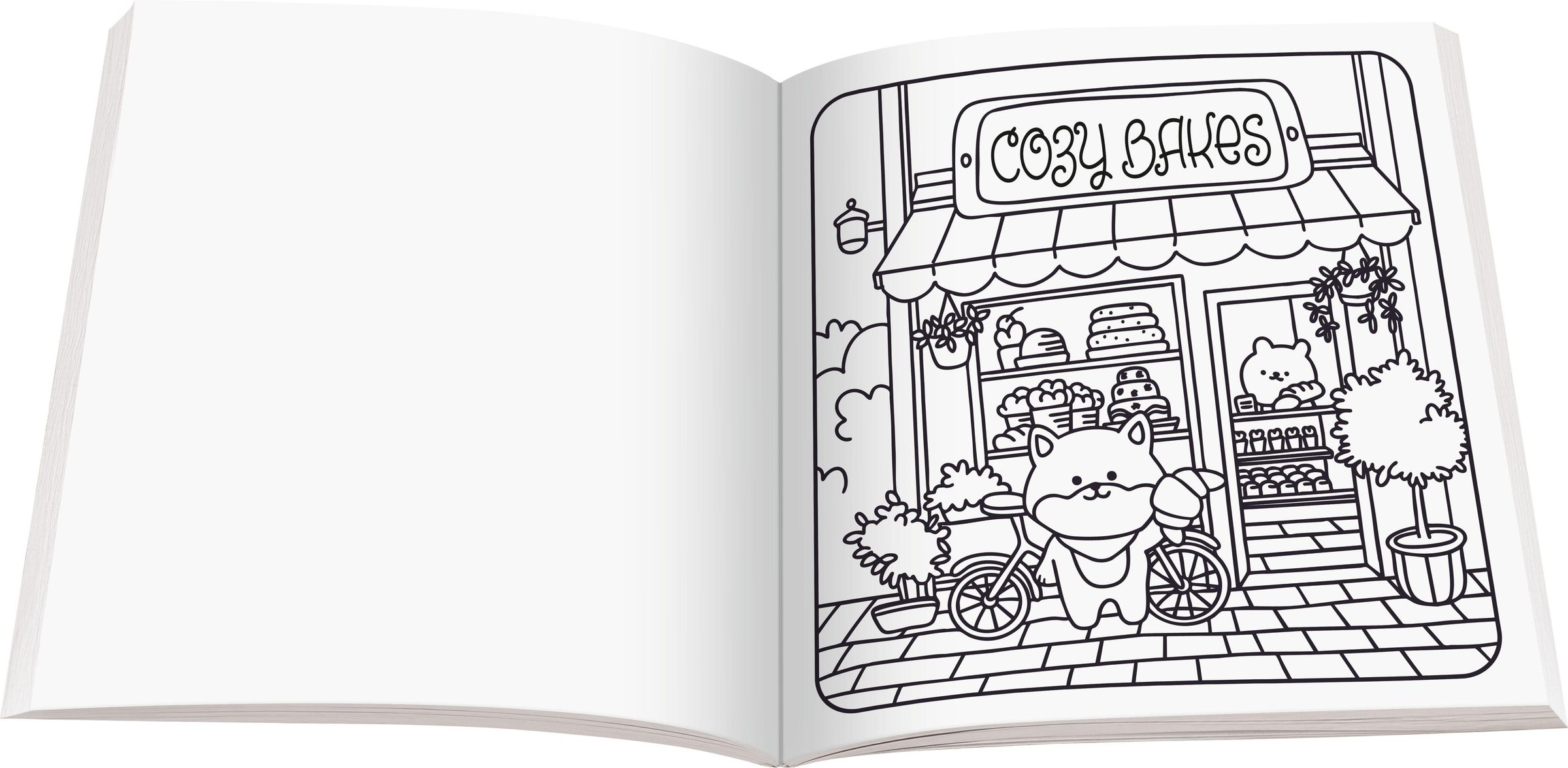 „Cozy Coloring Around Town“ in großen Buchstaben. Illustration: Bäckerei mit niedlichen Tieren und bunter Fassade., Buch