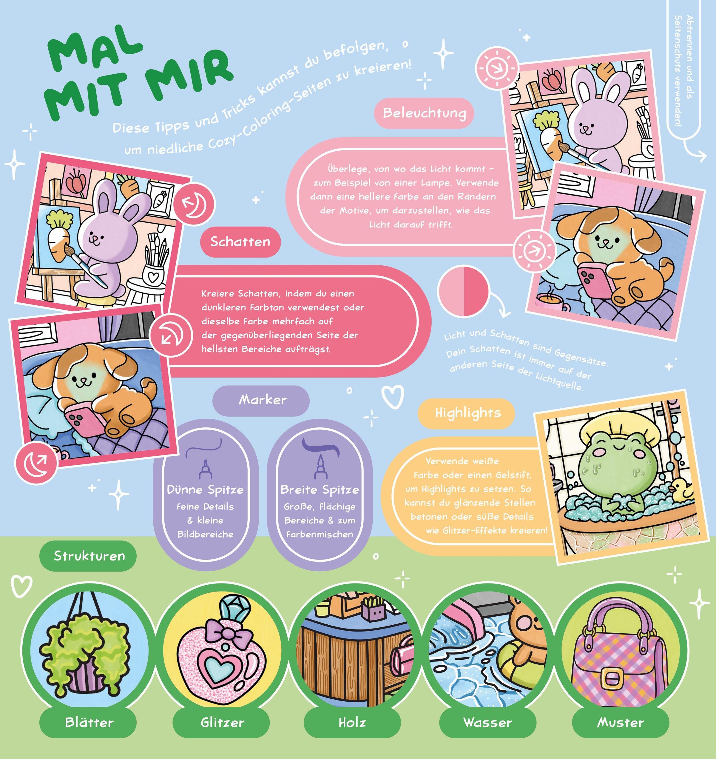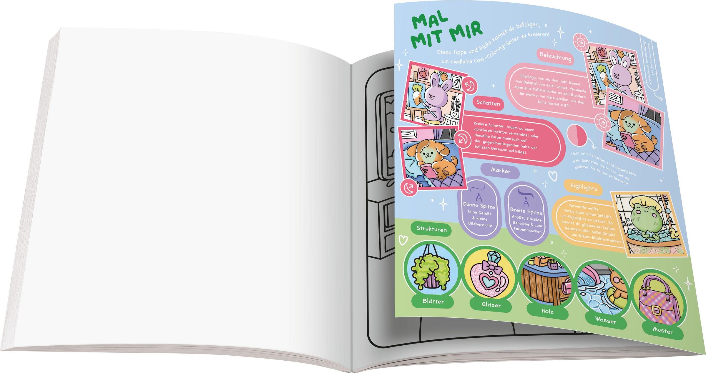 Kreative Auszeit gesucht? 64 liebevoll gestaltete Ausmalmotive laden zum Entspannen ein und rücken die kleinen Dinge des Lebens in den Fokus, wie das Frühstücken im Bett, den gemütlichen Lesenachmittag oder das Abschalten beim Musikhören. Eine Ausklappseite gibt Tipps, wie die Motive mit Mustern und Details kreativ ausgemalt werden können. Das extradicke Papier und die perforierte Ausklappseite sorgen dafür, dass die Stifte nicht durchdrücken. Einfach losmalen und Wohlfühlmomente schaffen.