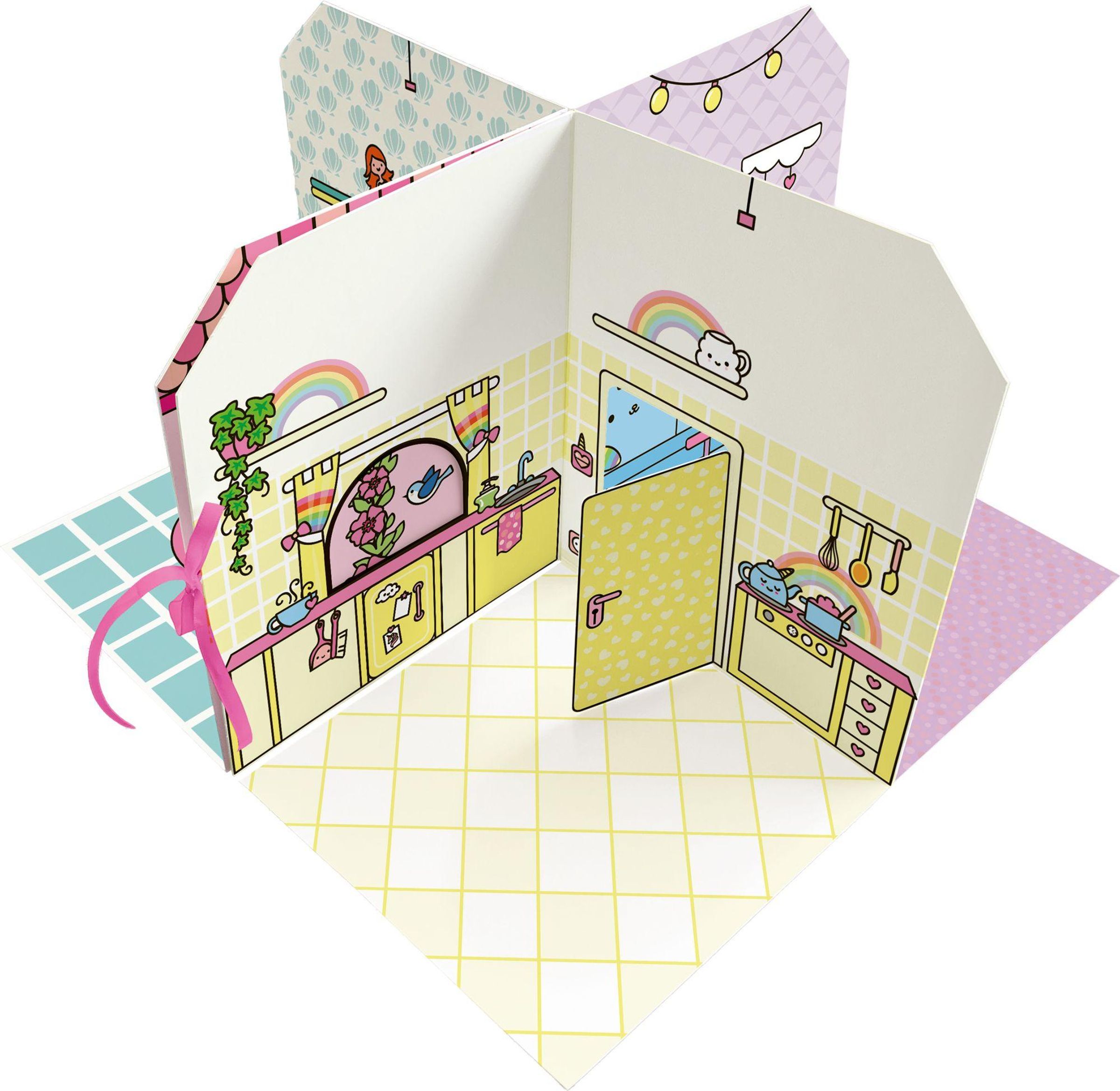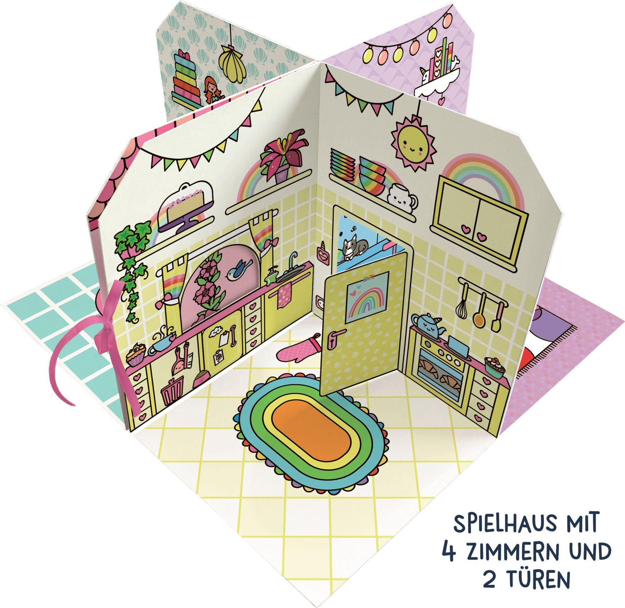 Ein kreatives Stickerhaus zum Gestalten und Spielen · Ausklappbares Haus mit 4 Zimmern und liebevollen Details · Über 60 bemalbare, wiederablösbare Sticker · Mit Einhorn-Spielfigur, 2 Türen und 1 Fenster · Kreatives Spiel- und Bastelset für Kinder ab 4 Jahren Dieses Cozy Stickerhaus verbindet Ausmalen, Stickern und fantasievolles Spielen. Mit 60 bemalbaren Stickern, einer Einhorn-Figur, zwei Türen und einem Fenster können Kinder Küche, Bad, Wohn- und Schlafzimmer nach eigenen Ideen gestalten oder sich an den Beispielbildern orientieren. Kurze Vorlesetexte entführen in die gemütliche, regenbogenbunte Welt des kleinen Einhorns. Ein wundervolles Geschenk zum Basteln, Lesen und Spielen für Kinder ab 4 Jahren.