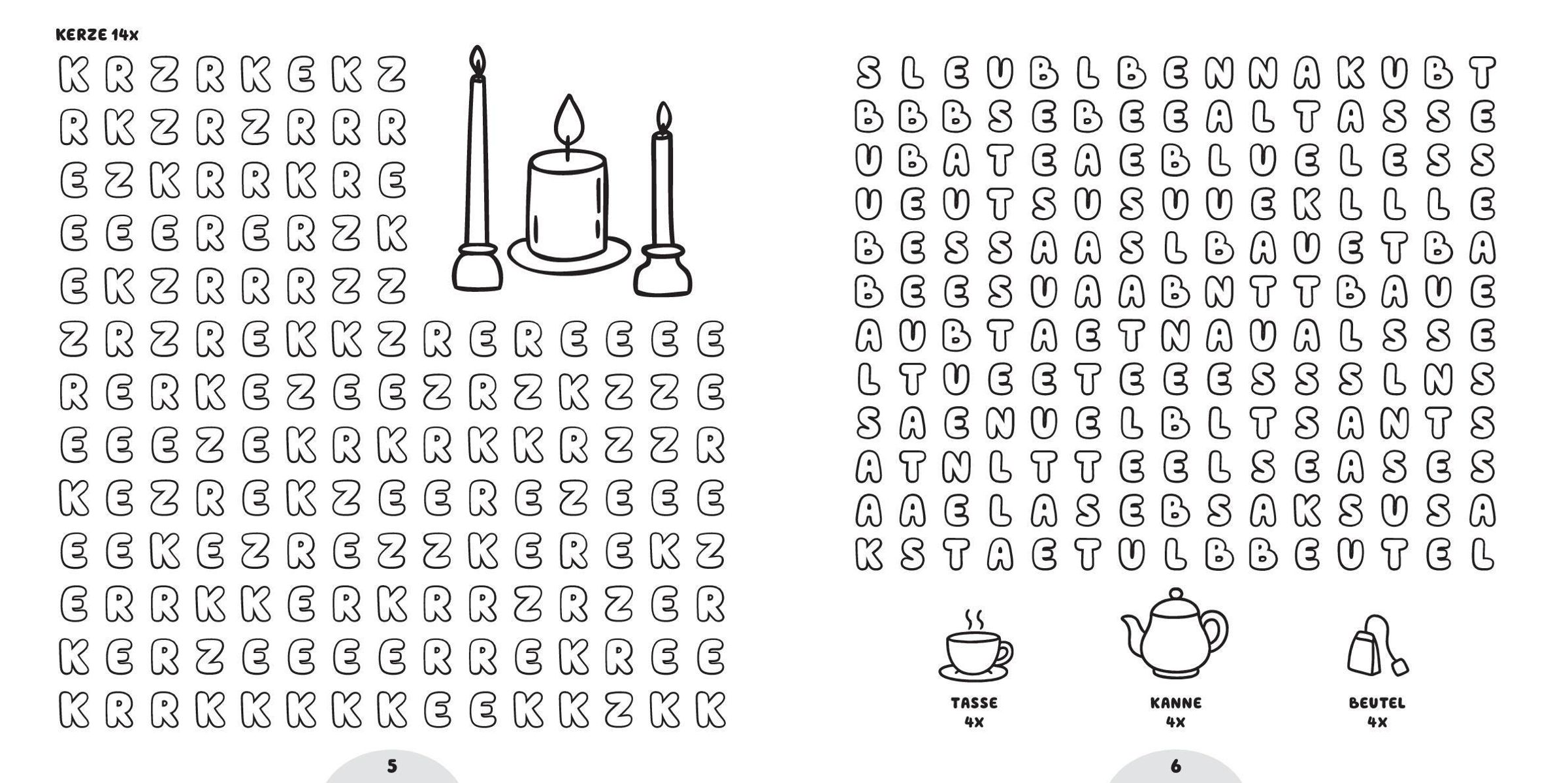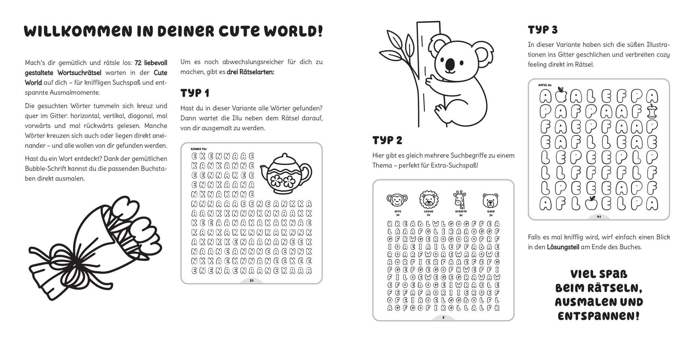 Wortsuchrätsel einmal anders! Bei Cozy Word Search Cute Worldtrifft jede Menge Rätselspaß auf herrlich entspannendes Ausmalen. Anhand der abgebildeten niedlichen Illustrationen müssen die entsprechenden Begriffe im Wortgitter gefunden werden. Das Tolle daran: Alle Illustrationen und Buchstaben sind so gestaltet, dass sie sich wunderbar ausmalen lassen. So wird aus jedem gelösten Rätsel ganz nebenbei ein kleines Kunstwerk.