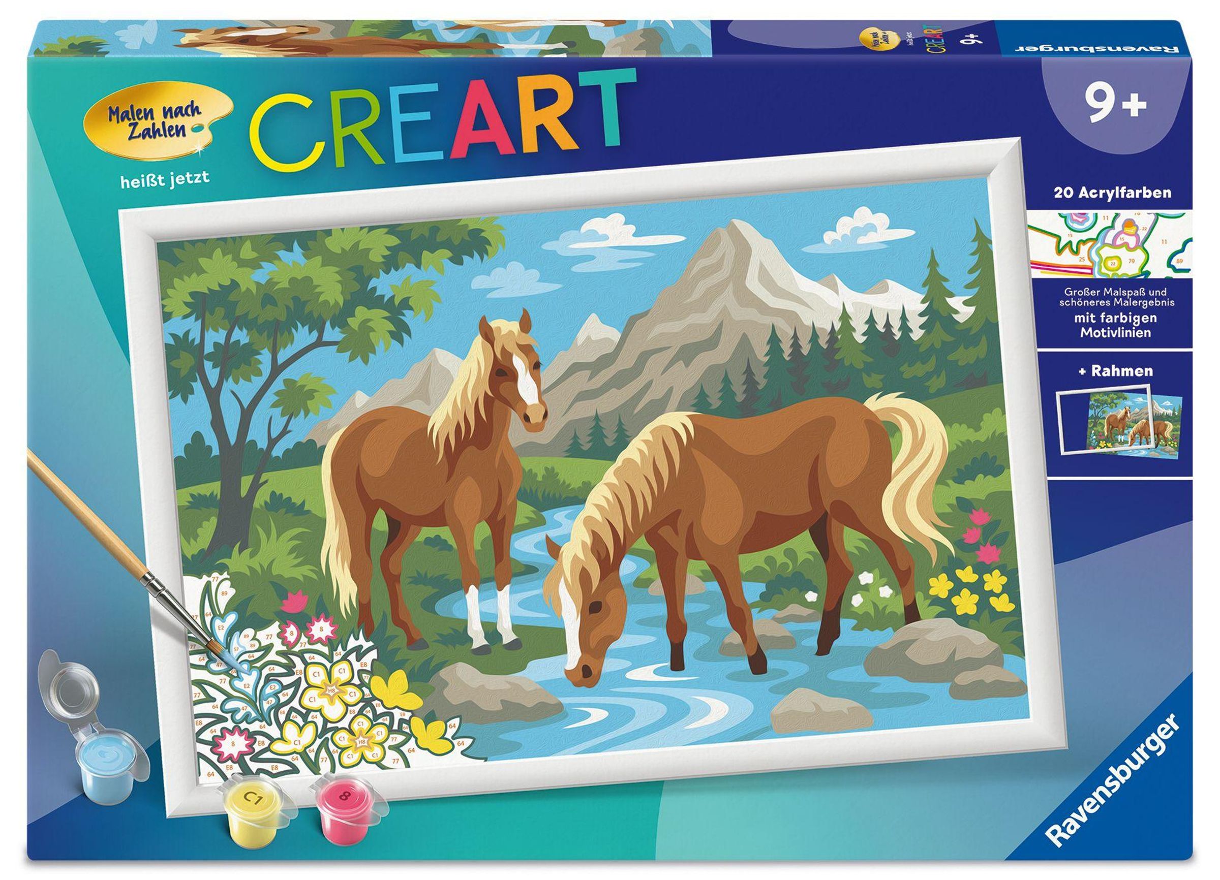 Farbige Motivlinien: Größerer Malspaß & ein schöneres Ergebnis! Dank der farbigen Motivlinien, können die Kinder das ganze Motiv Pferde im Wasser und die Farben schneller erkennen. Der Pinsel hat eine gute Führung und so entsteht ein perfektes Bild. Die schönen Motive zum Ausmalen sind eine tolle Geschenkidee für Kinder ab 9 Jahren und eine schöne Dekoration. In diesem Malset sind bereits 20 fertig gemischte Acrylfarben enthalten. Verpackungsdesign kann abweichen. Mit Malen nach Zahlen von Ravensburger lernen die Kinder Flächen sorgfältig auszumalen, ihr Maltalent zu verbessern sowie feinmotorische Fähigkeiten zu entwickeln. Am Ende stehen Freude, Stolz und ein Erfolgserlebnis, das die Lust am Weitermalen weckt. Die Motive sind altersgerecht in drei Schwierigkeitsstufen umgesetzt: von einfachen Bildern mit wenigen, großen Malflächen bis hin zu Bildern mit vielen, kleinen Malflächen für Fortgeschrittene. Jedes Malset enthält alles, was Künstler zum Malen brauchen und es ist kein Mischen der Farben notwendig. Das Ravensburger Malen nach Zahlen Programm bietet eine große Motivauswahl für Kinder und Erwachsene.
