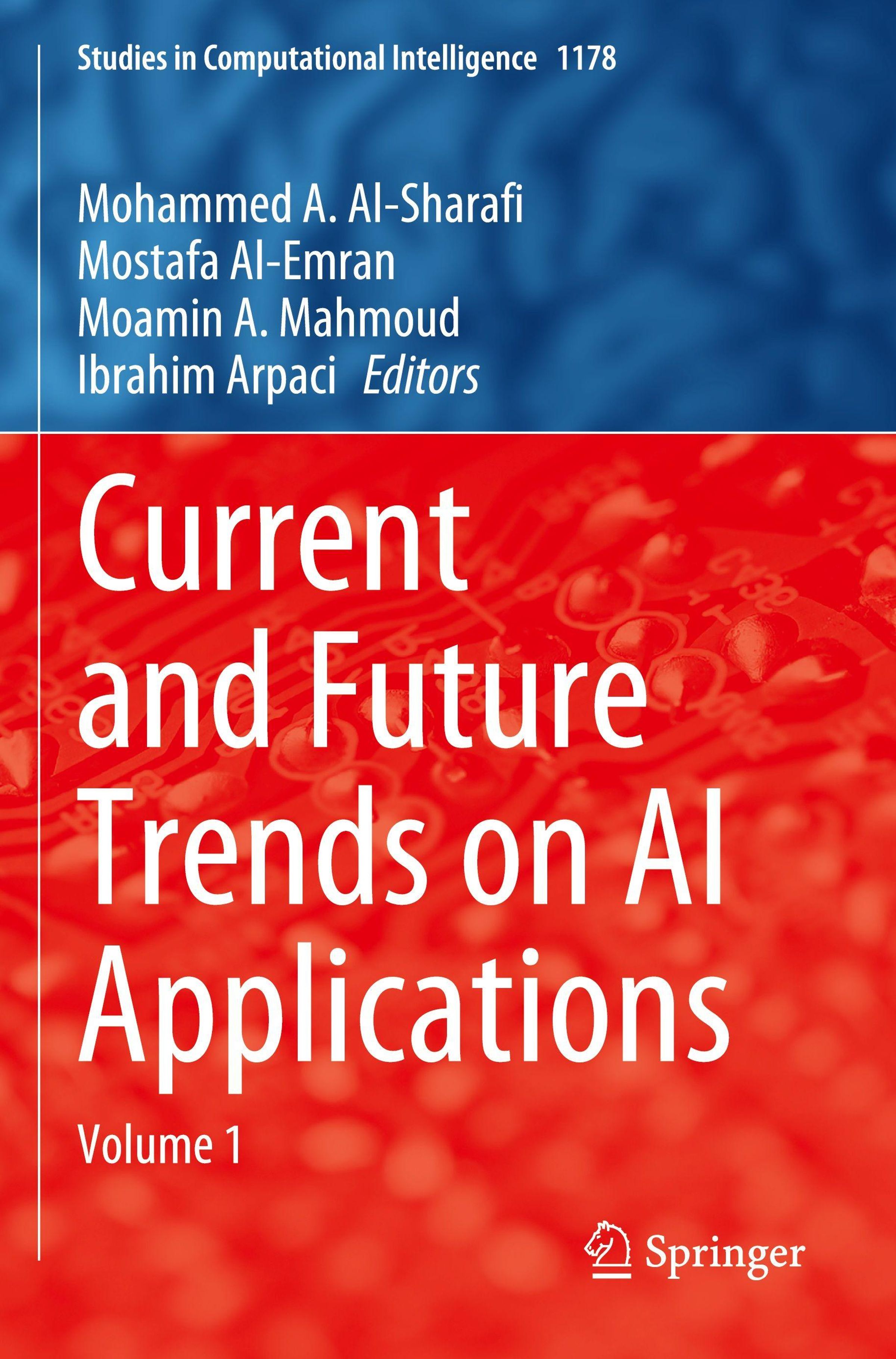 Fachbuchcover mit Texten: "Current and Future Trends on AI Applications, Volume 1". Oben blaue und unten rote Hintergrundgrafik., Buch