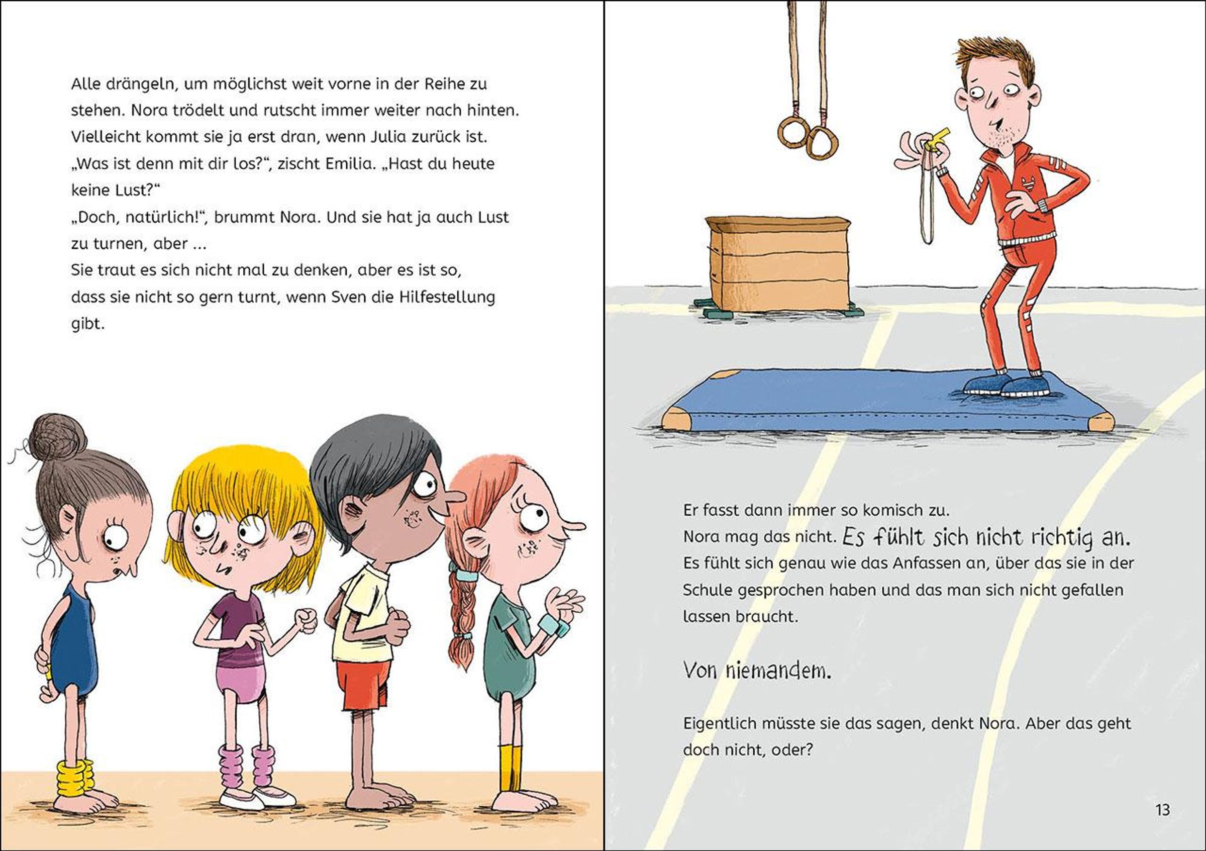 Mein Körper gehört mir - auch im Sport! Nora liebt Turnen. Ihr neuer Trainer Sven sagt, sie habe großes Talent! Aber wenn er ihr Hilfestellung gibt, fühlt sich das nicht richtig an. Er fasst dann immer so komisch zu. Eigentlich müsste sie jemandem davon erzählen - doch sie hat Angst, dass sie dann keiner mehr mag ... Ist das okay? Missbrauch von und sexualisierte Gewalt gegen Kinder findet größtenteils in ihrem unmittelbaren Umfeld statt. Häufig passiert das auch im Sportverein. Auf behutsame Weise gibt dieses Buch kindgerechte Tipps für das richtige Verhalten in schwierigen Situationen und für einen offenen Umgang mit diesem wichtigen Thema - damit Kinder früh lernen, ihre Grenzen zu erkennen, sie zu setzen und sich Hilfe zu holen.