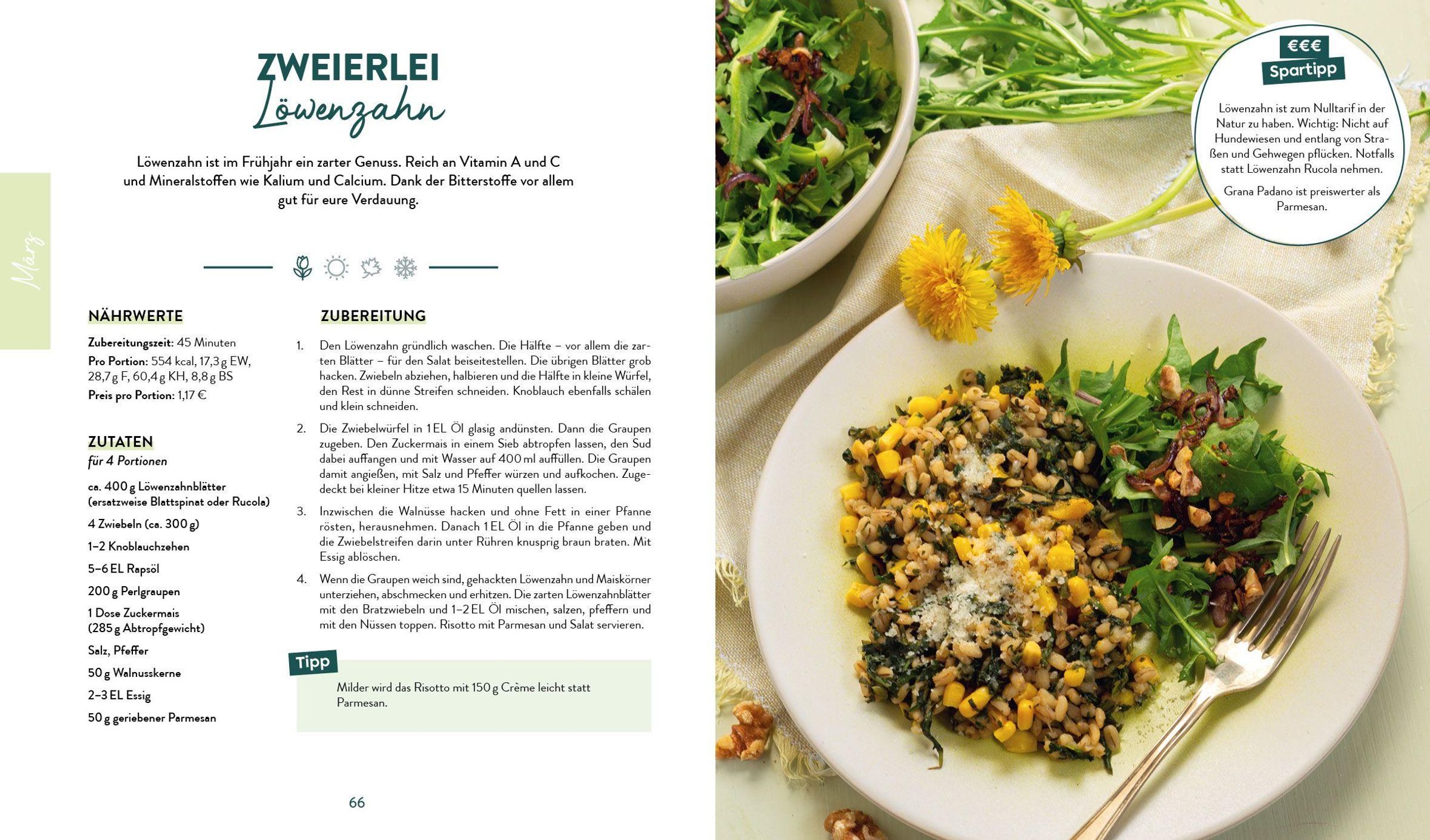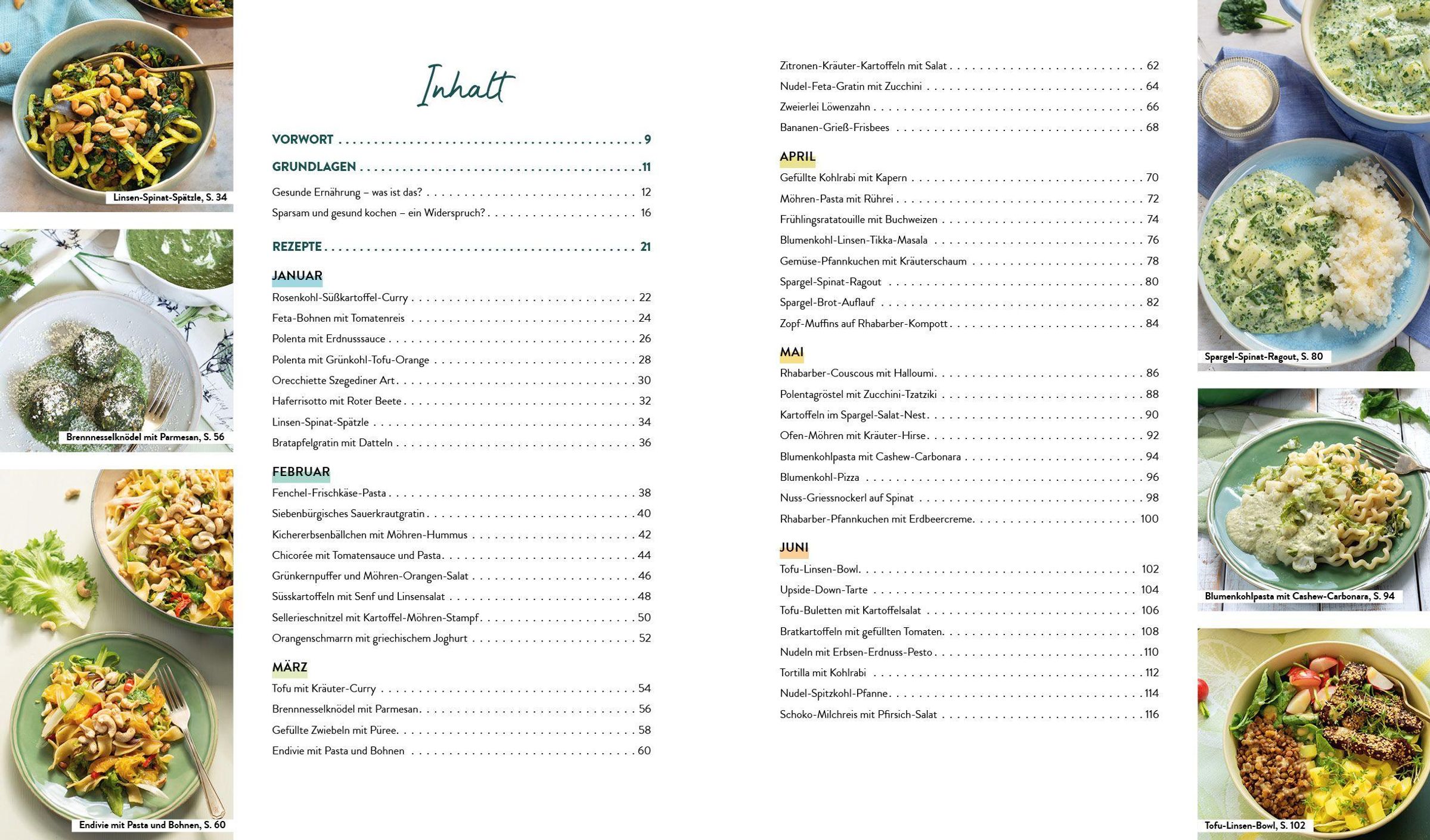 Welche Kräuter und Gewürze sich wodurch ersetzen lassen, zeigt eine Übersicht am Ende des Buches. Ein Saisonkalender zeigt außerdem, welche Obst- und Gemüsesorten wann besonders preiswert sind. Auberginen im Angebot? Großartig! Dann schnell im Register nach passenden Rezepten schauen und loslegen! Oder auch mal Lust auf Süßes? Unter den acht Rezeptideen jedes Monats findet sich immer auch eine Süße!