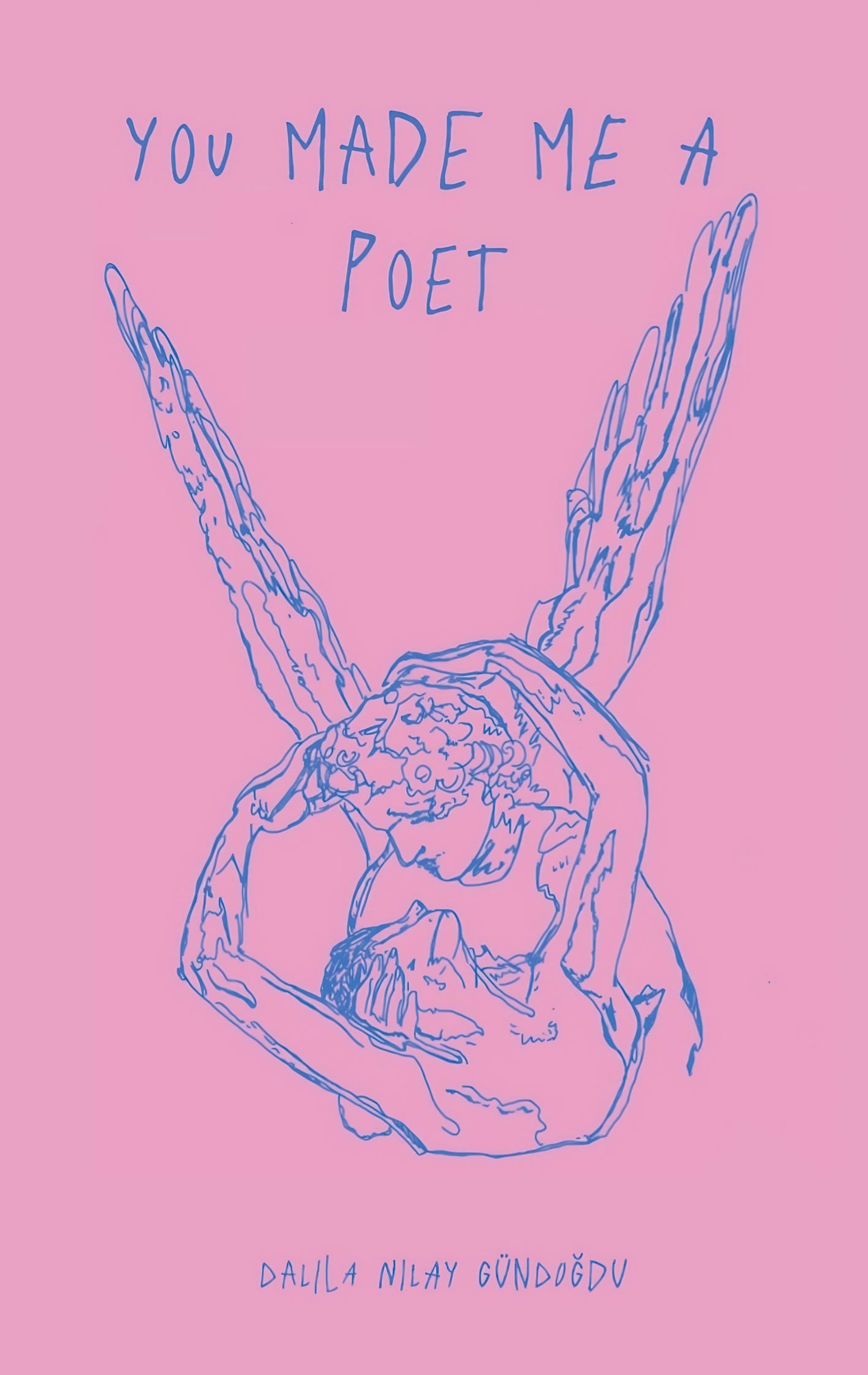 "YOU MADE ME A POET" und "DALILA NILAY GÜNDOĞDU" auf rosa Hintergrund. Illustration zweier umarmender Figuren mit Flügeln., Buch