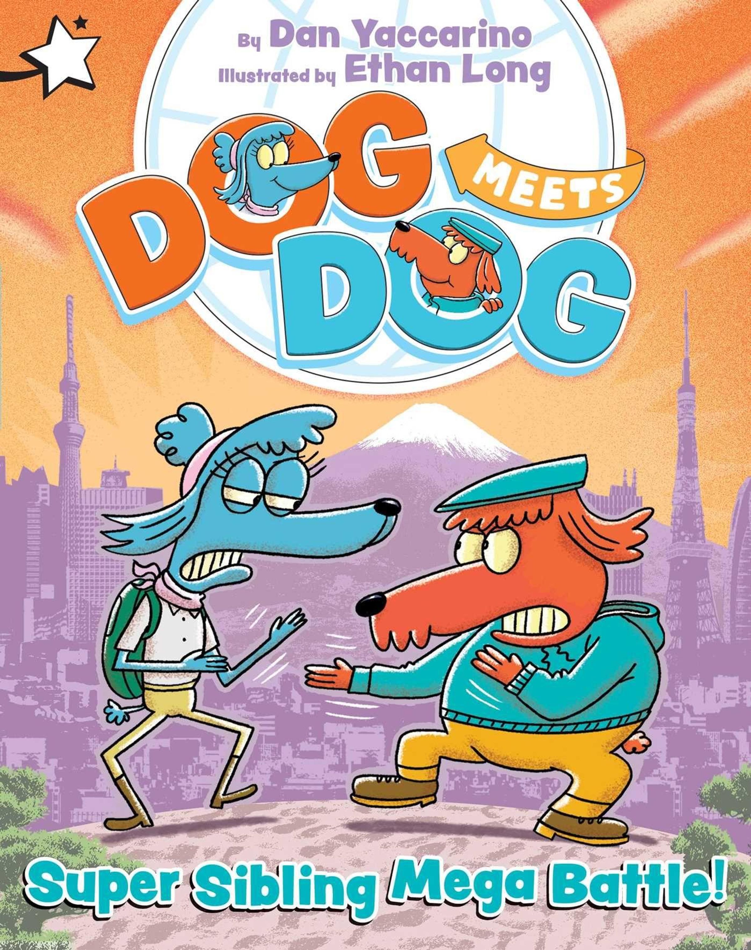 "Super Sibling Mega Battle!" Illustration zweier cartoonartiger Hunde in Tokio mit Fuji im Hintergrund., Buch